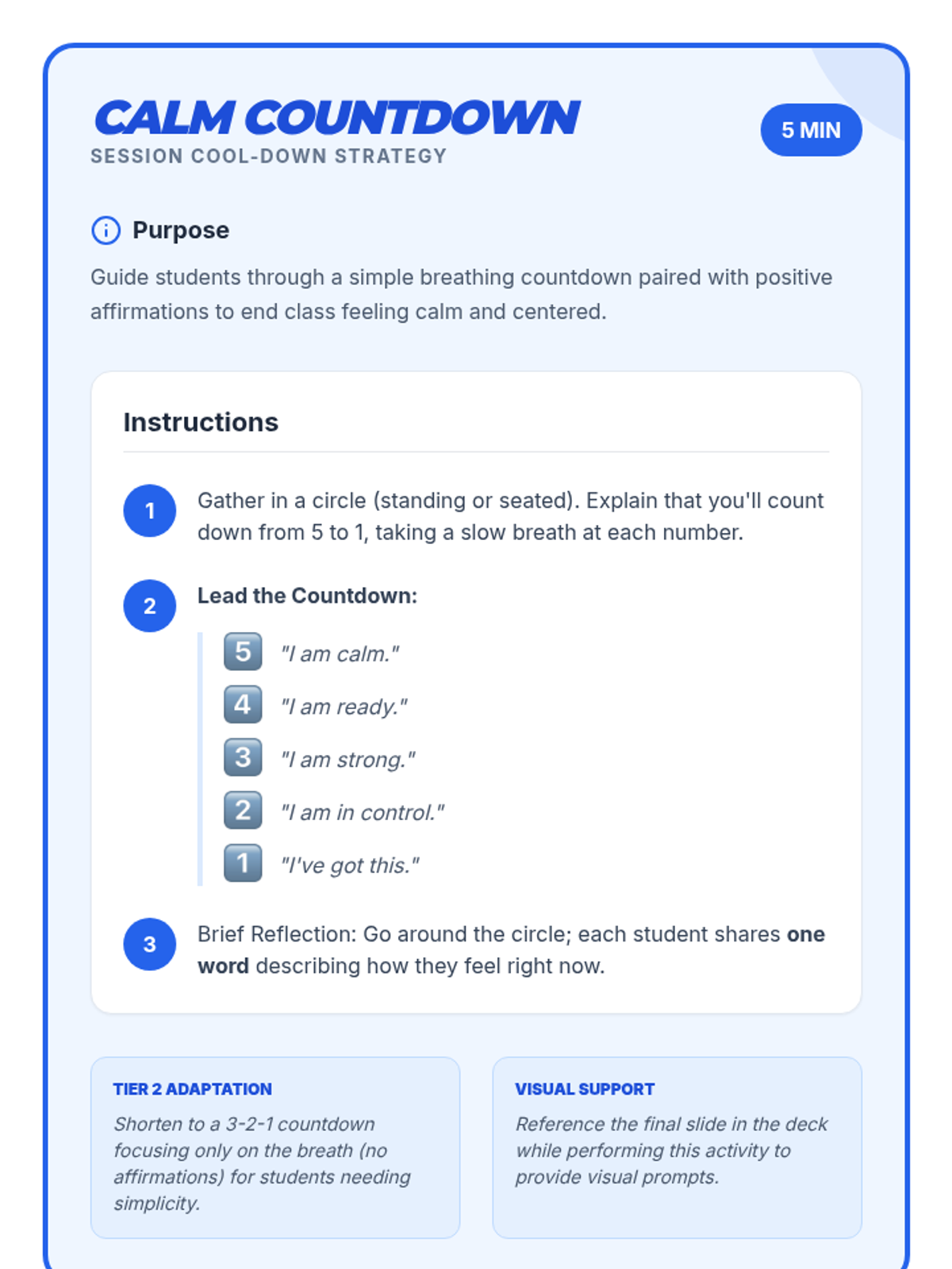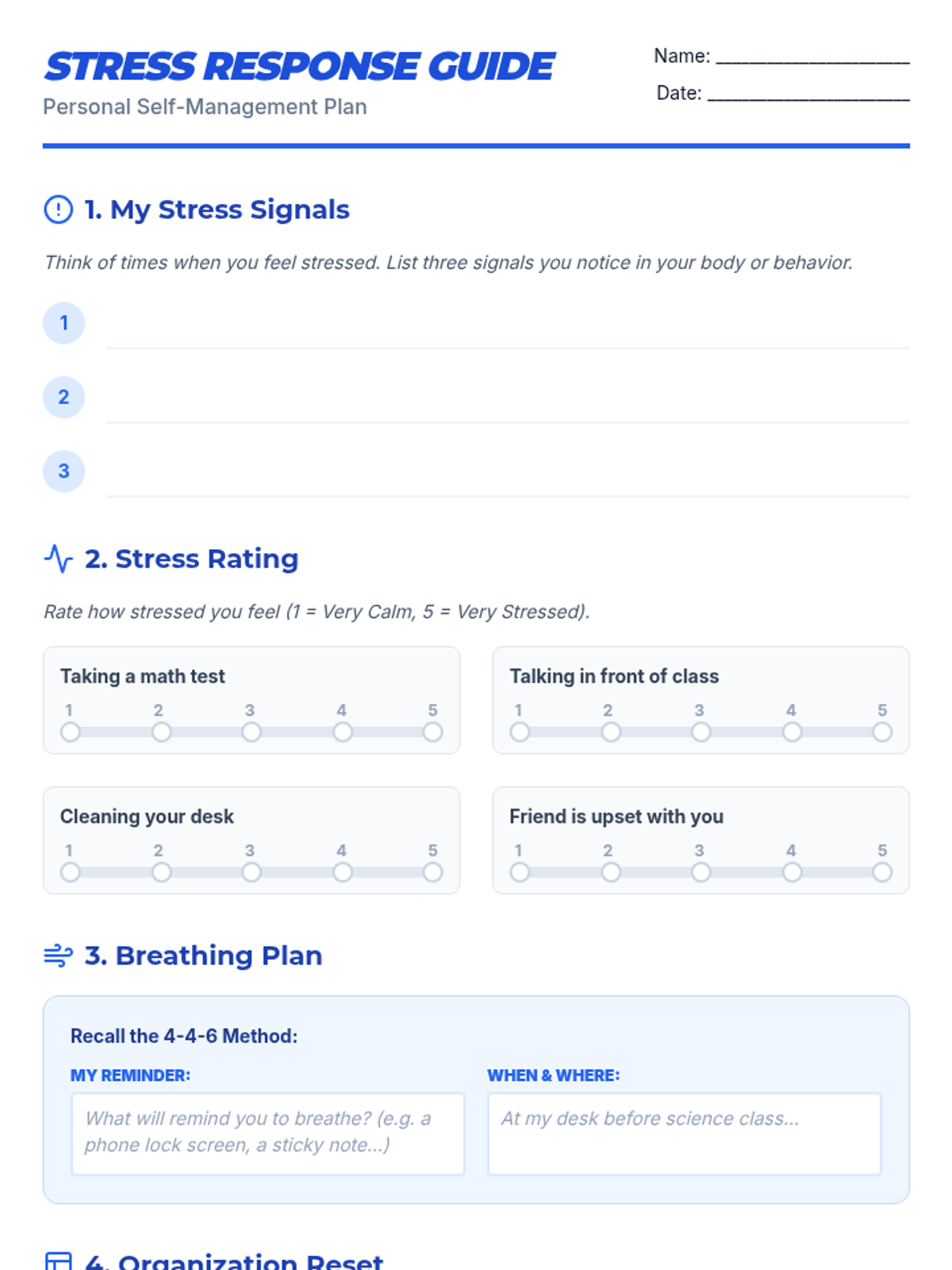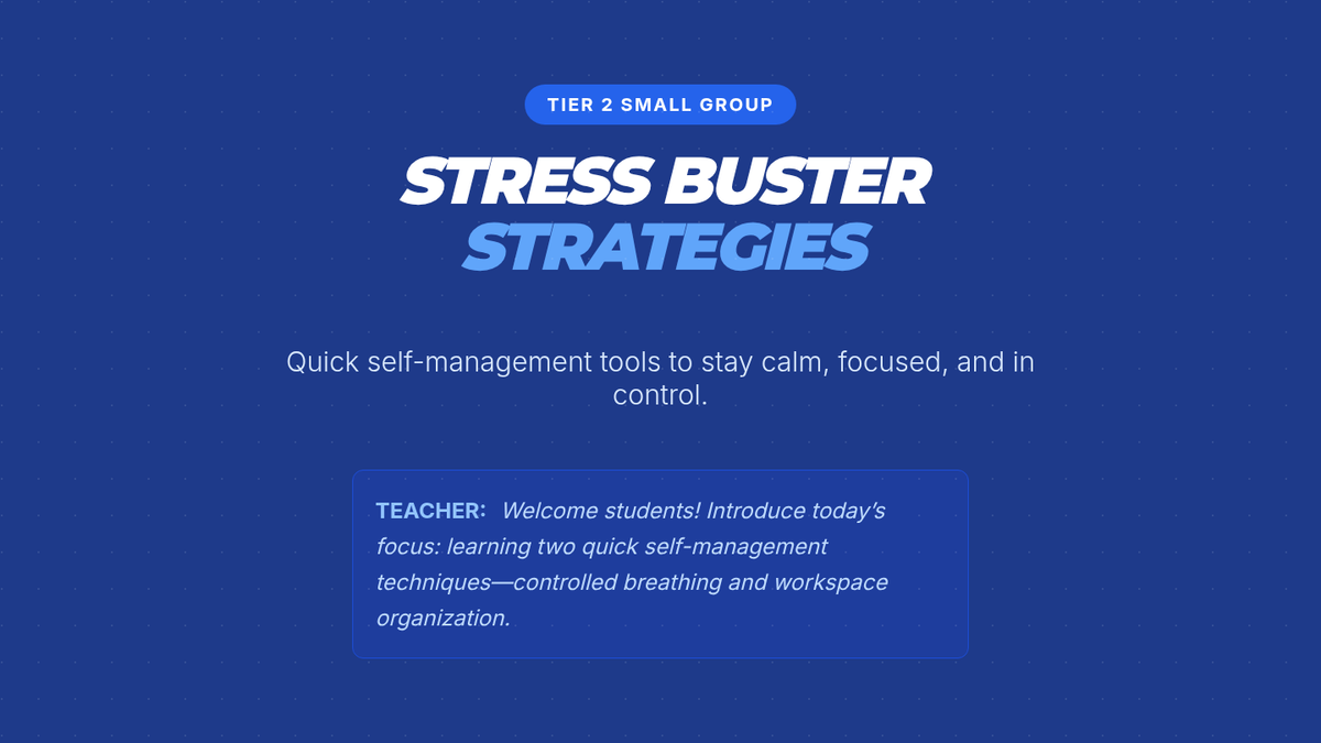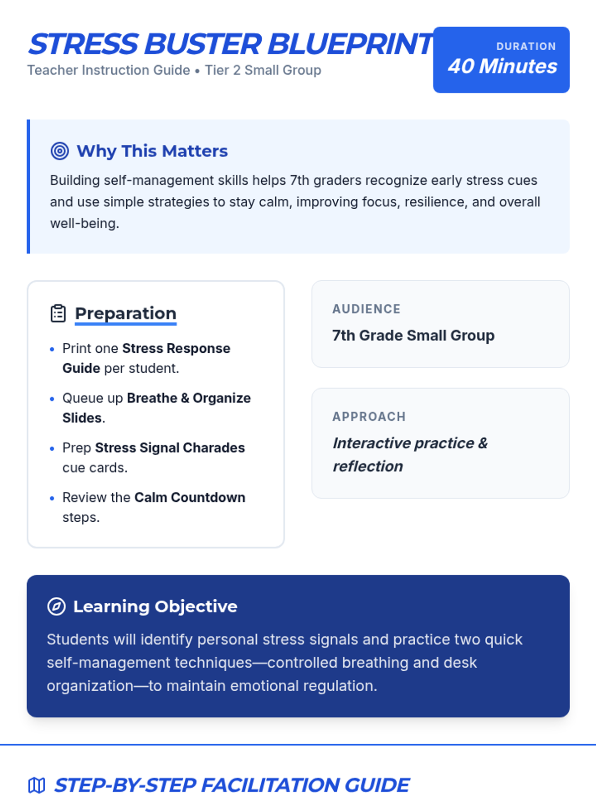 A small-group lesson for 7th graders focusing on identifying personal stress signals and practicing quick self-management techniques like breathing and organization.