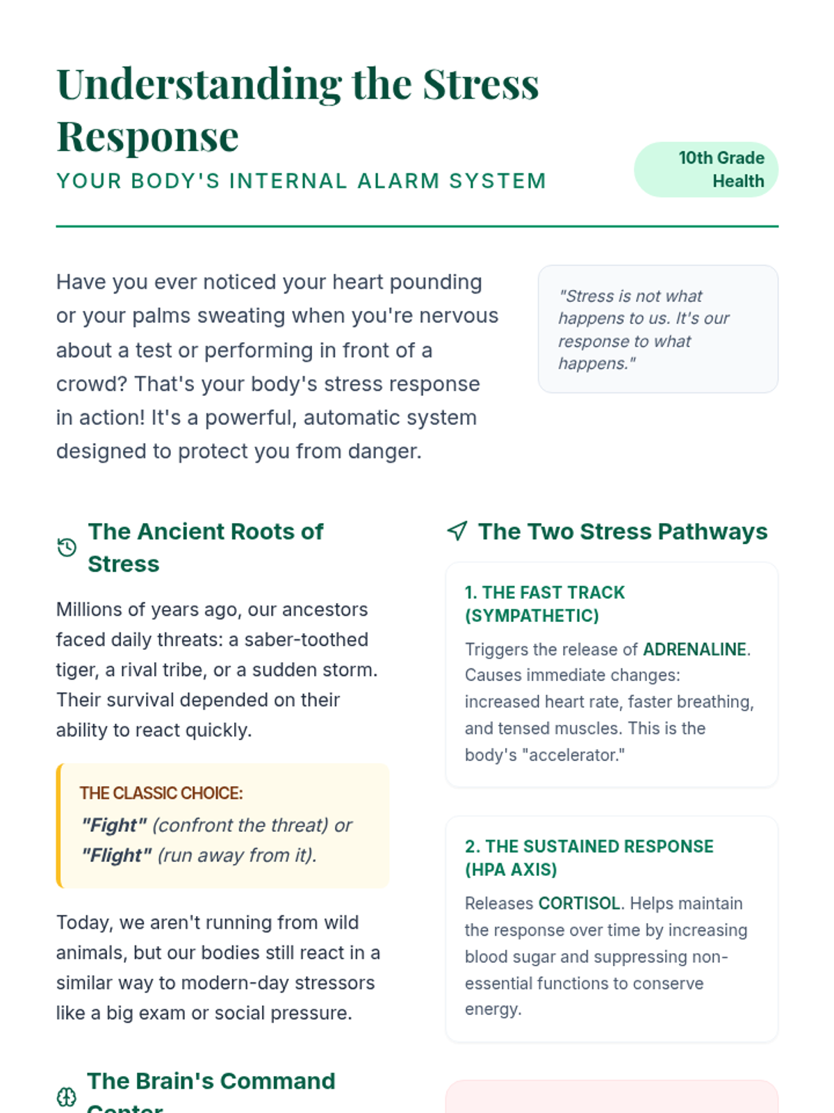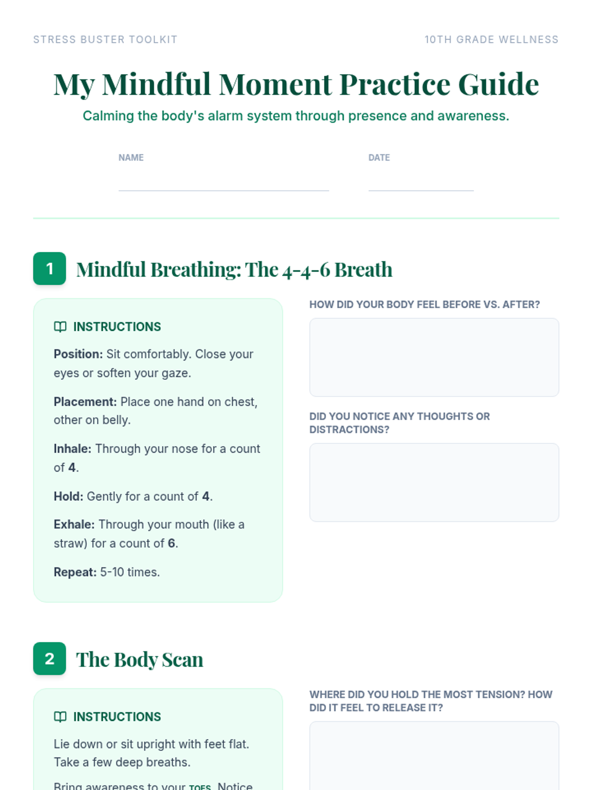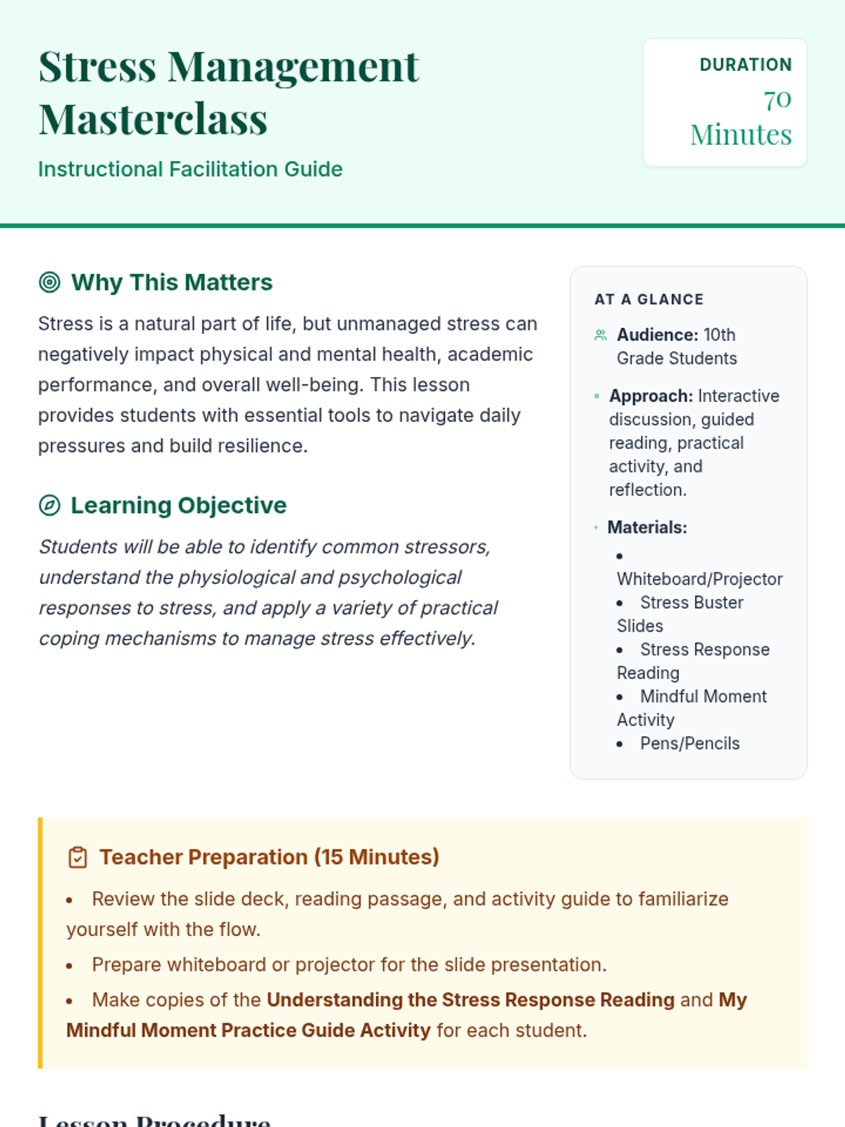 A comprehensive 70-minute session for 10th graders to identify stressors, understand the physiological stress response, and build a toolkit of mindfulness strategies.