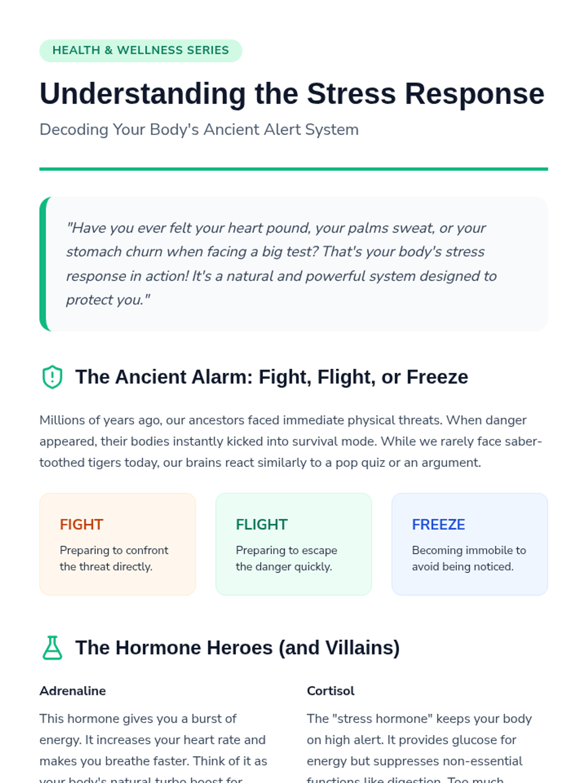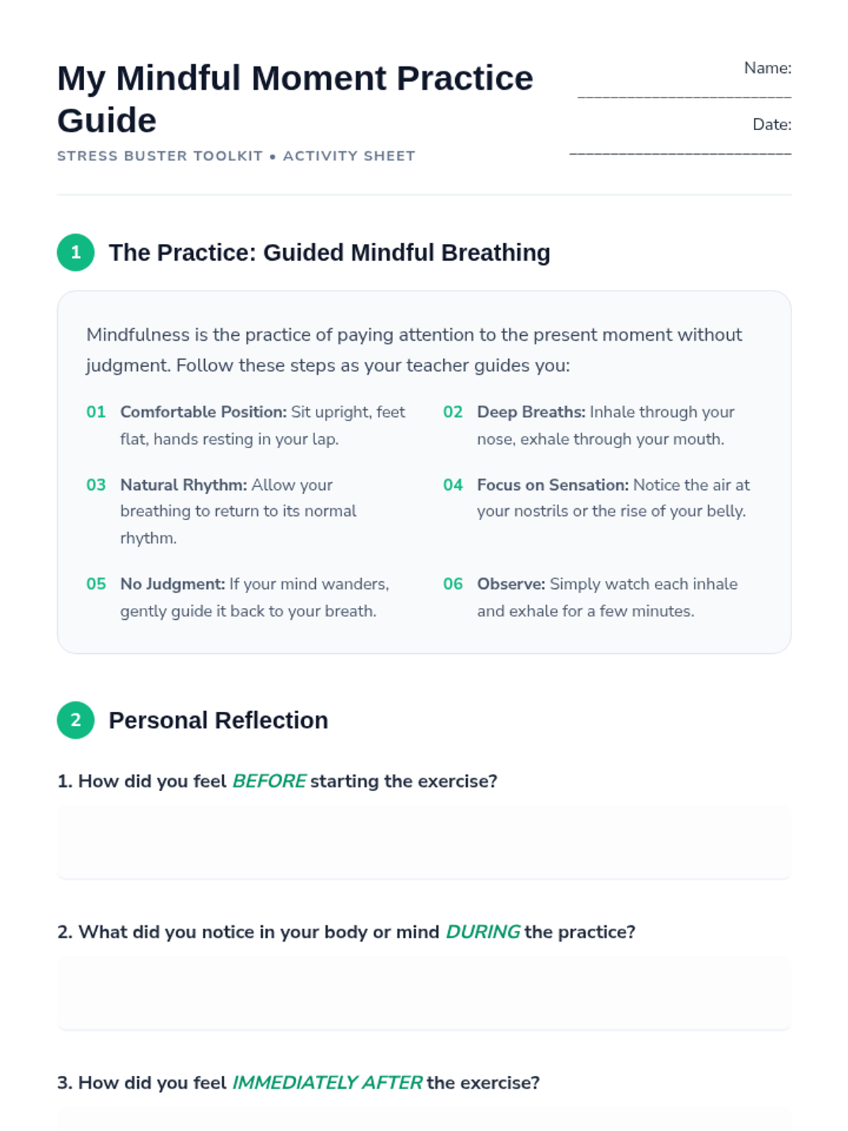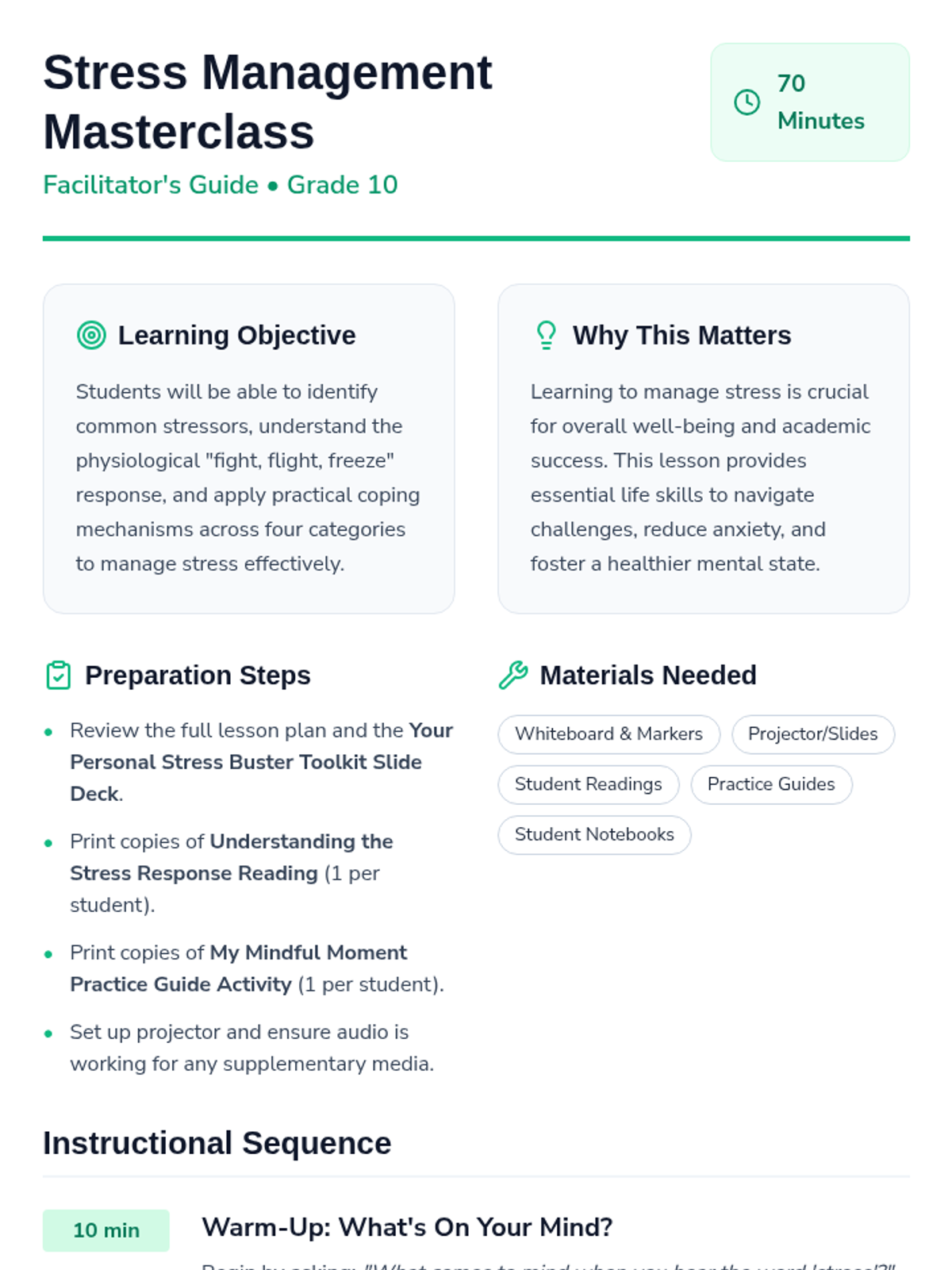 A comprehensive 70-minute lesson designed to equip 10th-grade students with a toolkit of strategies for identifying and managing stress through science-backed understanding and mindfulness practice.