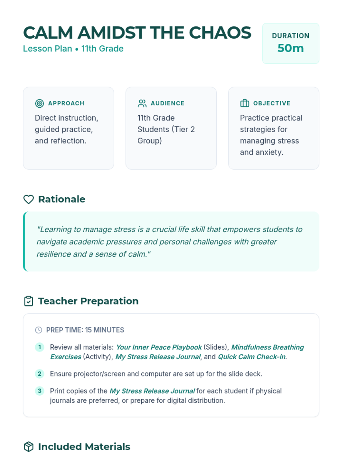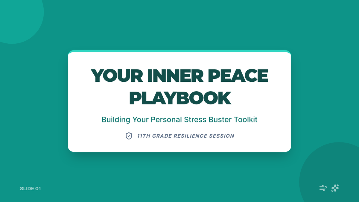 A 50-minute session for 11th graders focused on practical stress management strategies, mindfulness techniques, and personal reflection. Students build a 'toolkit' of coping mechanisms to navigate academic and life pressures.