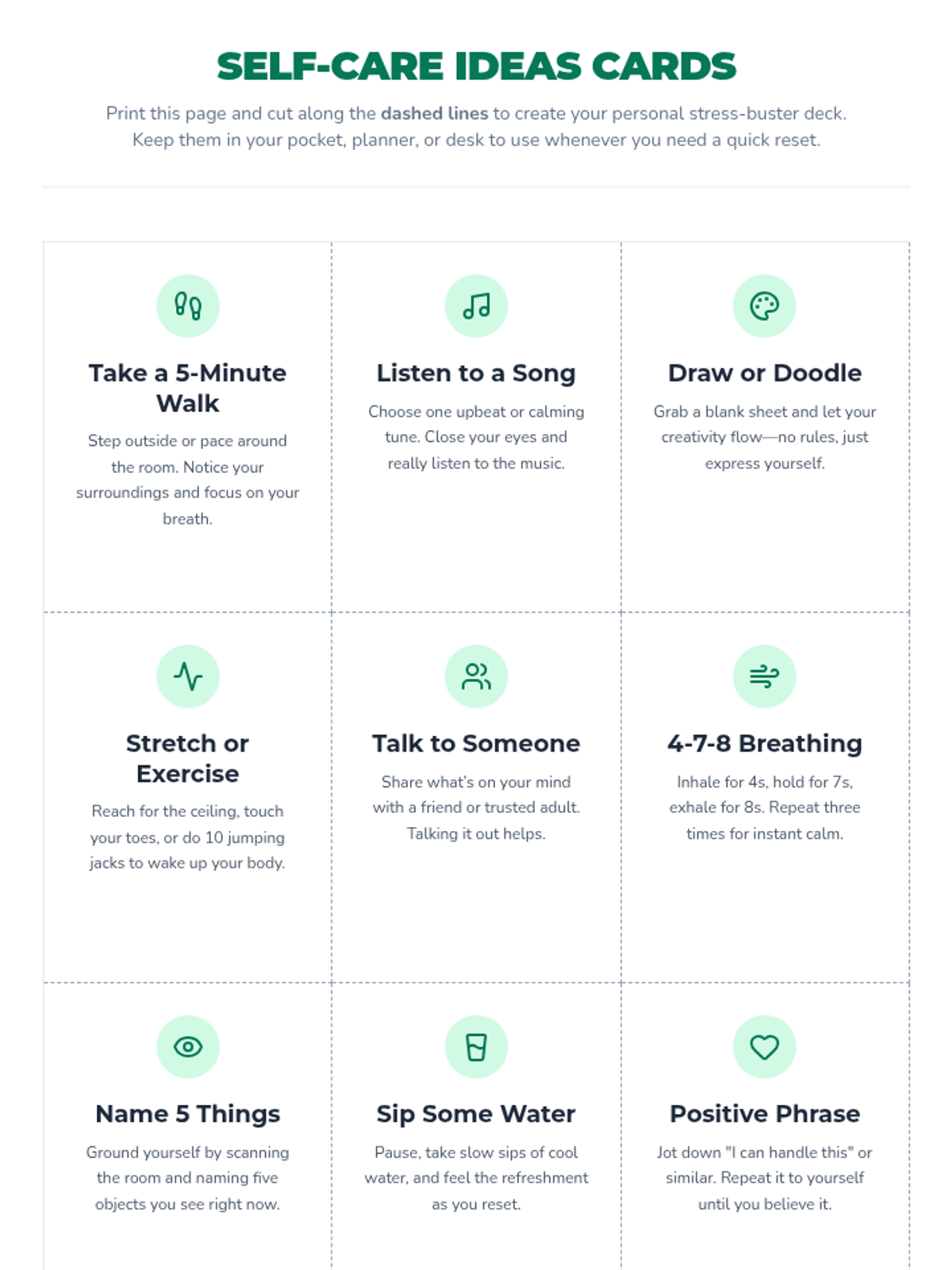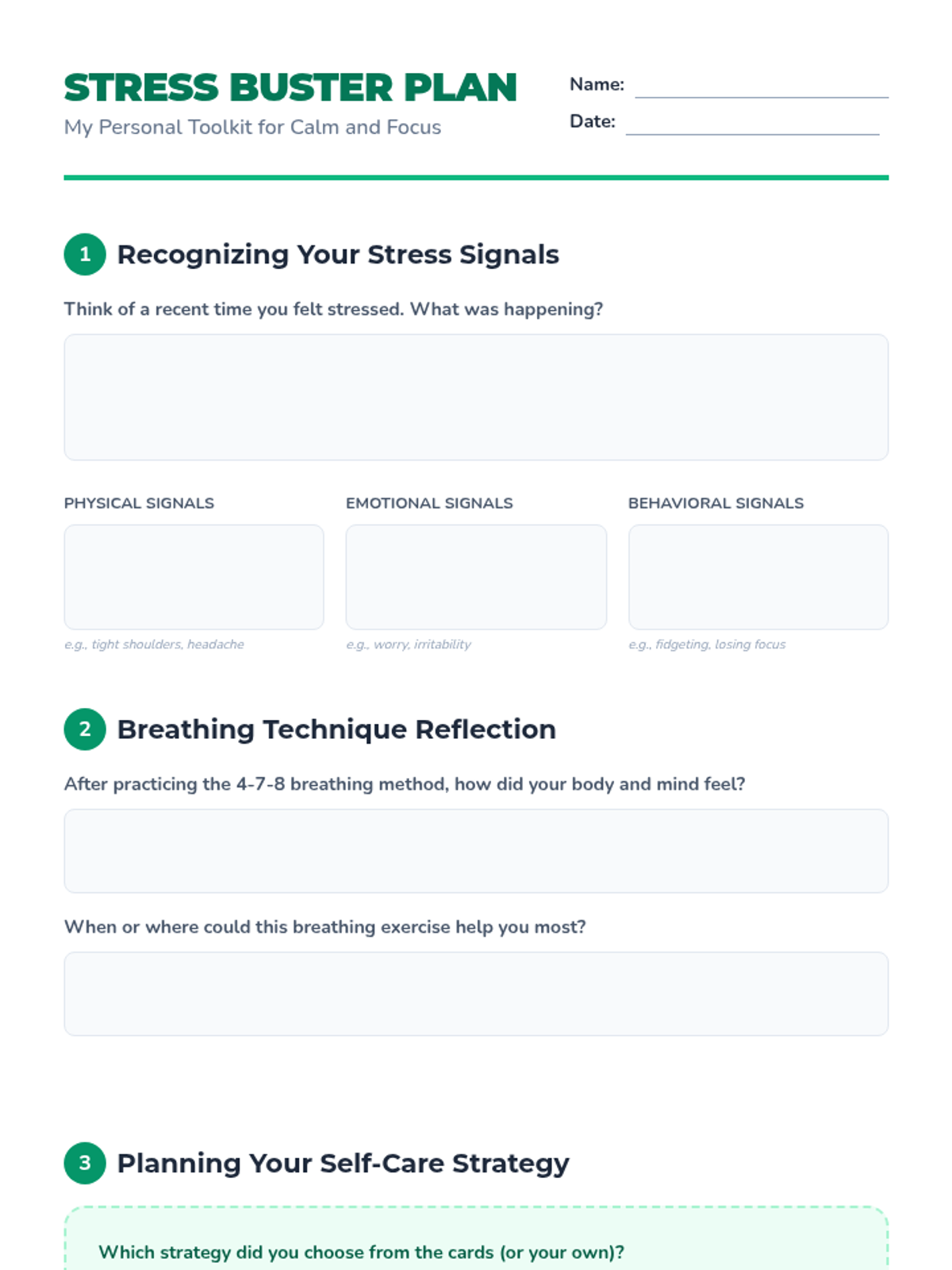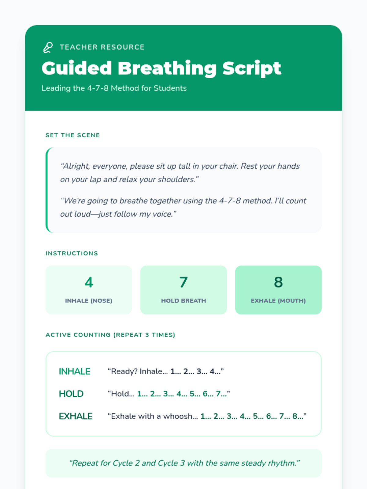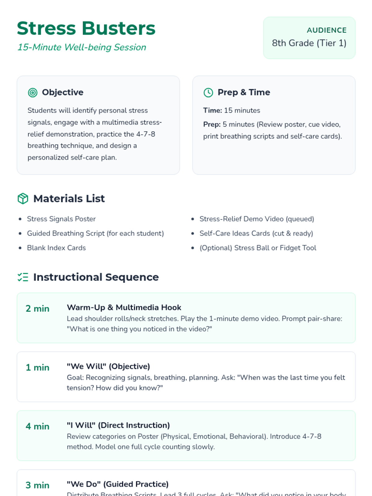 A 15-minute interactive lesson for 8th graders to recognize stress signals and practice immediate coping strategies like the 4-7-8 breathing technique.