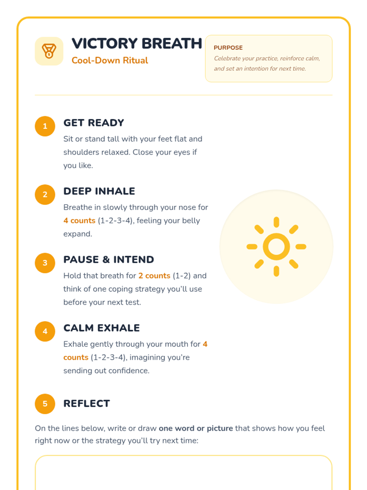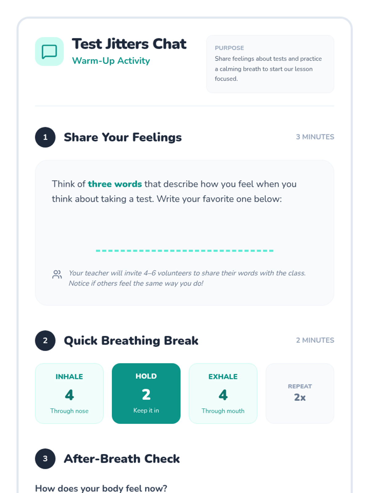 A calming introductory session for 4th graders to learn and practice three specific breath work techniques to manage emotions and improve focus.
