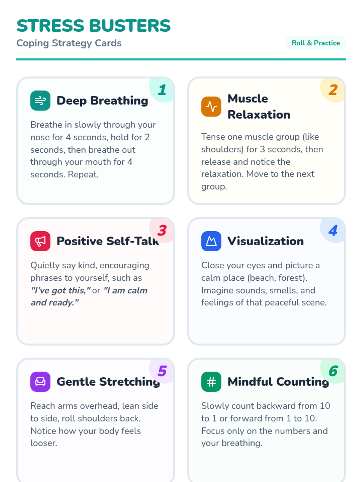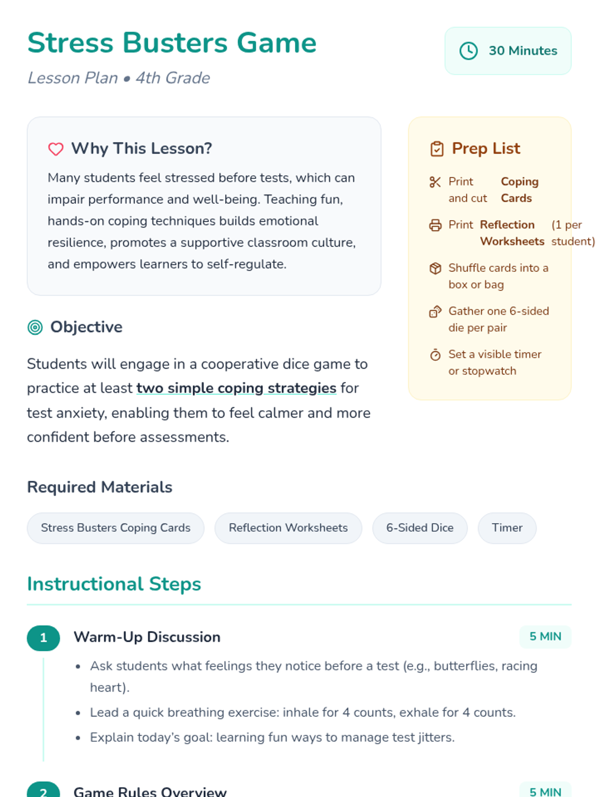 A 30-minute 4th grade lesson focused on reducing test anxiety through an interactive dice game. Students learn and practice practical coping strategies like deep breathing and positive self-talk to build confidence and resilience.