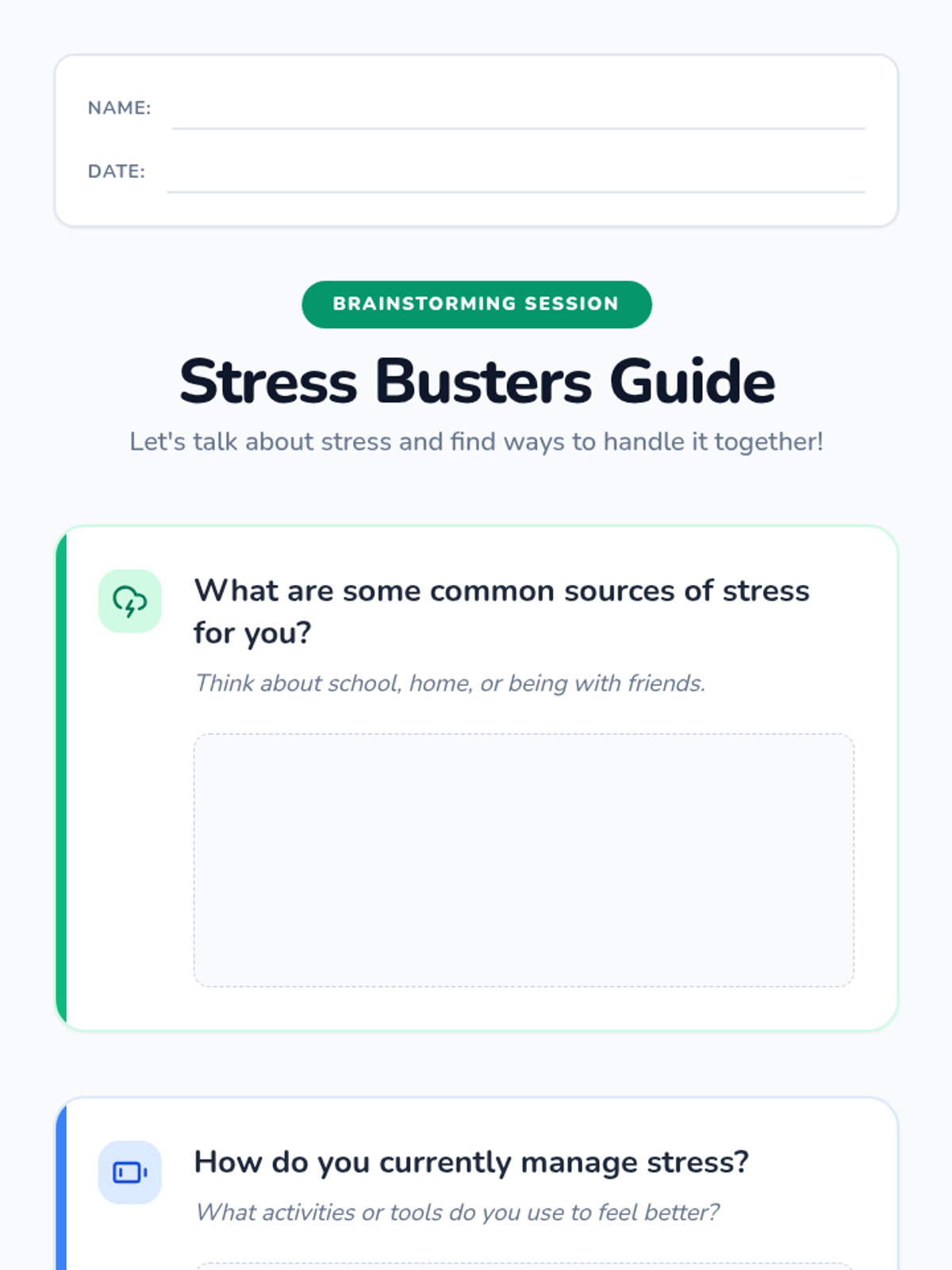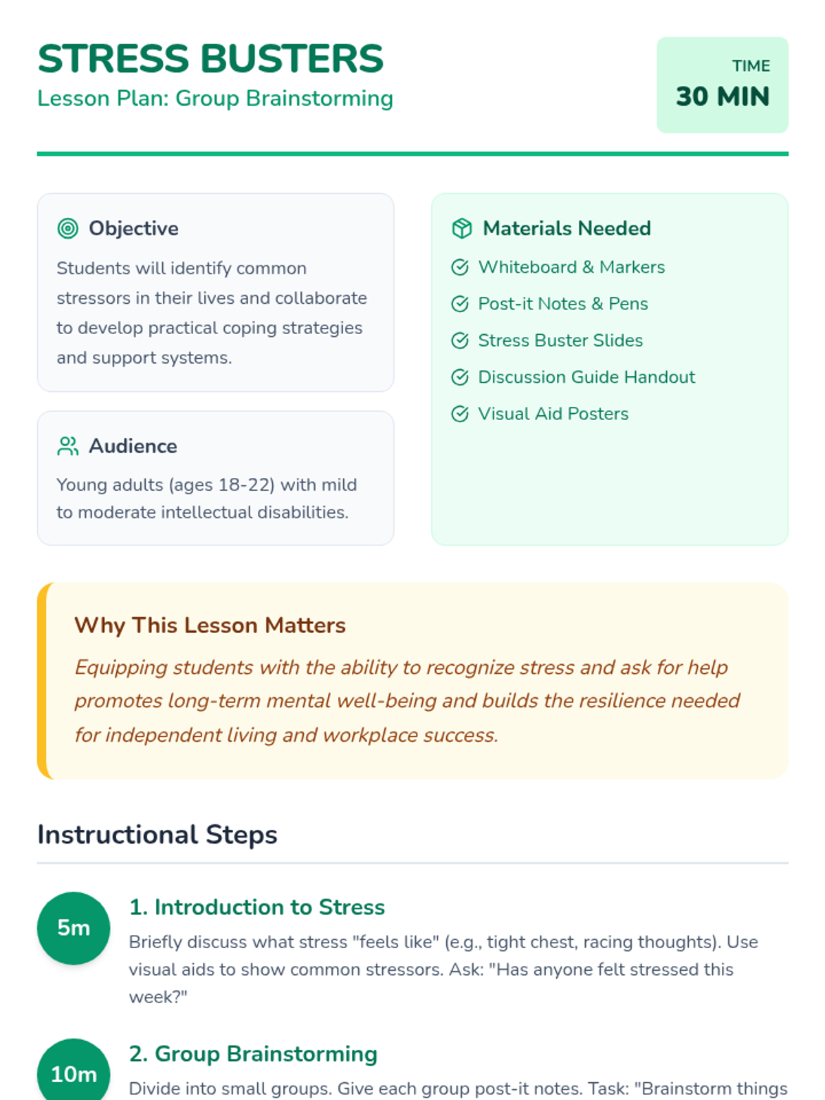 A collaborative lesson for young adults with intellectual disabilities to identify common stressors and develop practical coping strategies through group brainstorming and role-play.