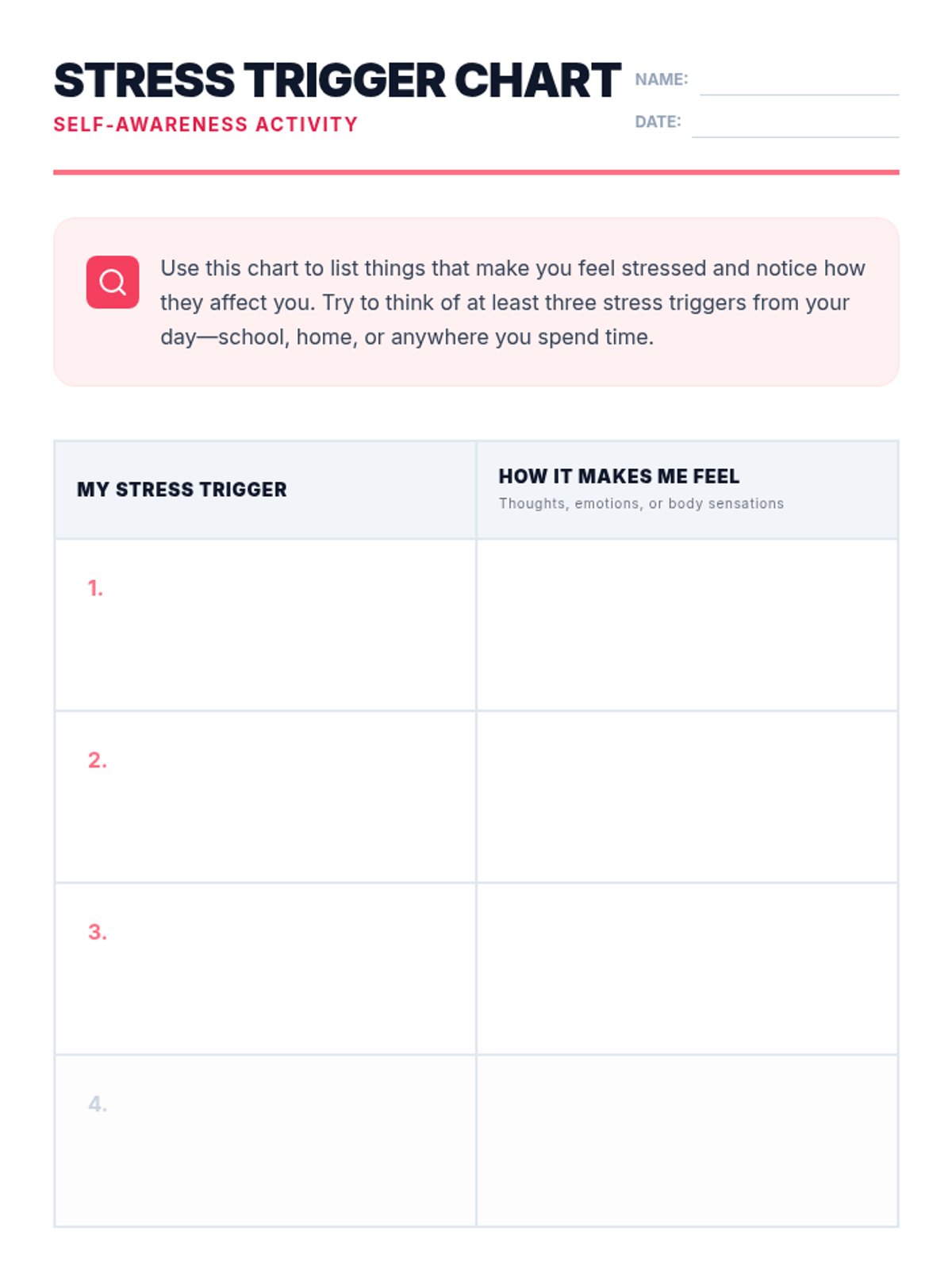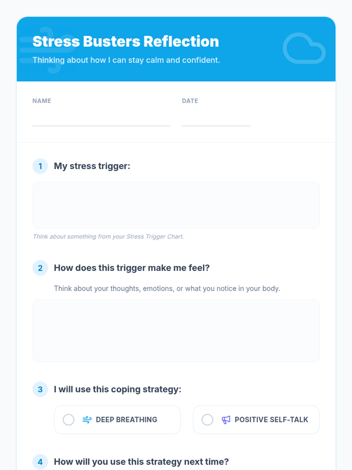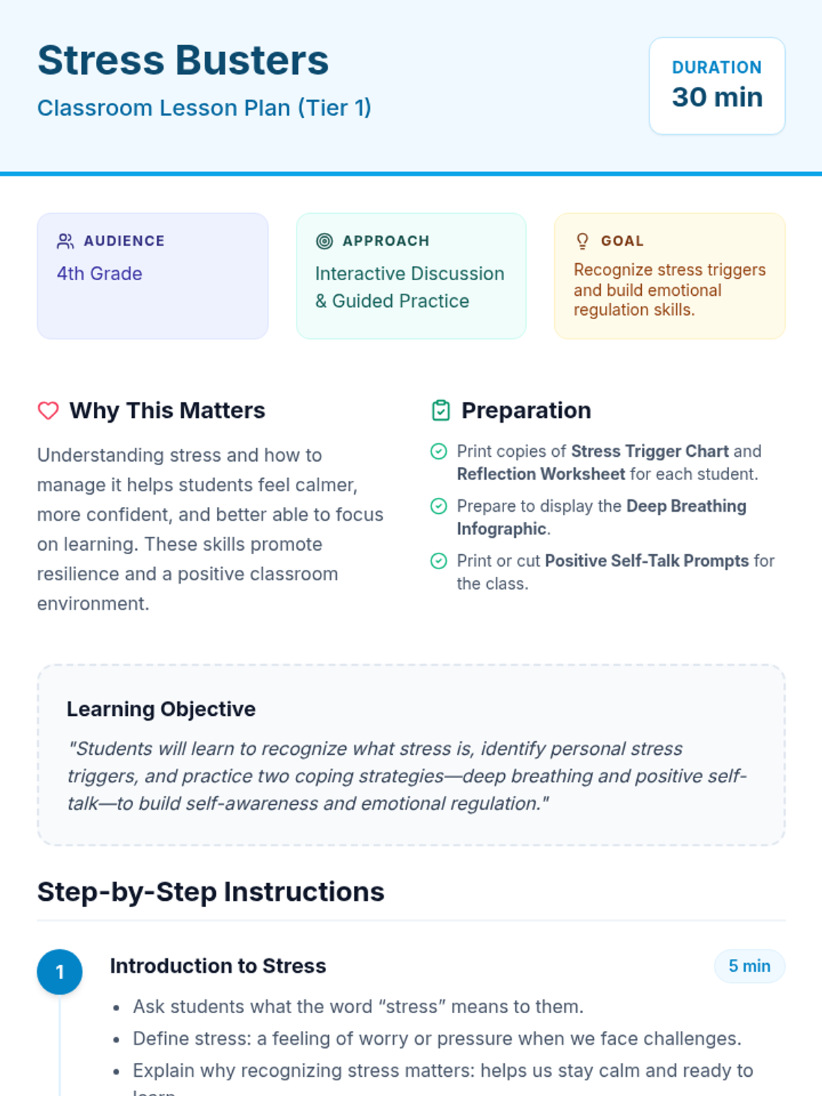 A 30-minute Tier 1 classroom lesson for 4th graders to identify stress triggers and practice coping strategies like deep breathing and positive self-talk.
