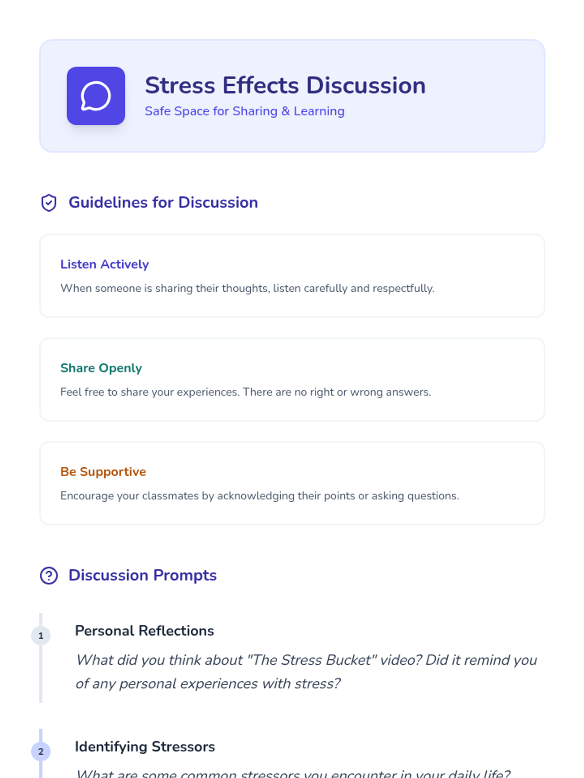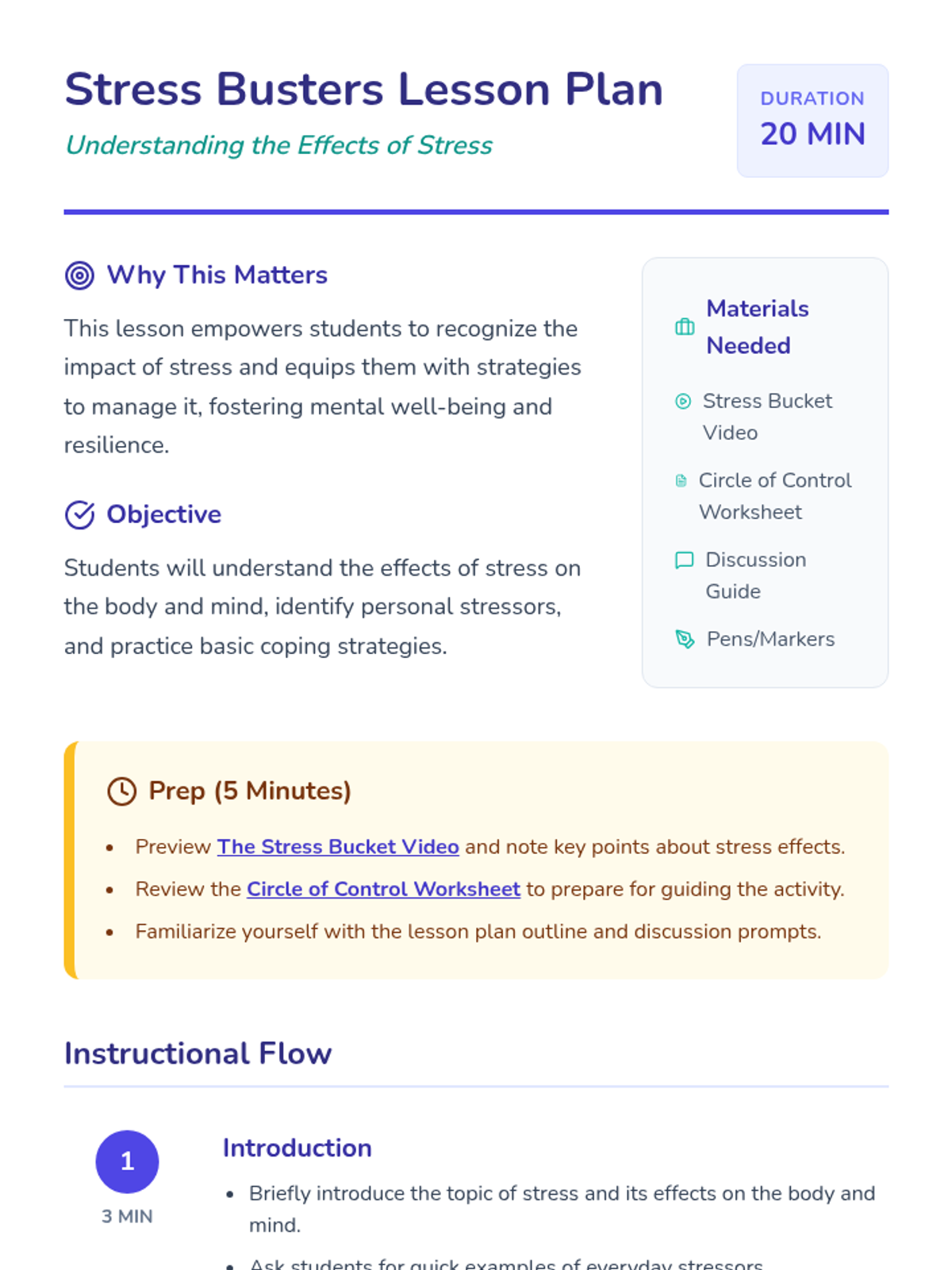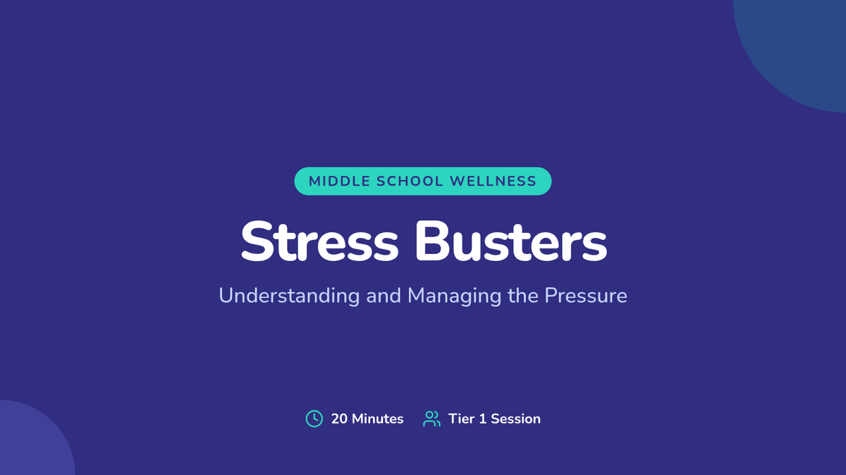 A 20-minute middle school session focused on recognizing stressors, understanding their effects, and practicing management strategies like the Circle of Control.