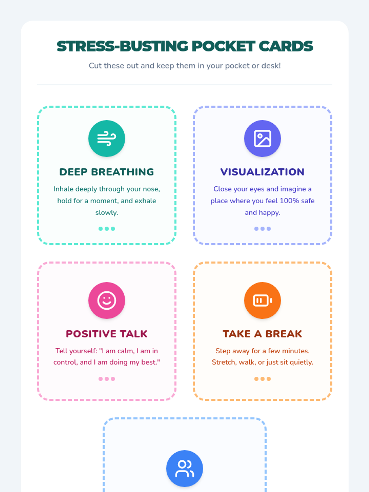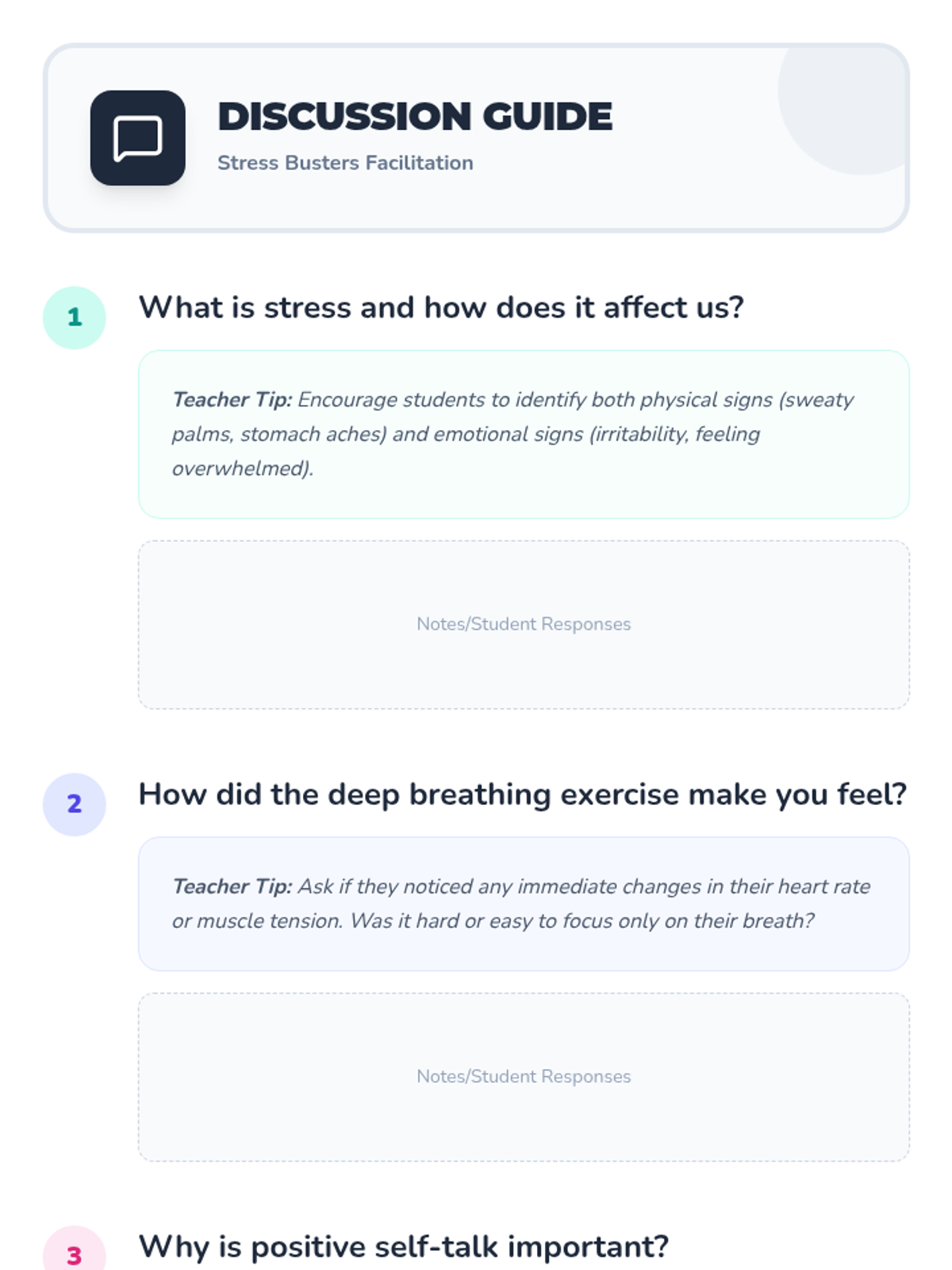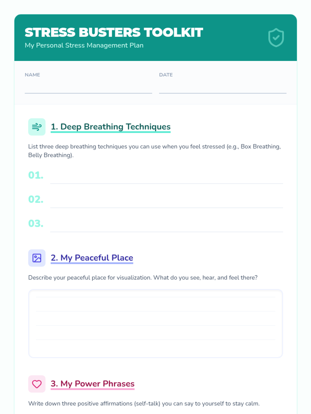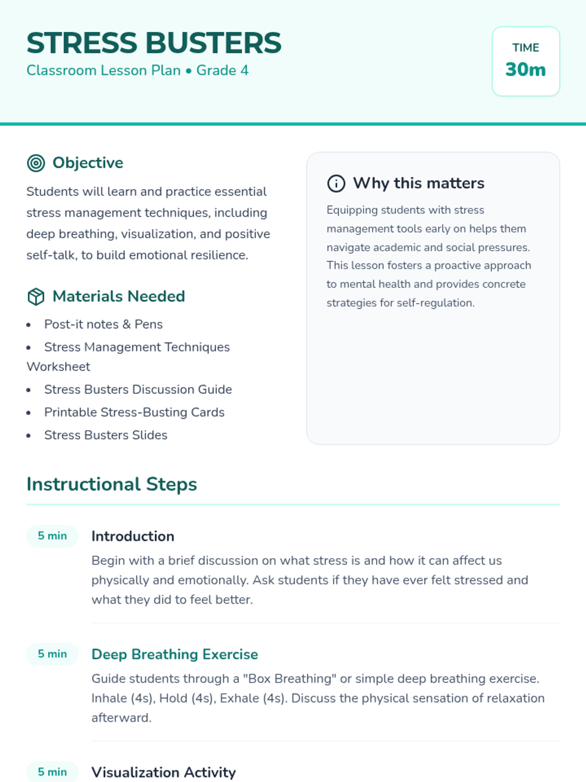 In this lesson, students explore stress management techniques like deep breathing, visualization, and positive self-talk. They create a personal stress-busting toolkit to promote emotional well-being and resilience.