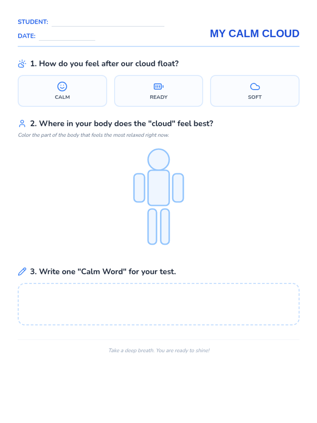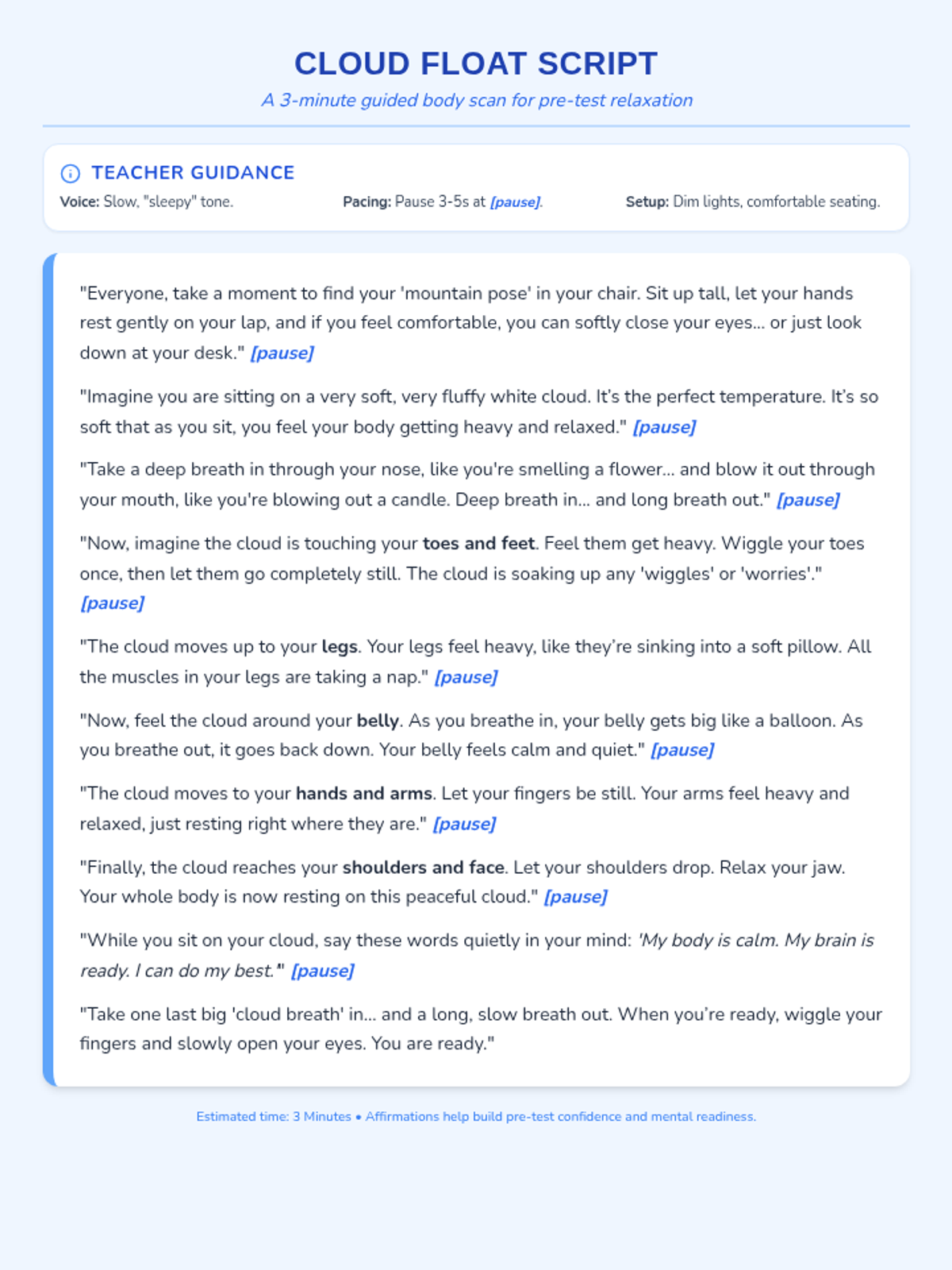 A short mindfulness lesson designed to help elementary students regulate their emotions and reduce anxiety before a test through a guided body scan.
