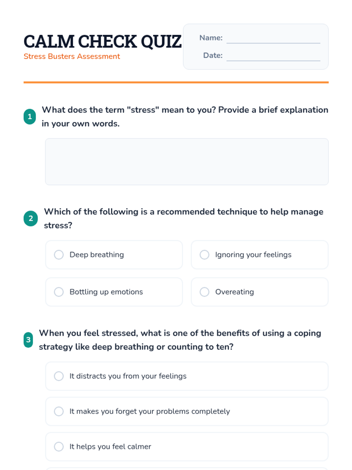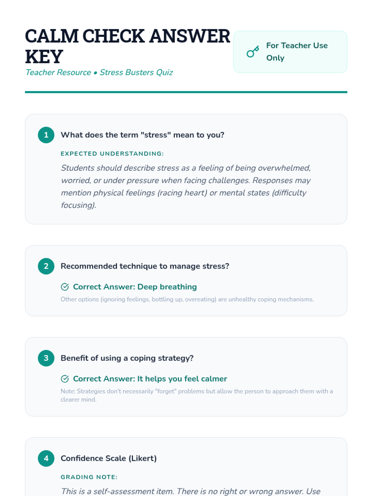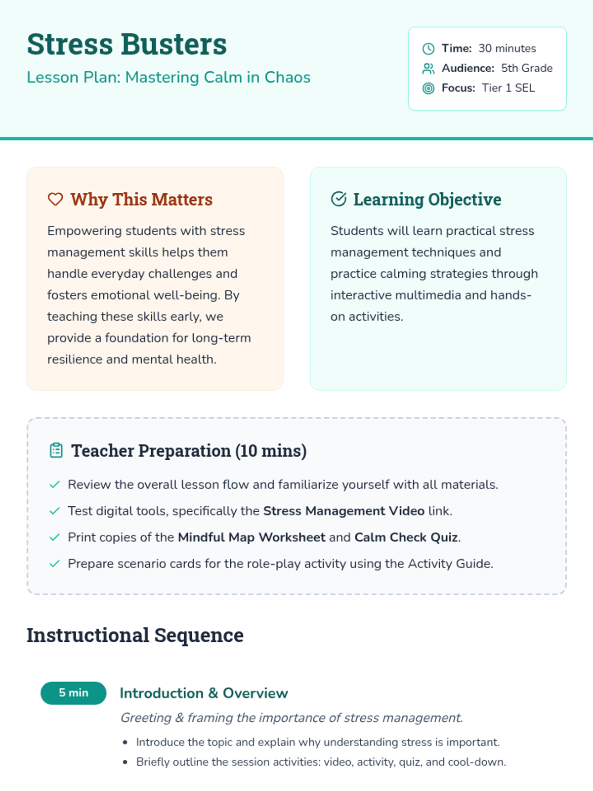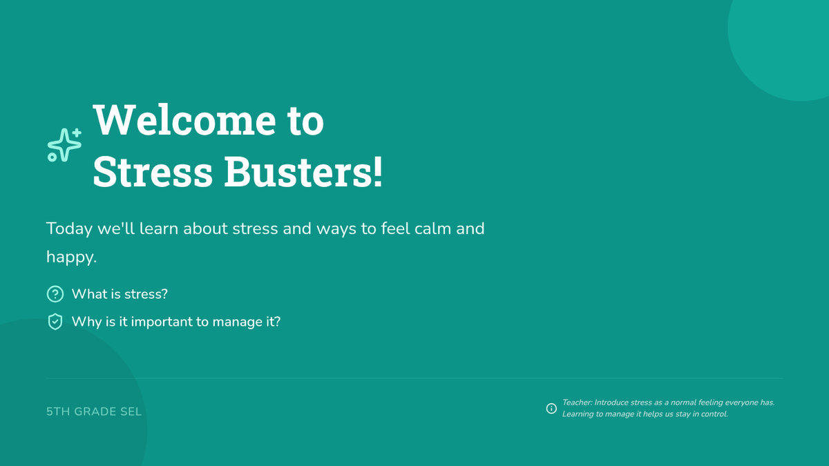 This engaging 5th-grade lesson focuses on stress management, teaching students practical techniques to handle stress effectively. Students explore stress-relief strategies, participate in calming activities, and assess their understanding through a quiz.