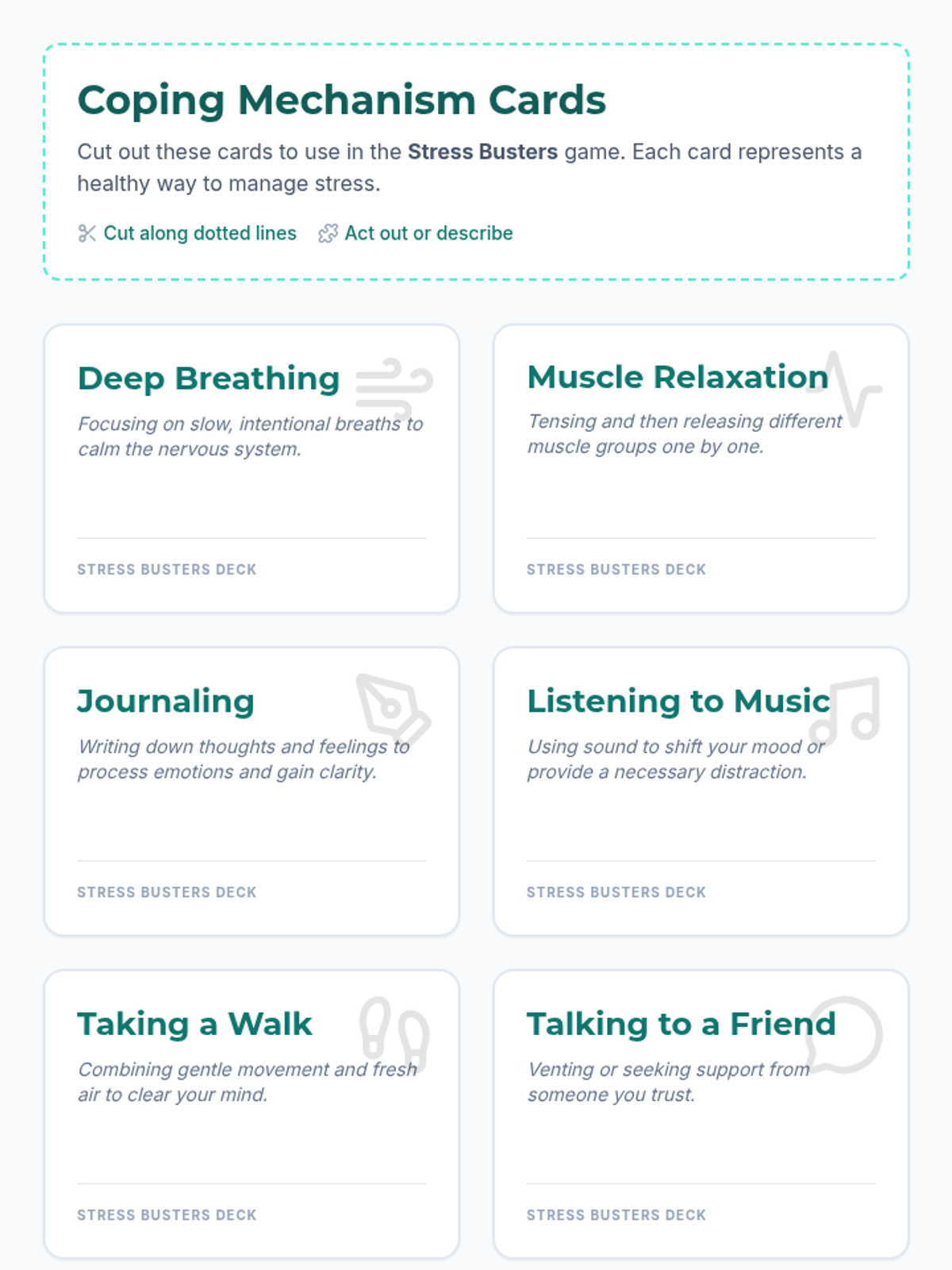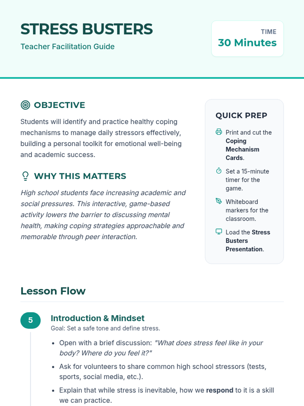 An interactive game-based lesson for high schoolers to explore and practice healthy stress-management techniques in a supportive environment.