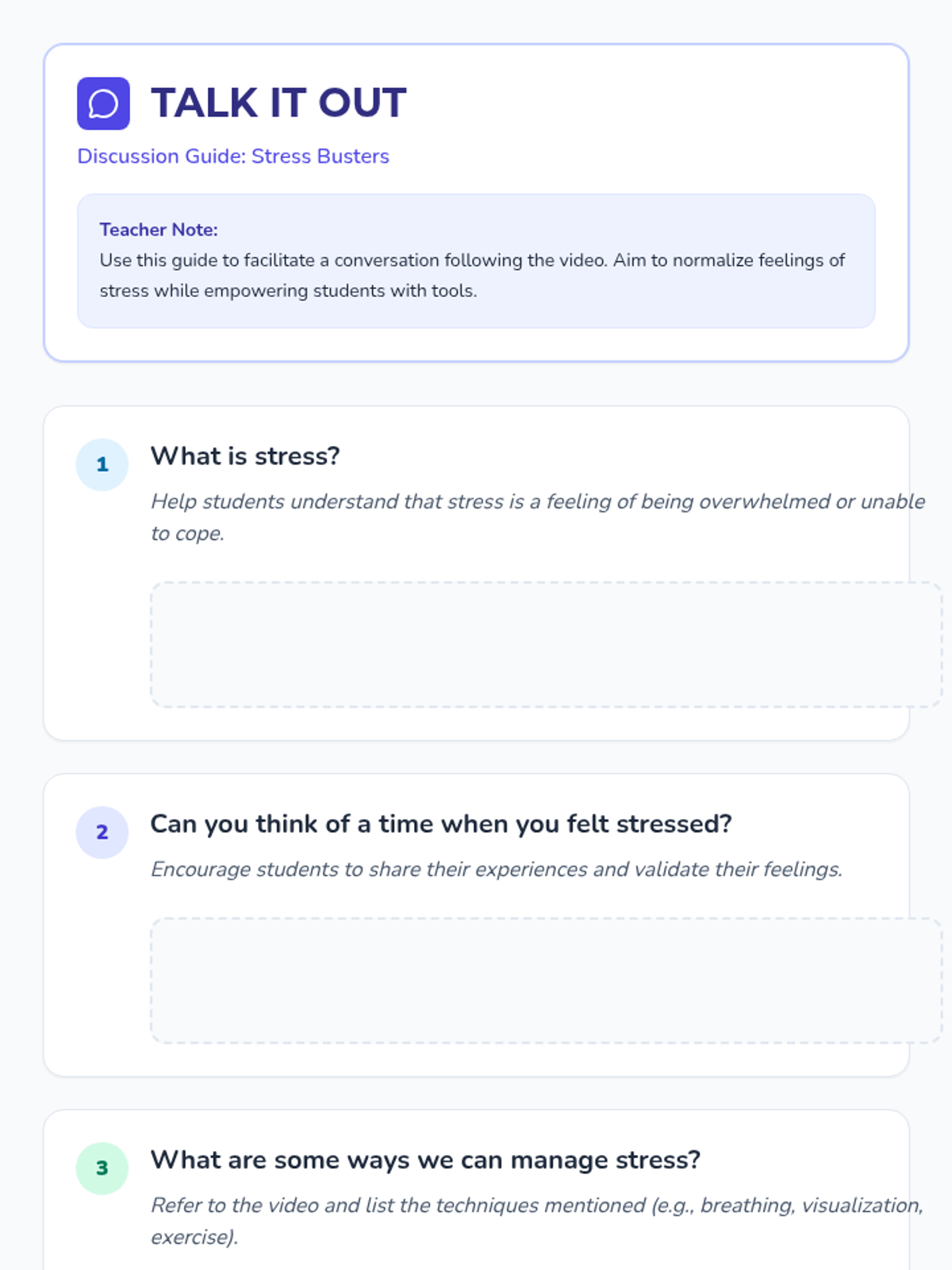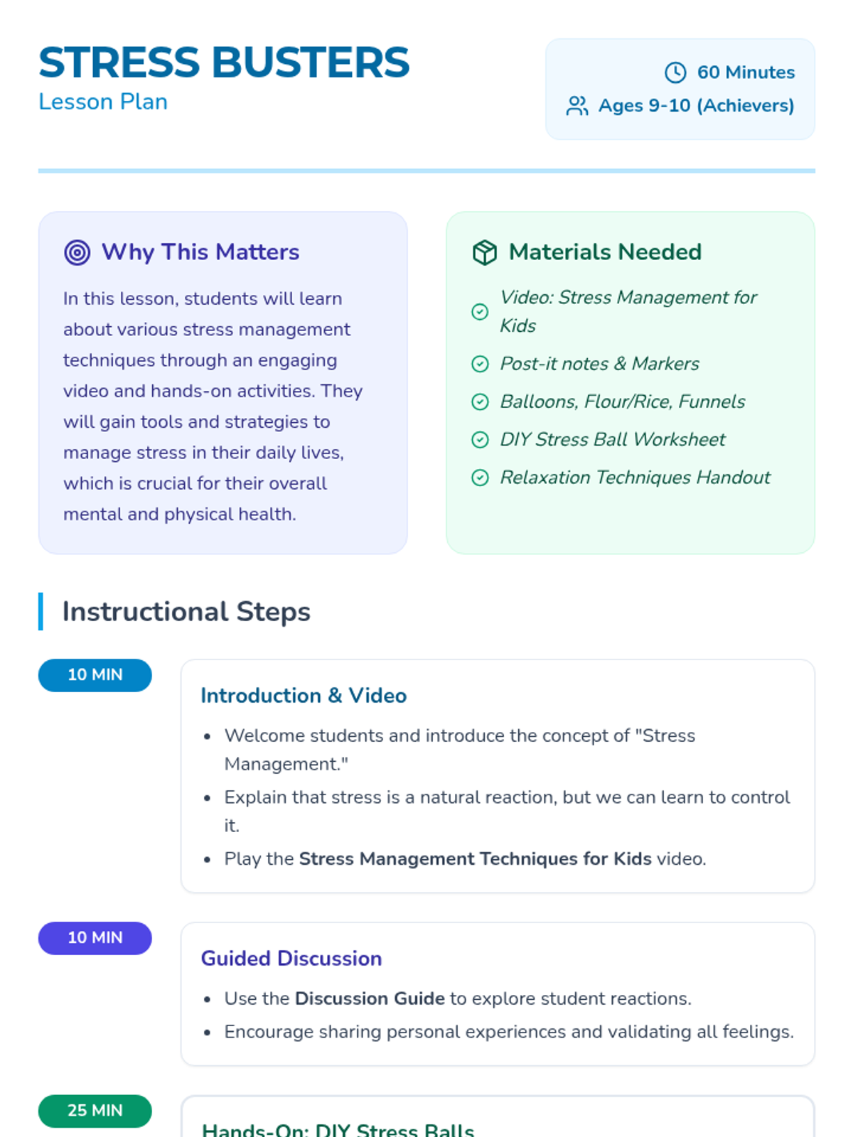 Students explore stress management through a video, group discussion, and a hands-on DIY stress ball activity, building a personal toolkit for emotional regulation.