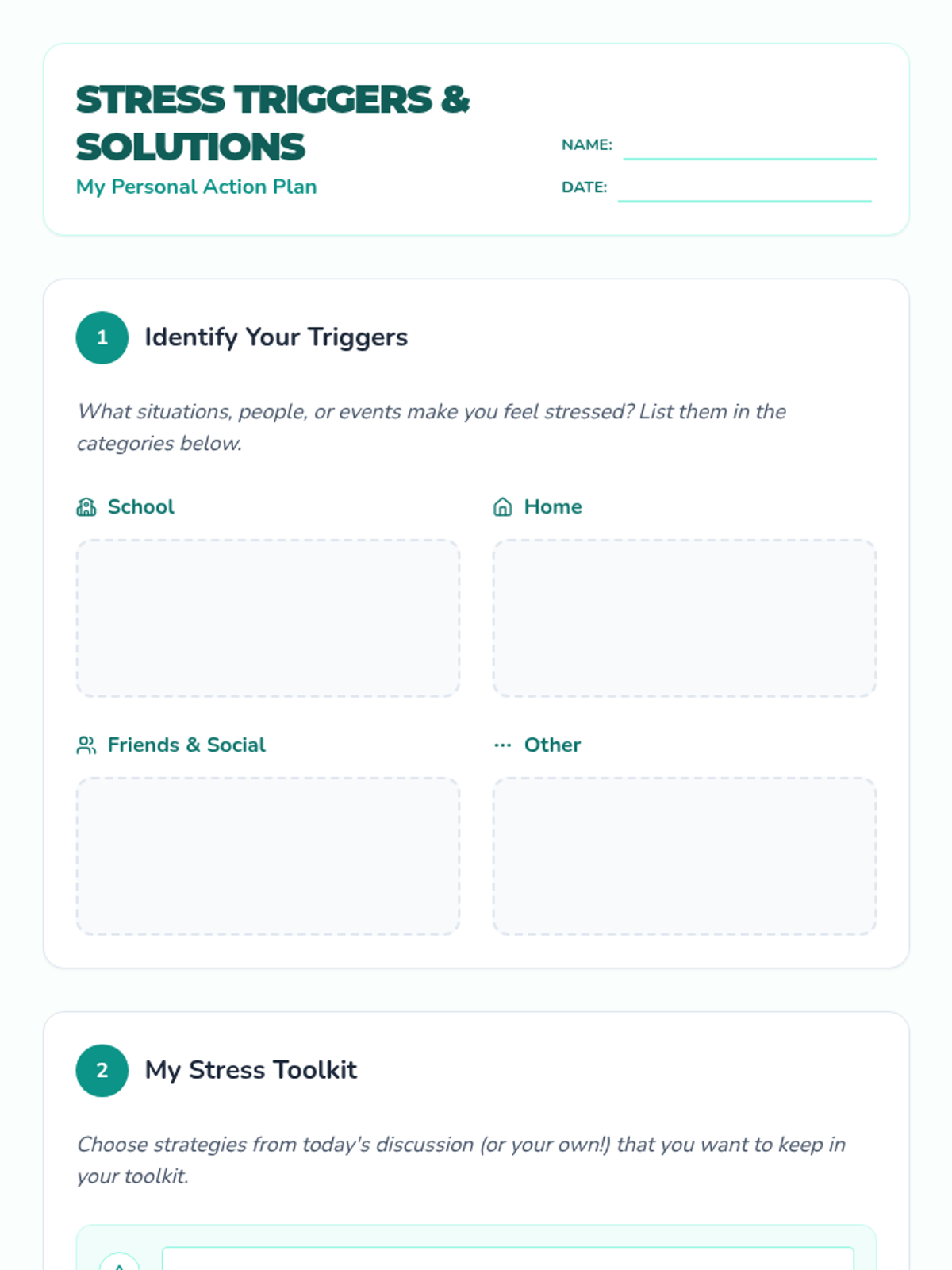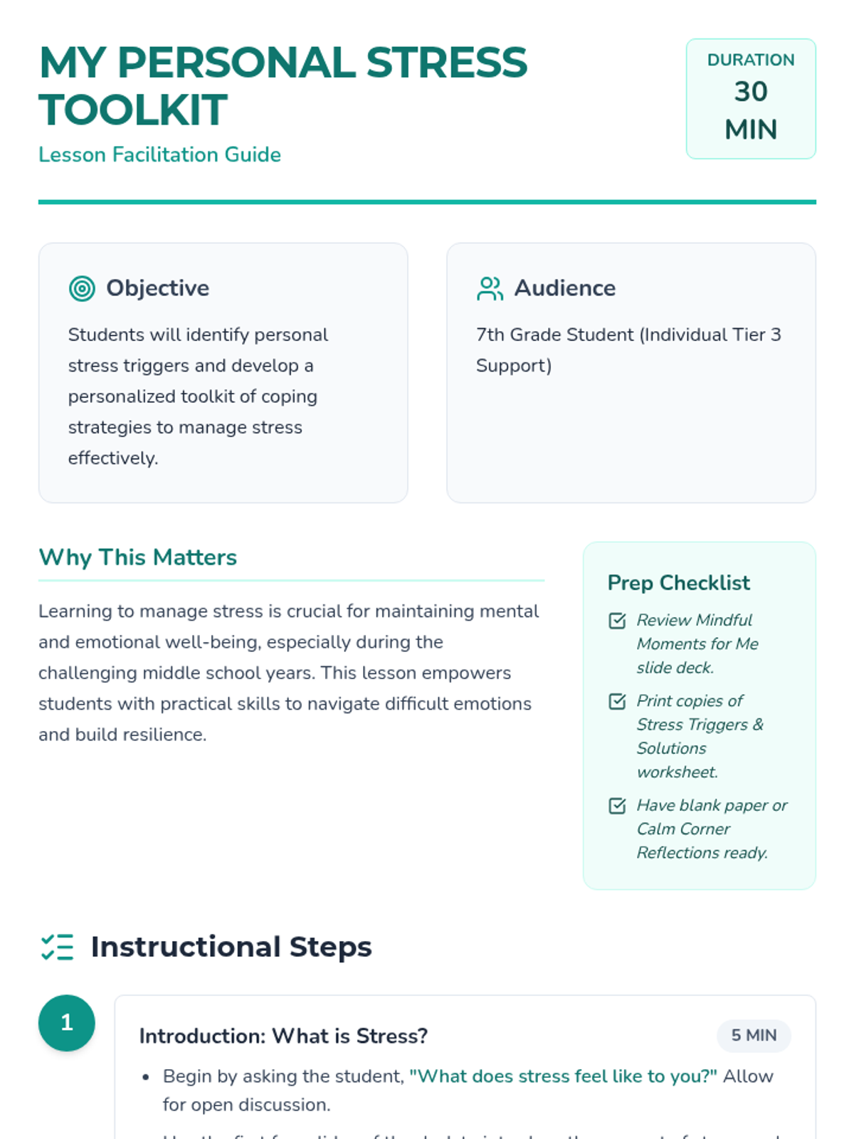 An individual Tier 3 lesson for 7th-grade students to identify personal stress triggers and build a customized toolkit of coping strategies.