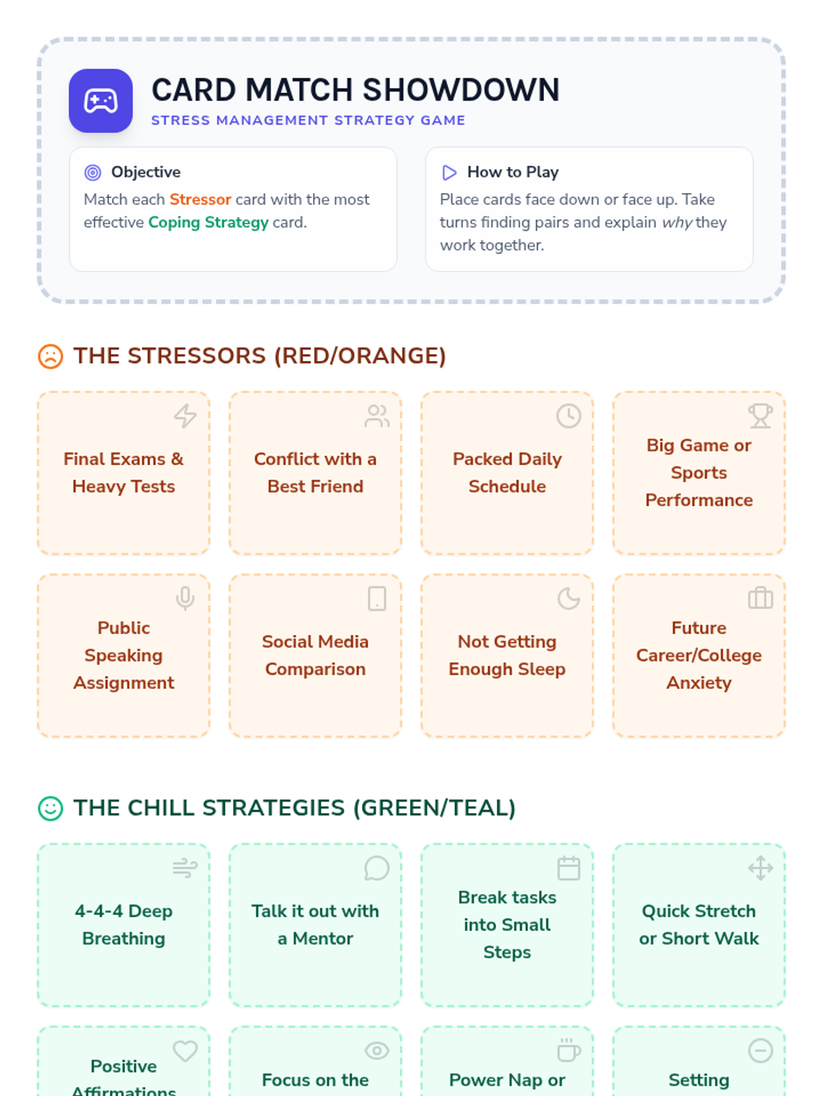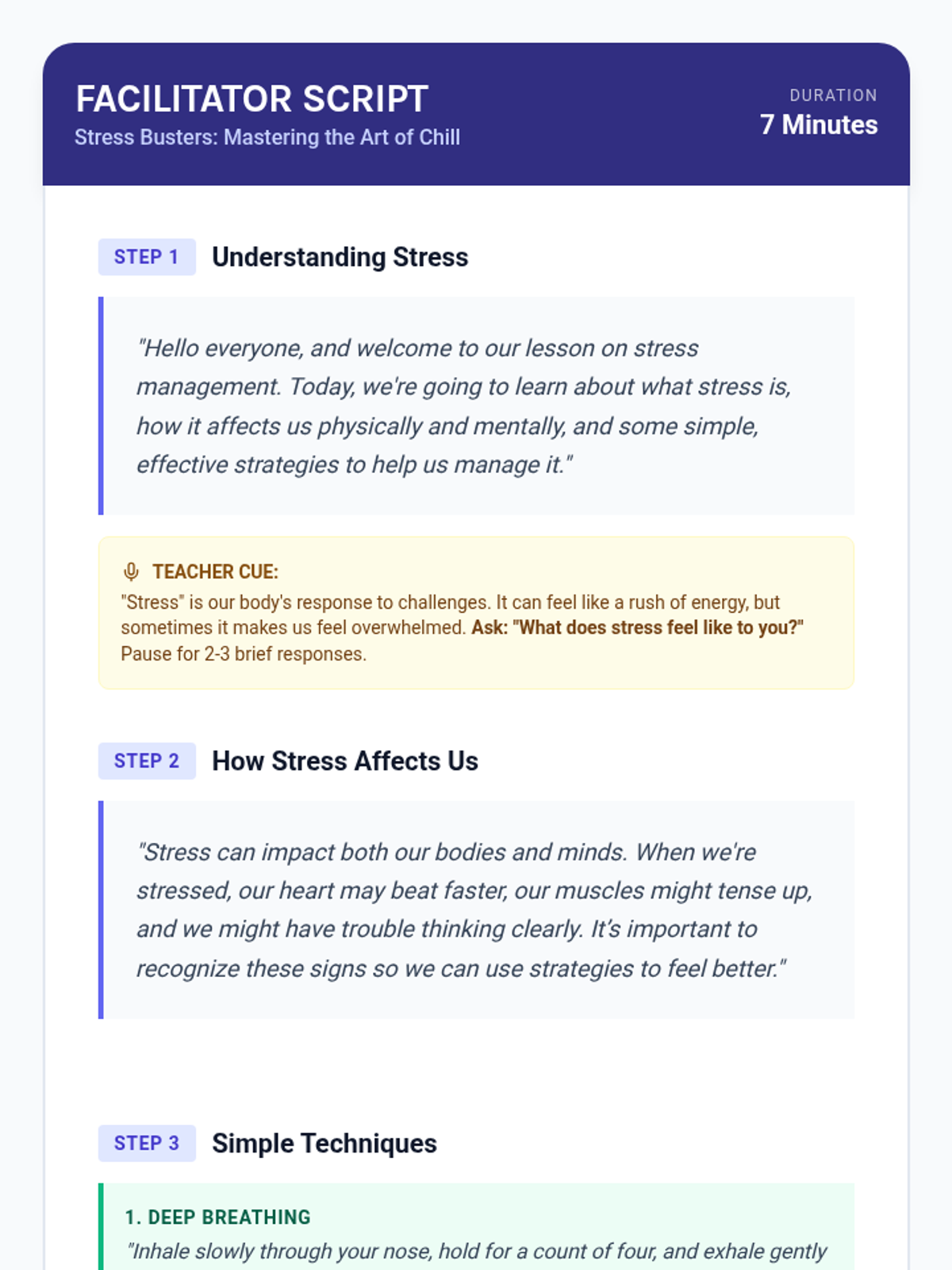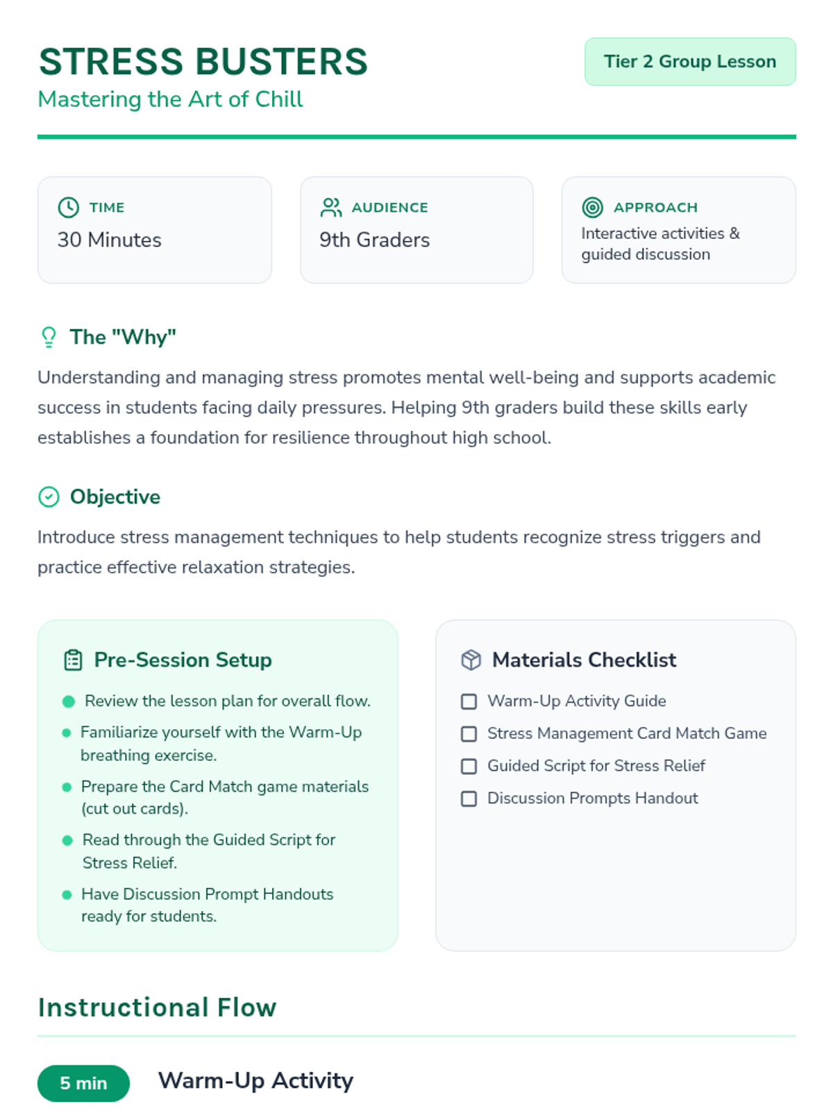 A 30-minute Tier 2 group lesson for 9th graders focused on identifying stress triggers and practicing practical coping strategies like deep breathing and mindfulness.