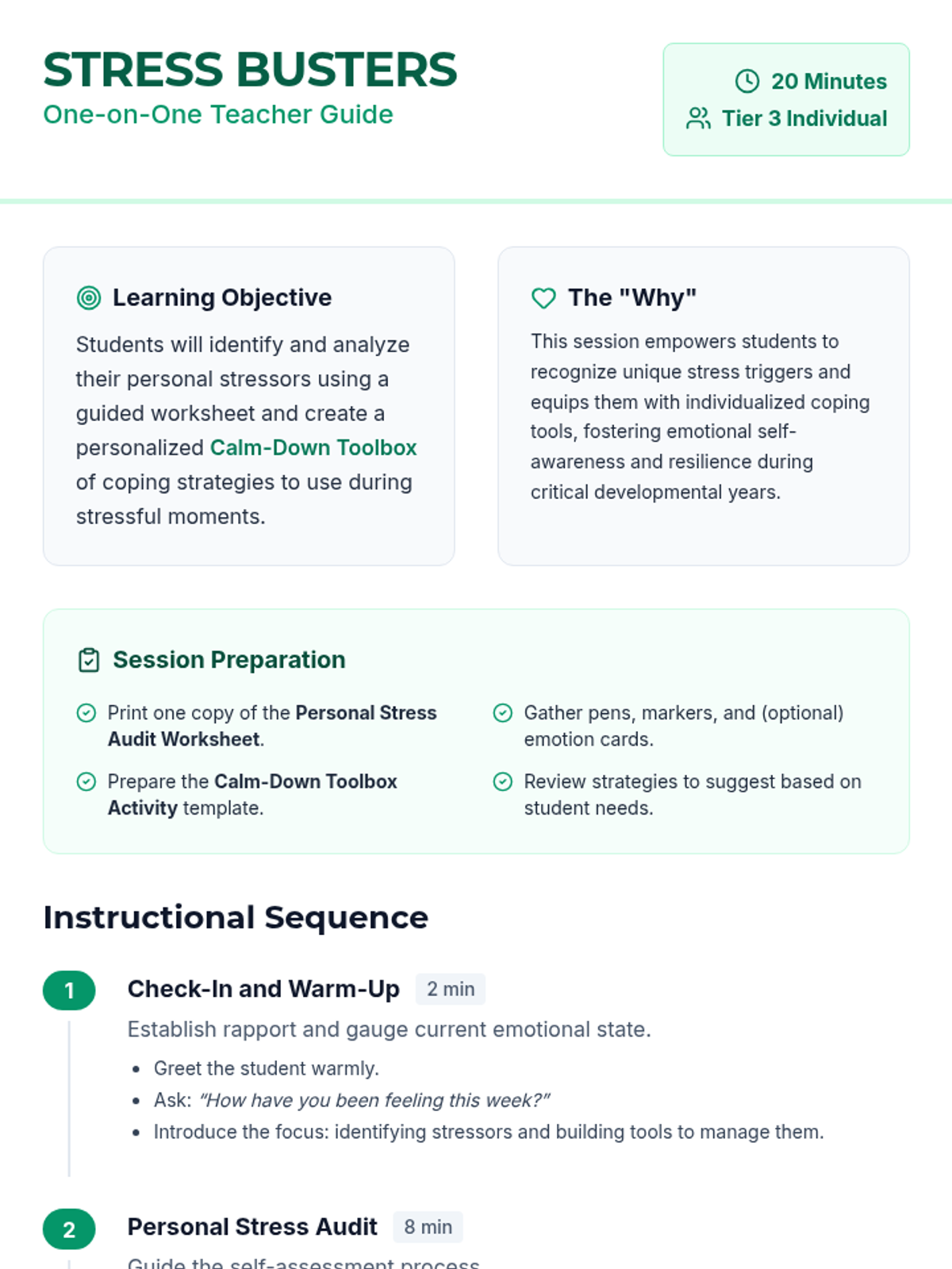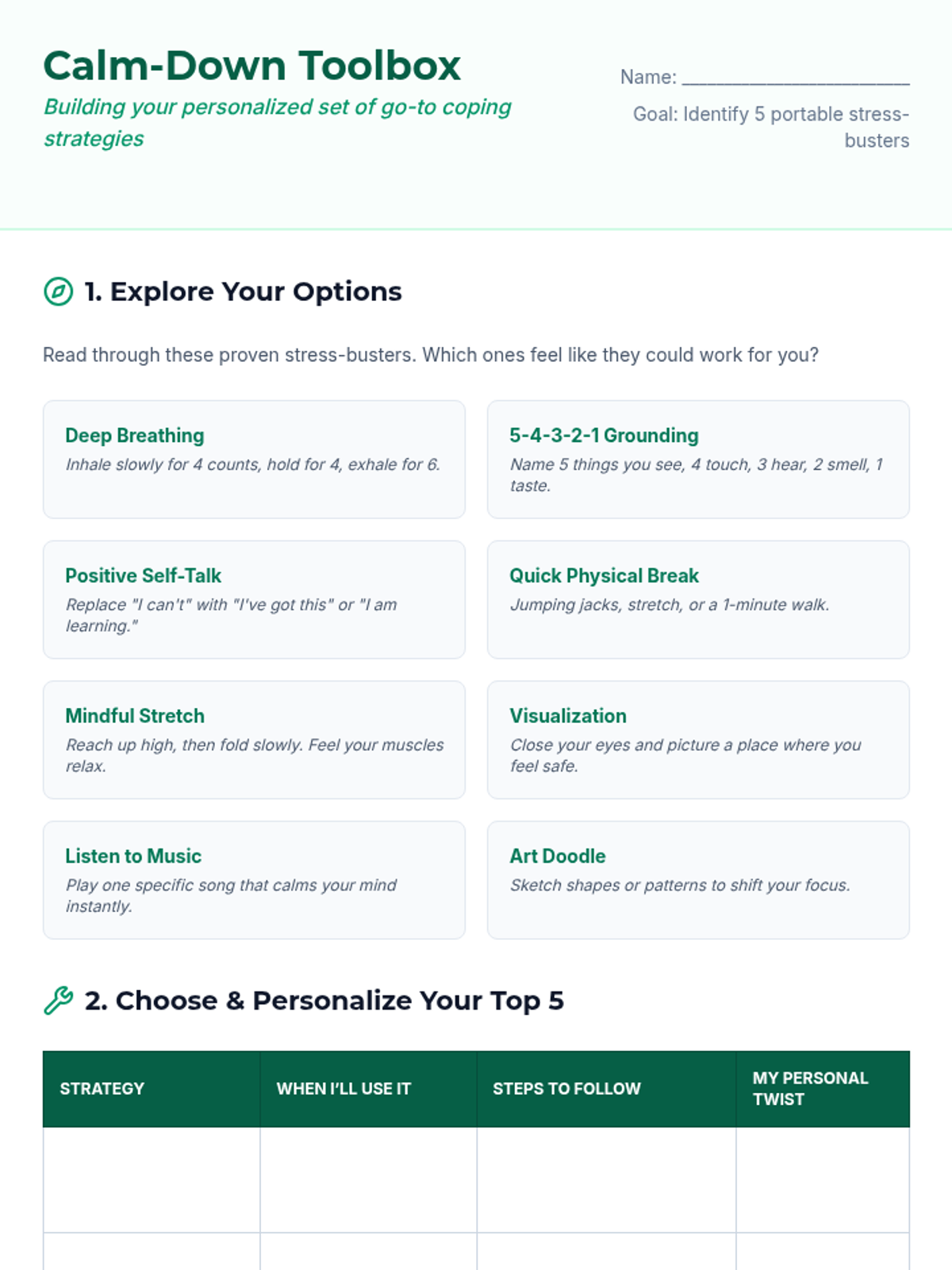An individualized Tier 3 session for 7th graders to identify stress triggers and build a personalized Calm-Down Toolbox during Mental Health Awareness Month.