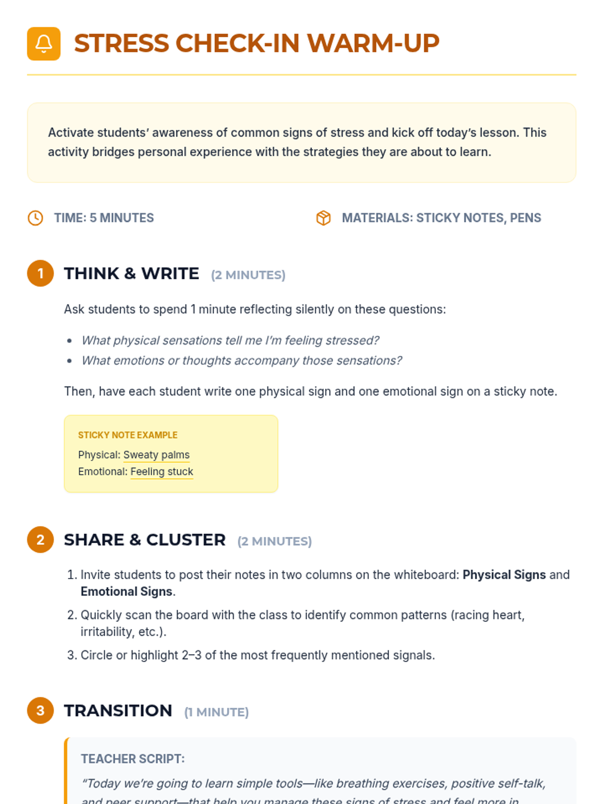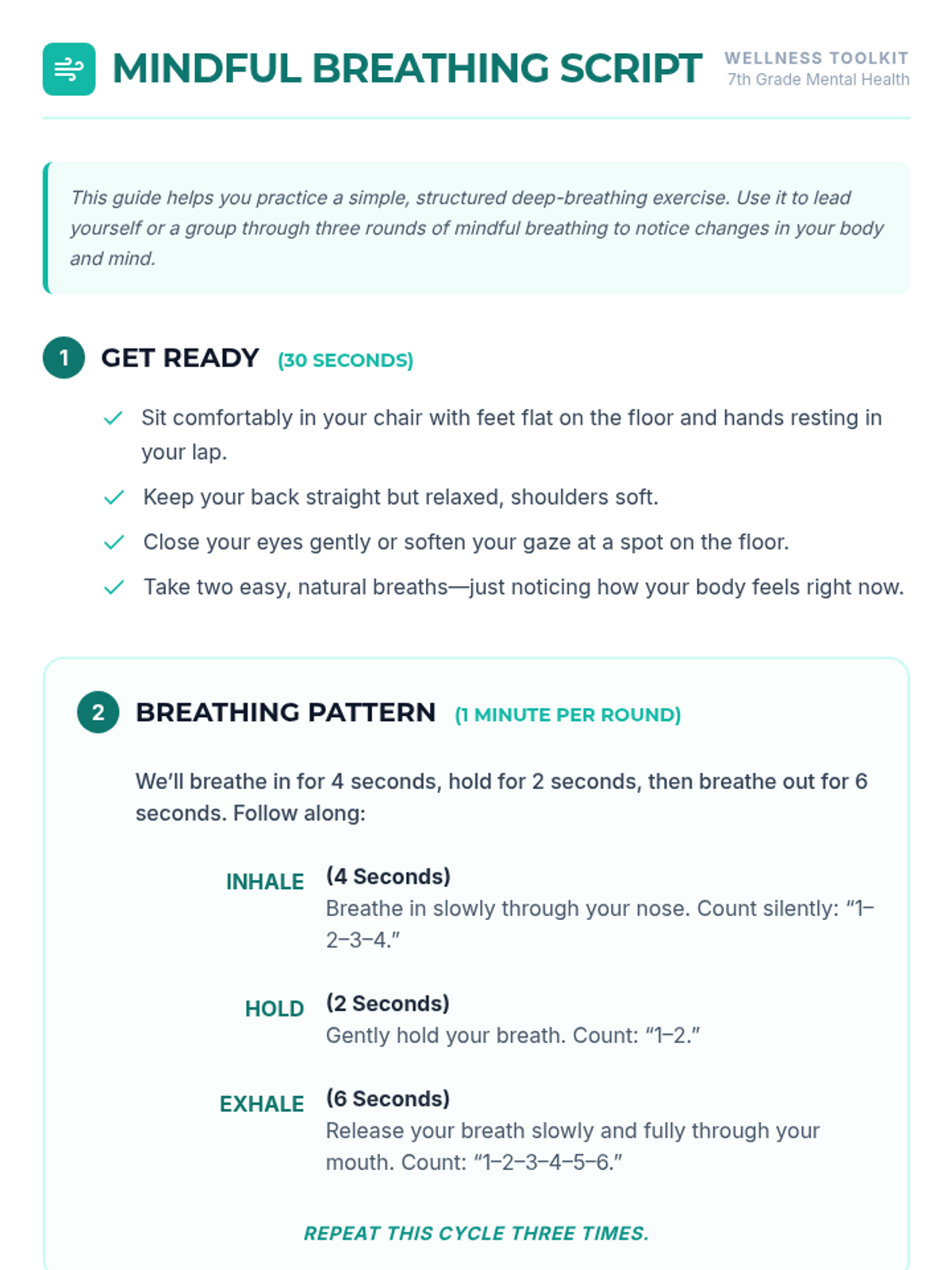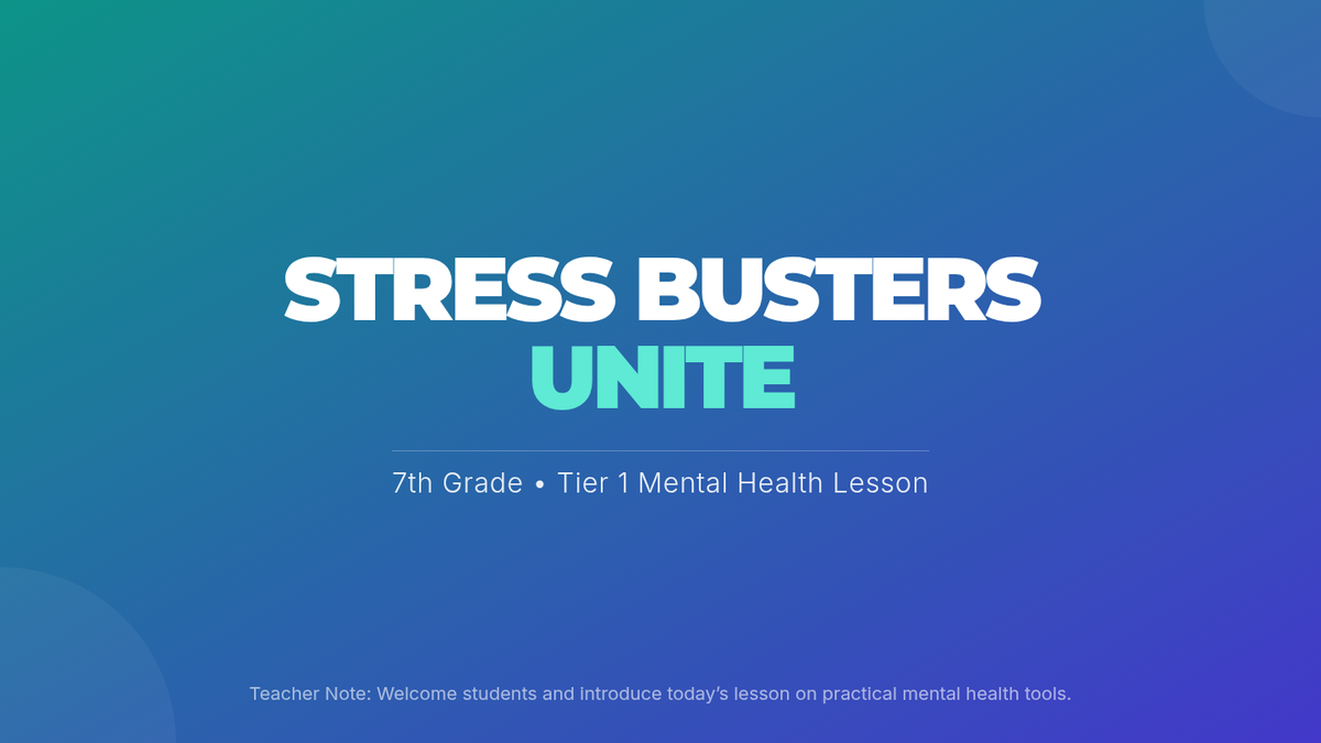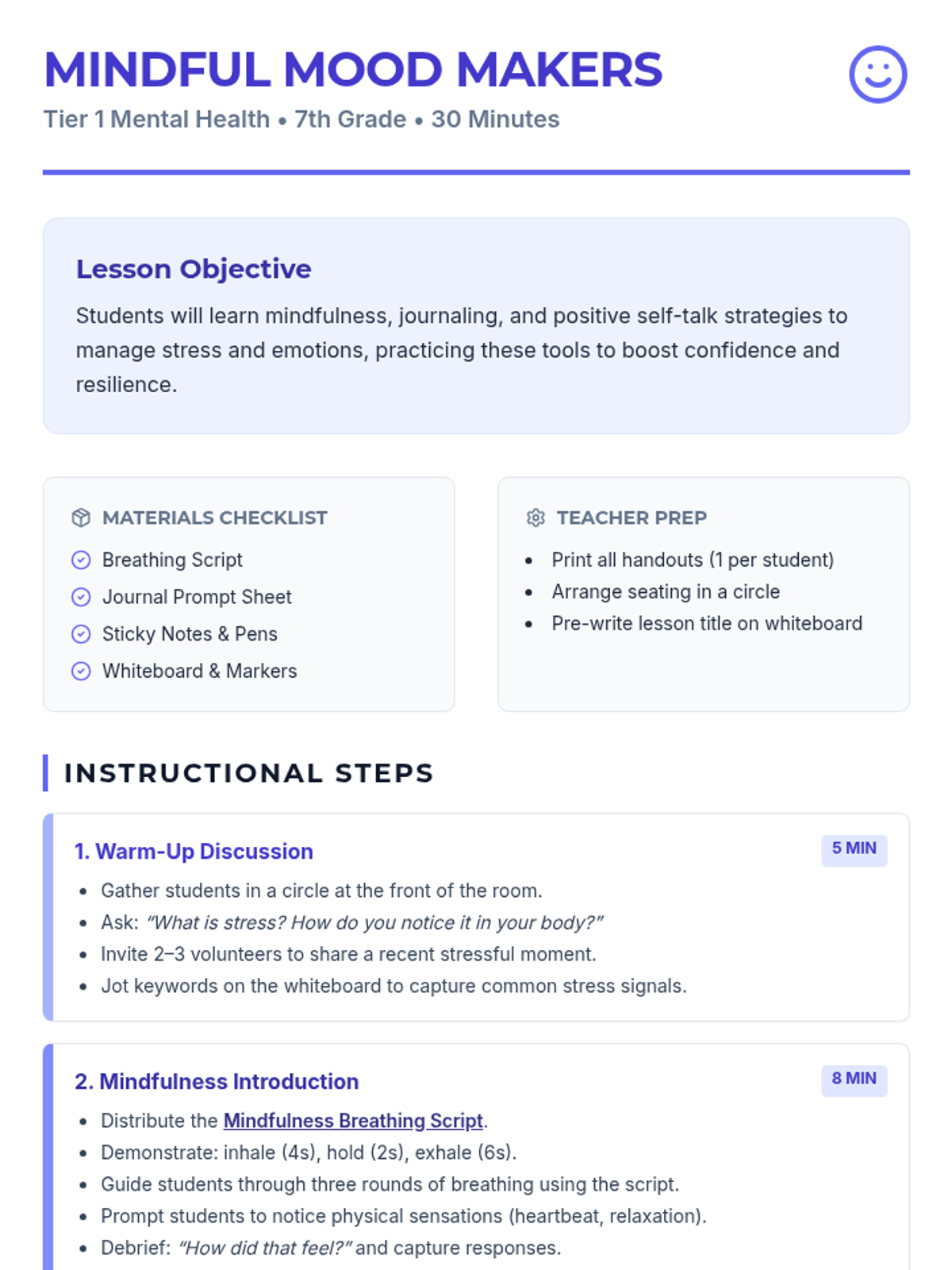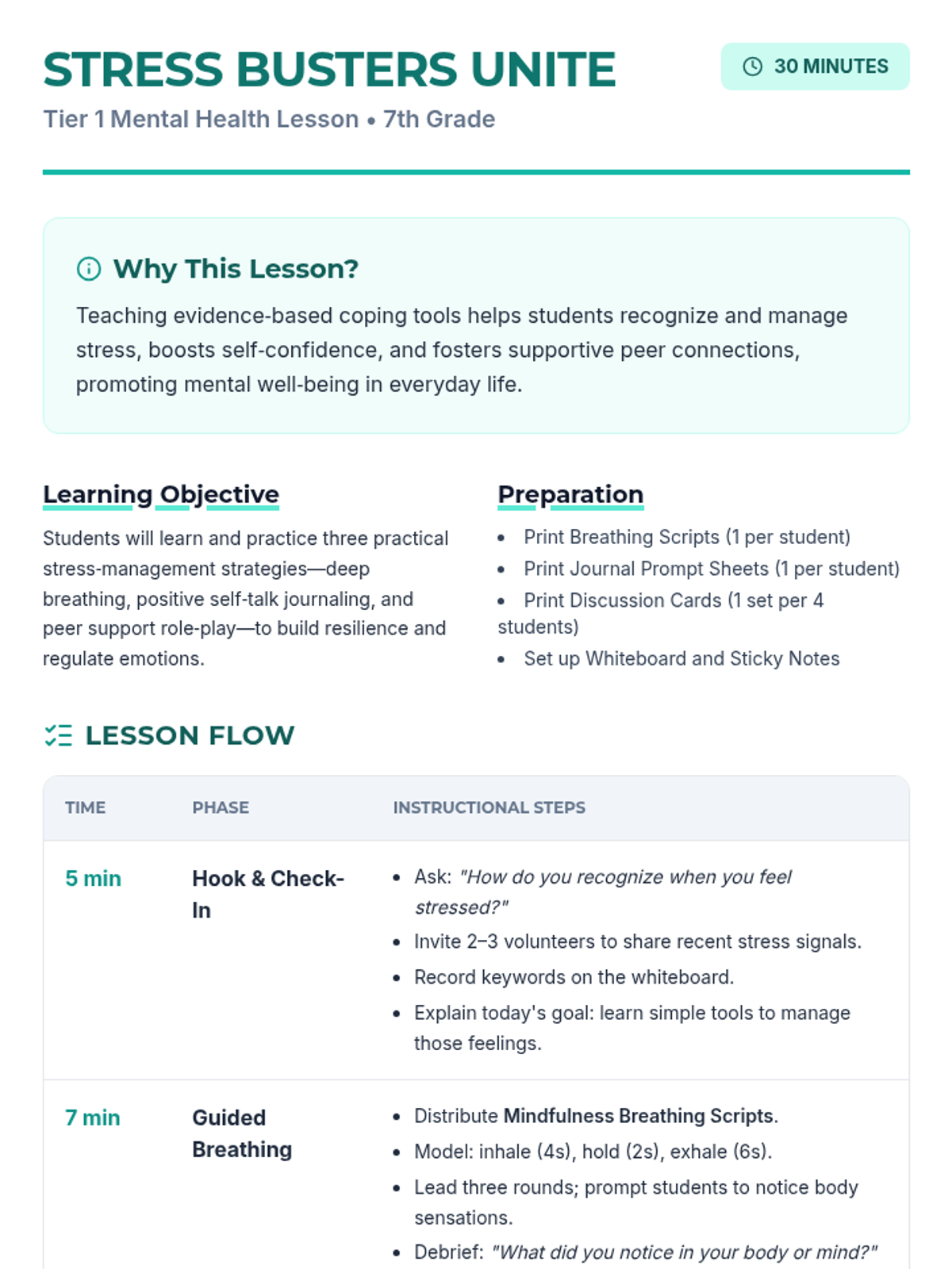A 30-minute Tier 1 mental health lesson for 7th graders focusing on practical stress-management strategies like deep breathing, positive self-talk, and peer support.