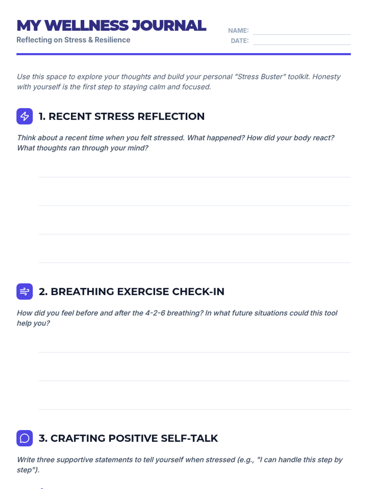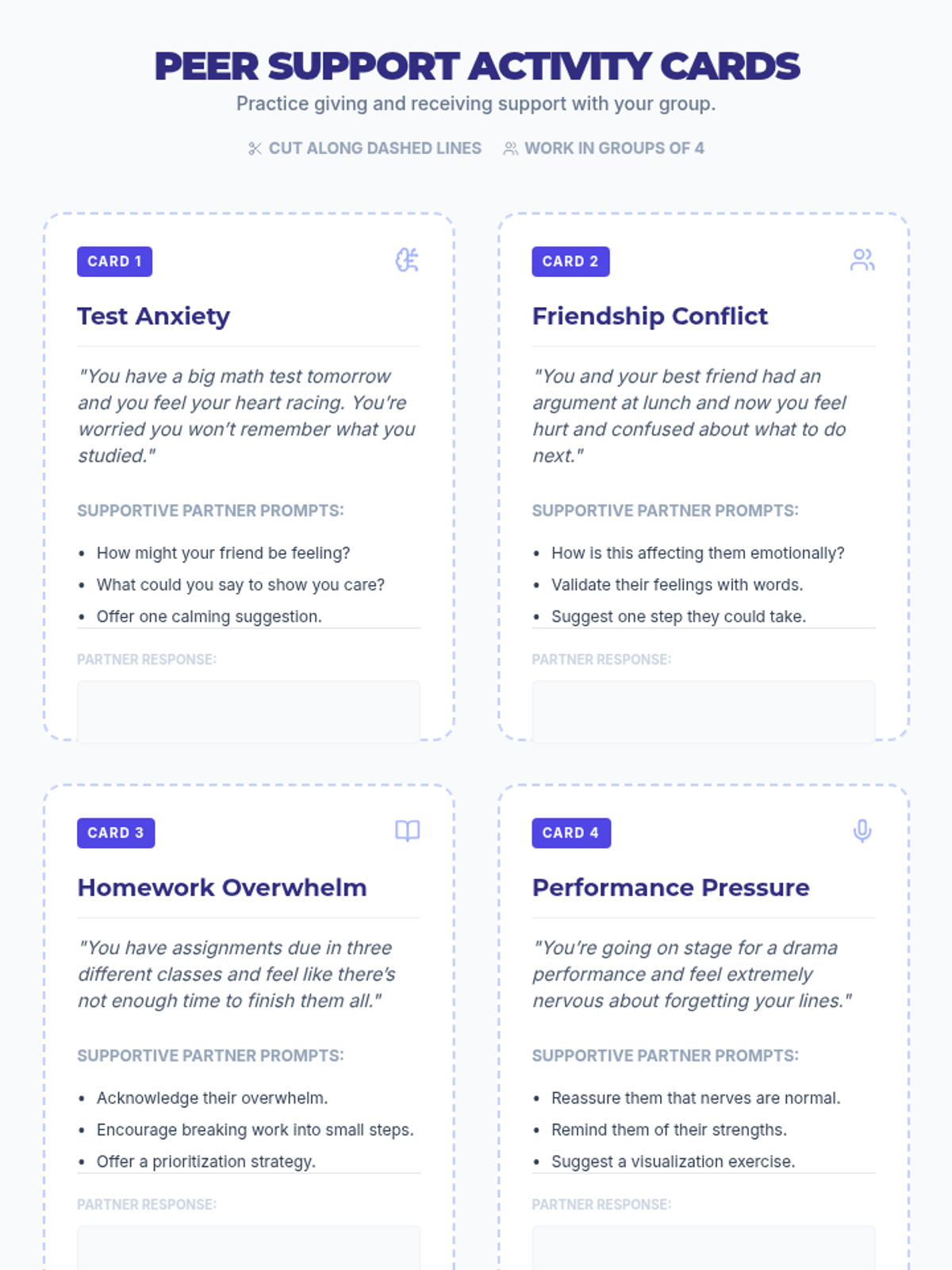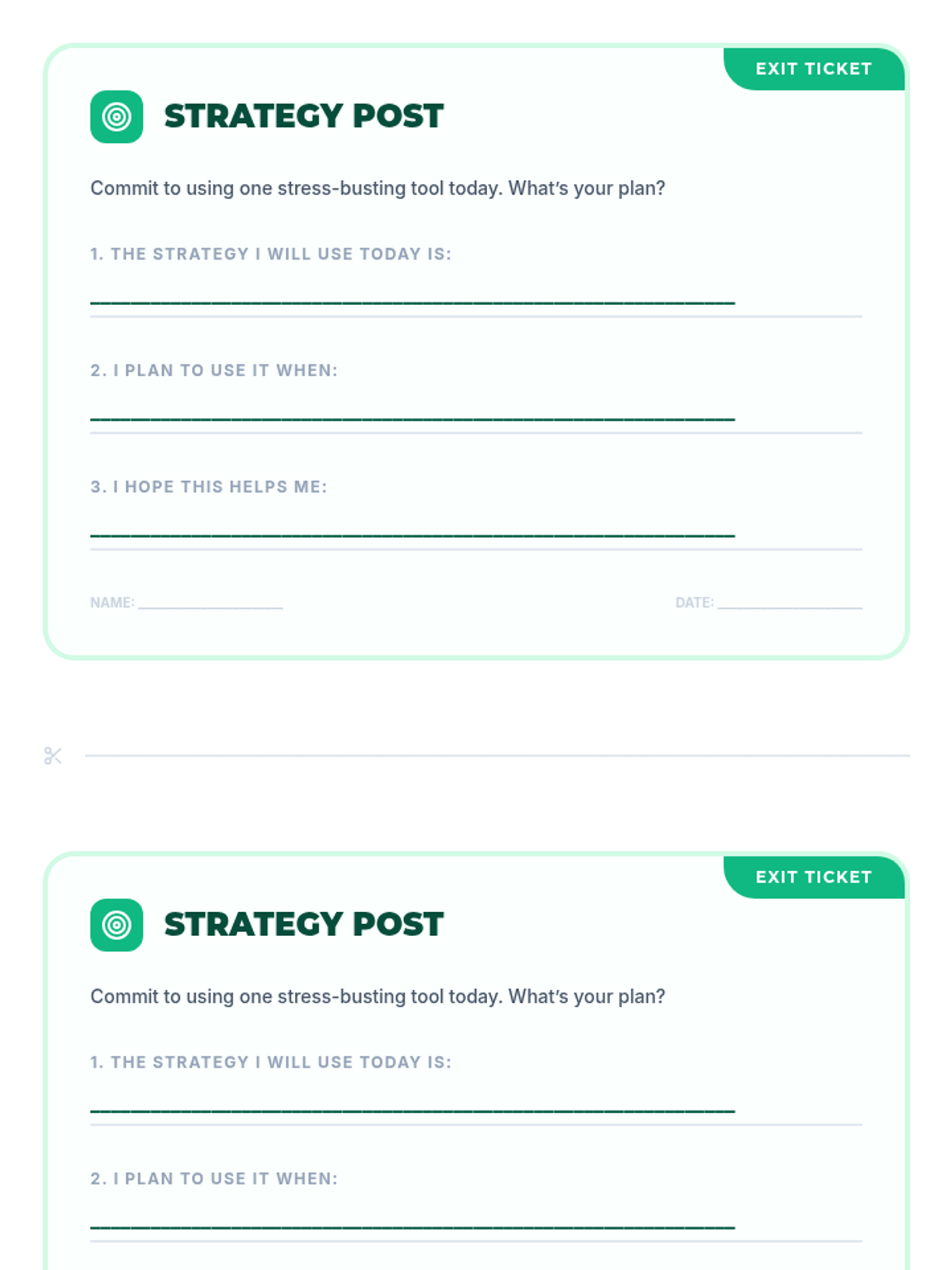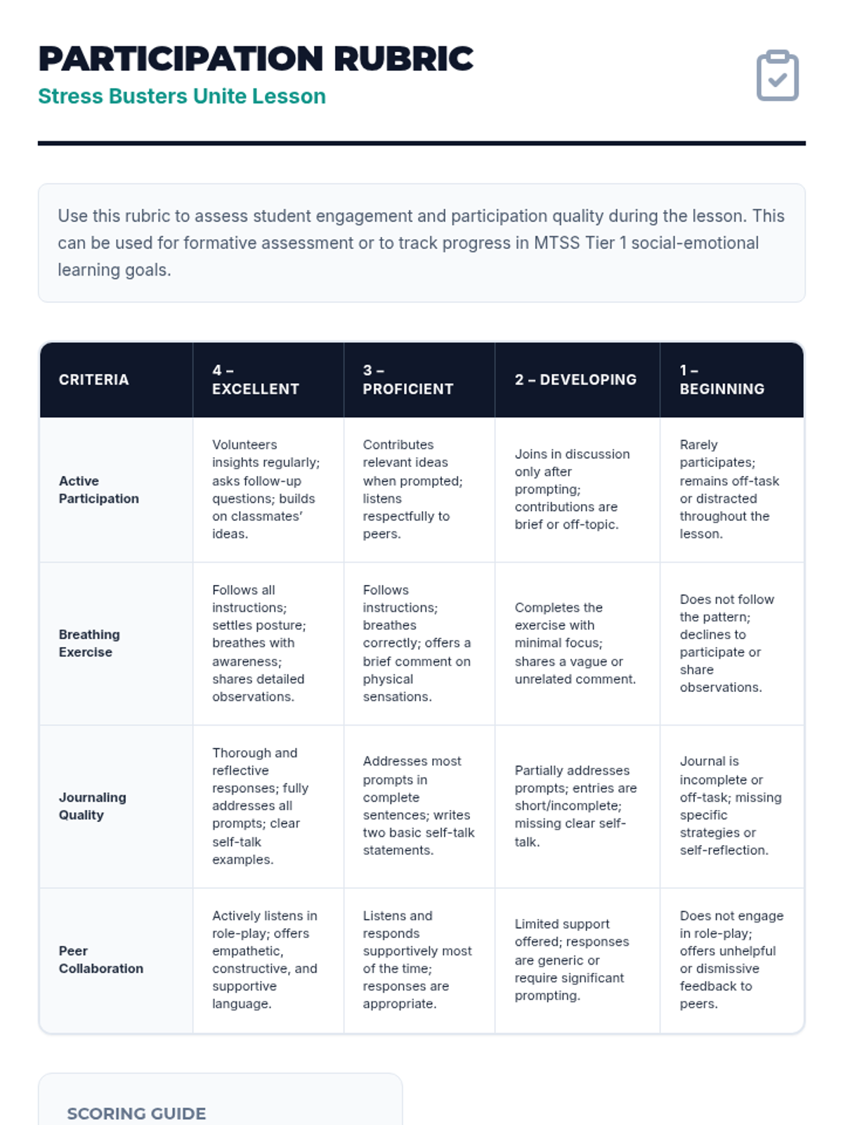 A 30-minute Tier 1 mental health lesson for 7th graders focusing on practical stress-management strategies like deep breathing, positive self-talk, and peer support.
