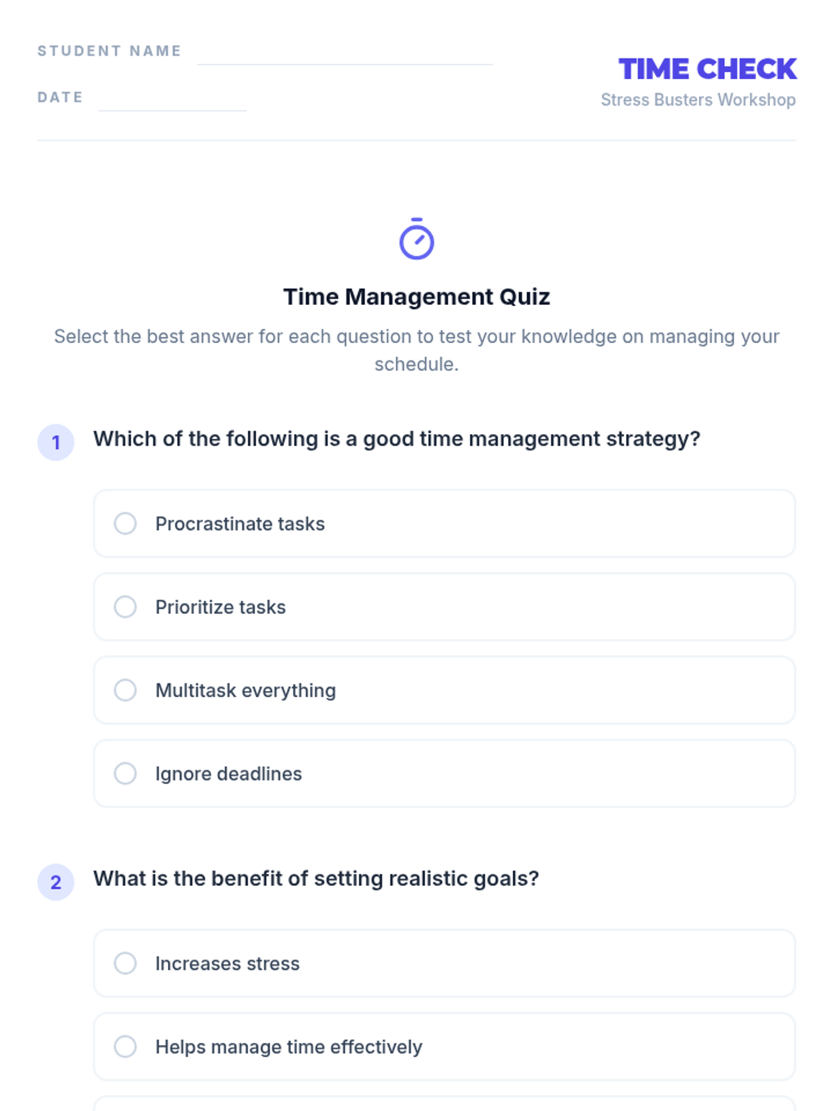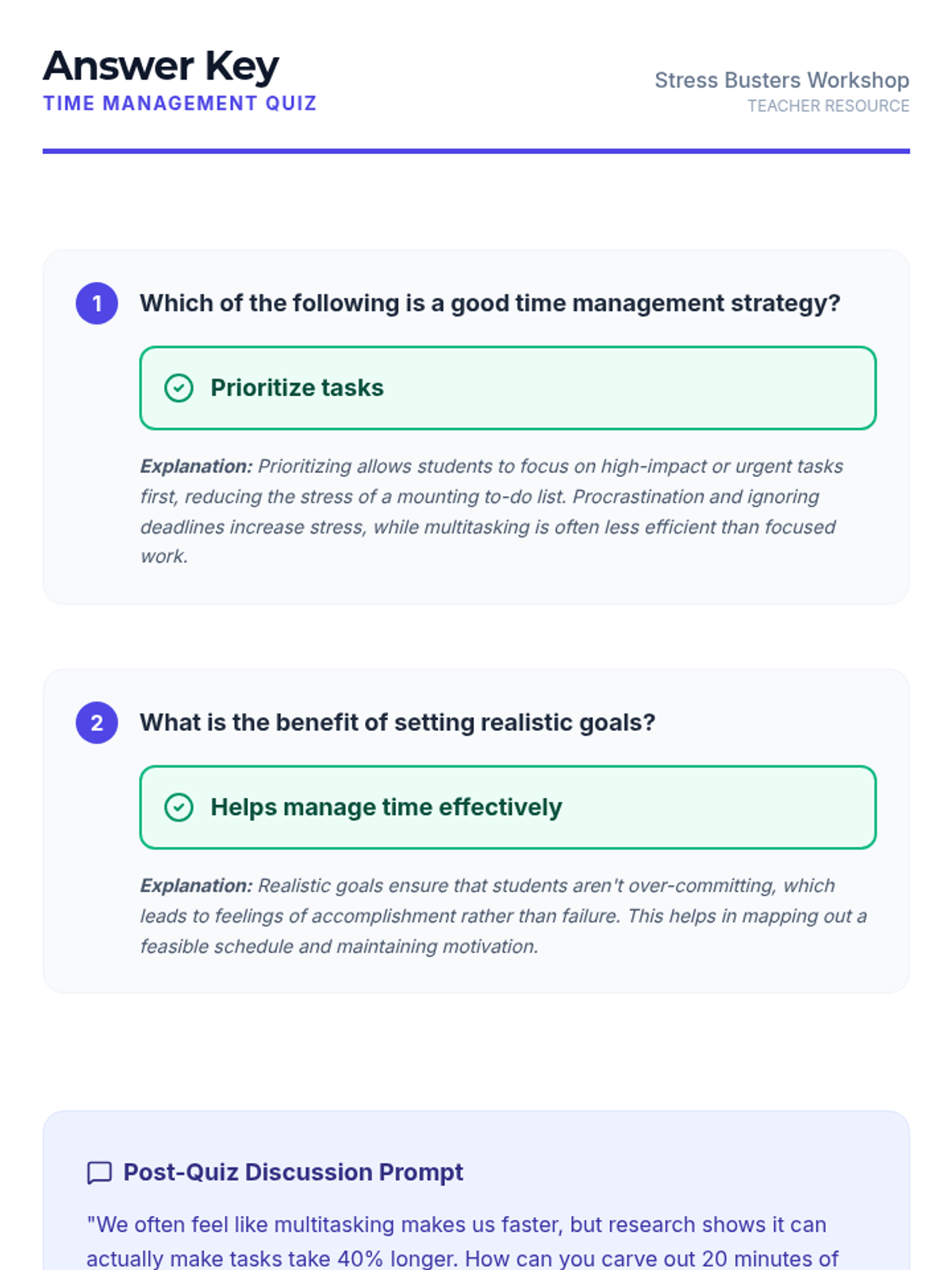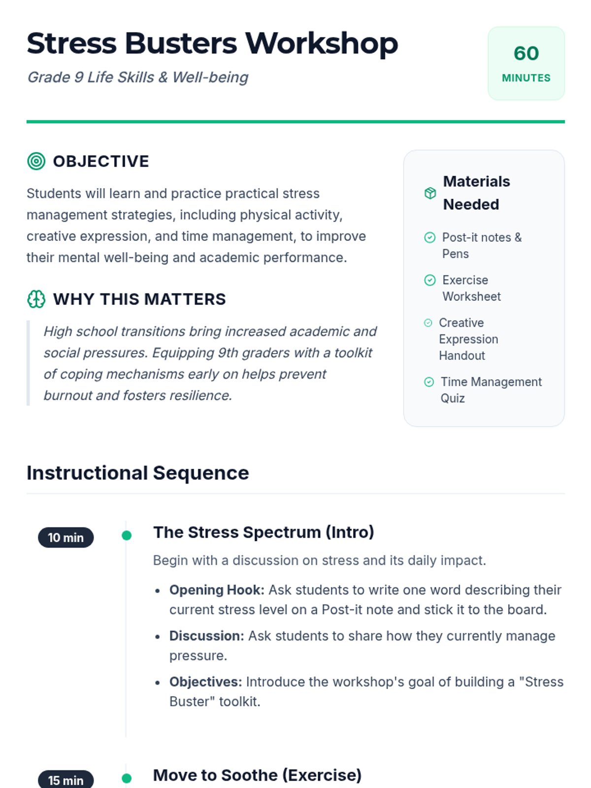 This workshop introduces Grade 9 students to various stress management techniques, including exercise, creative expression, and time management skills. These skills are crucial for helping students manage stress effectively, improve their mental health, and enhance their academic performance.