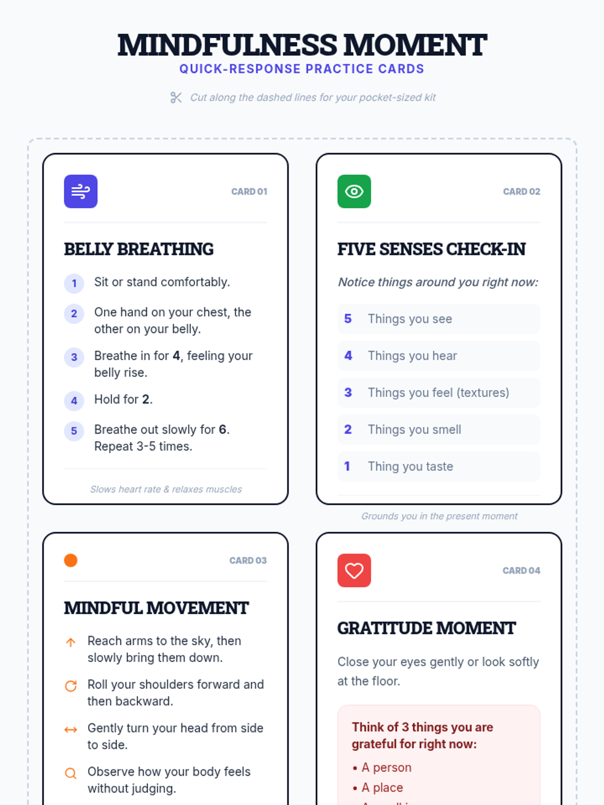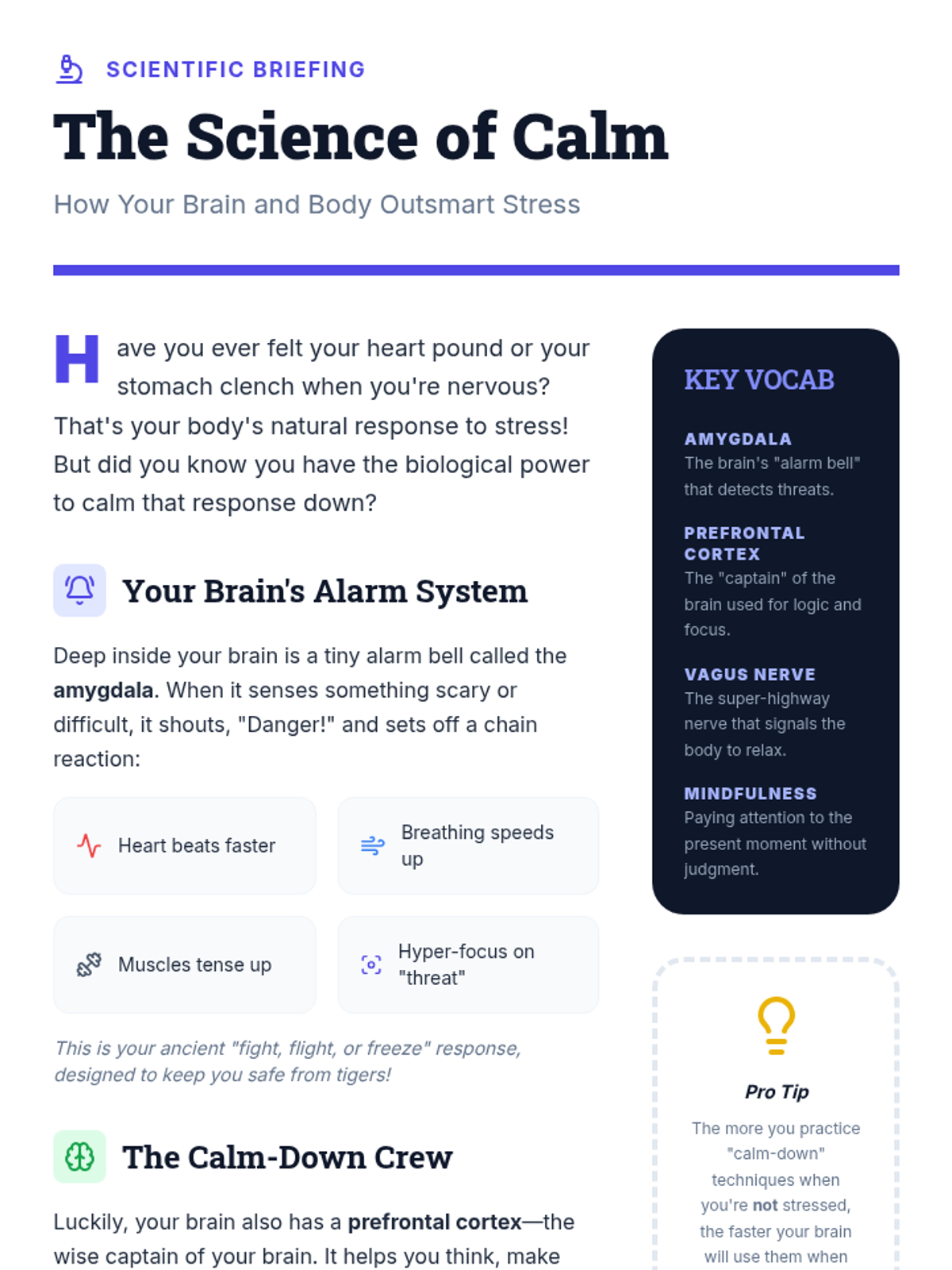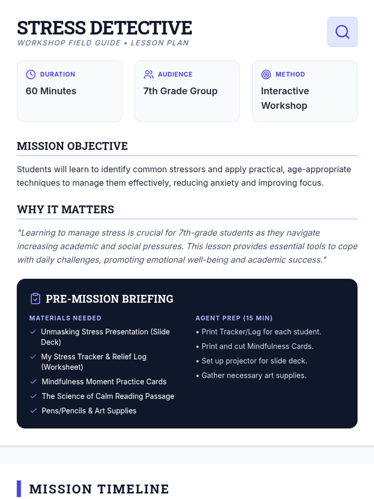 A 60-minute interactive workshop for 7th graders to identify stressors and learn practical mindfulness techniques to manage anxiety and improve focus.