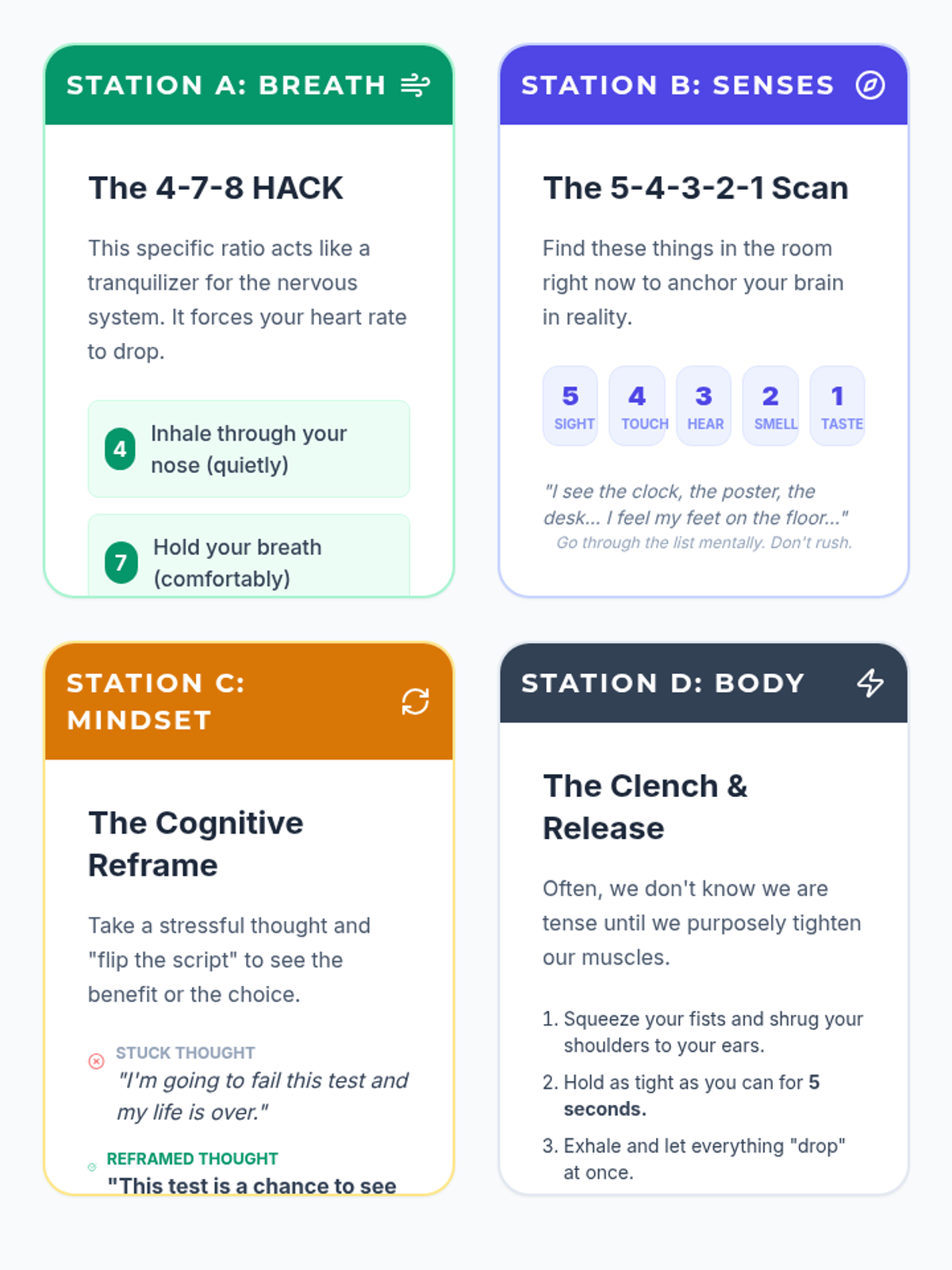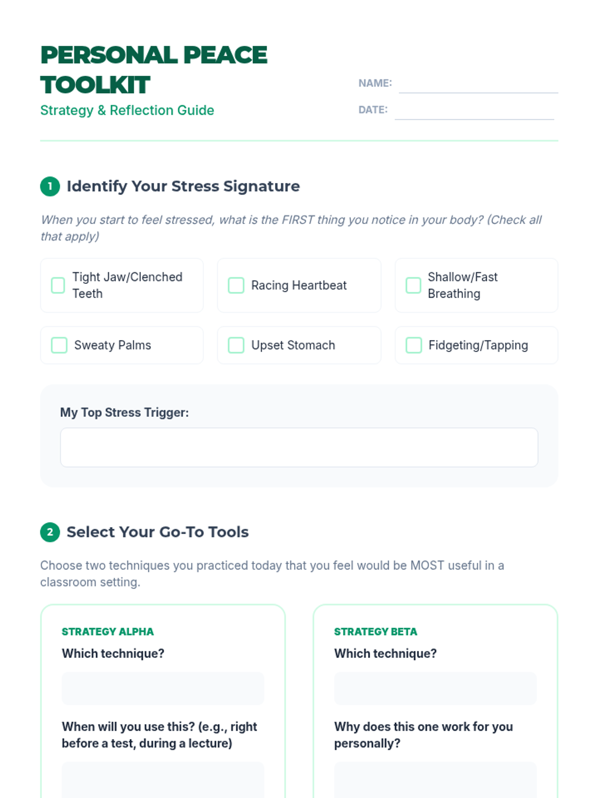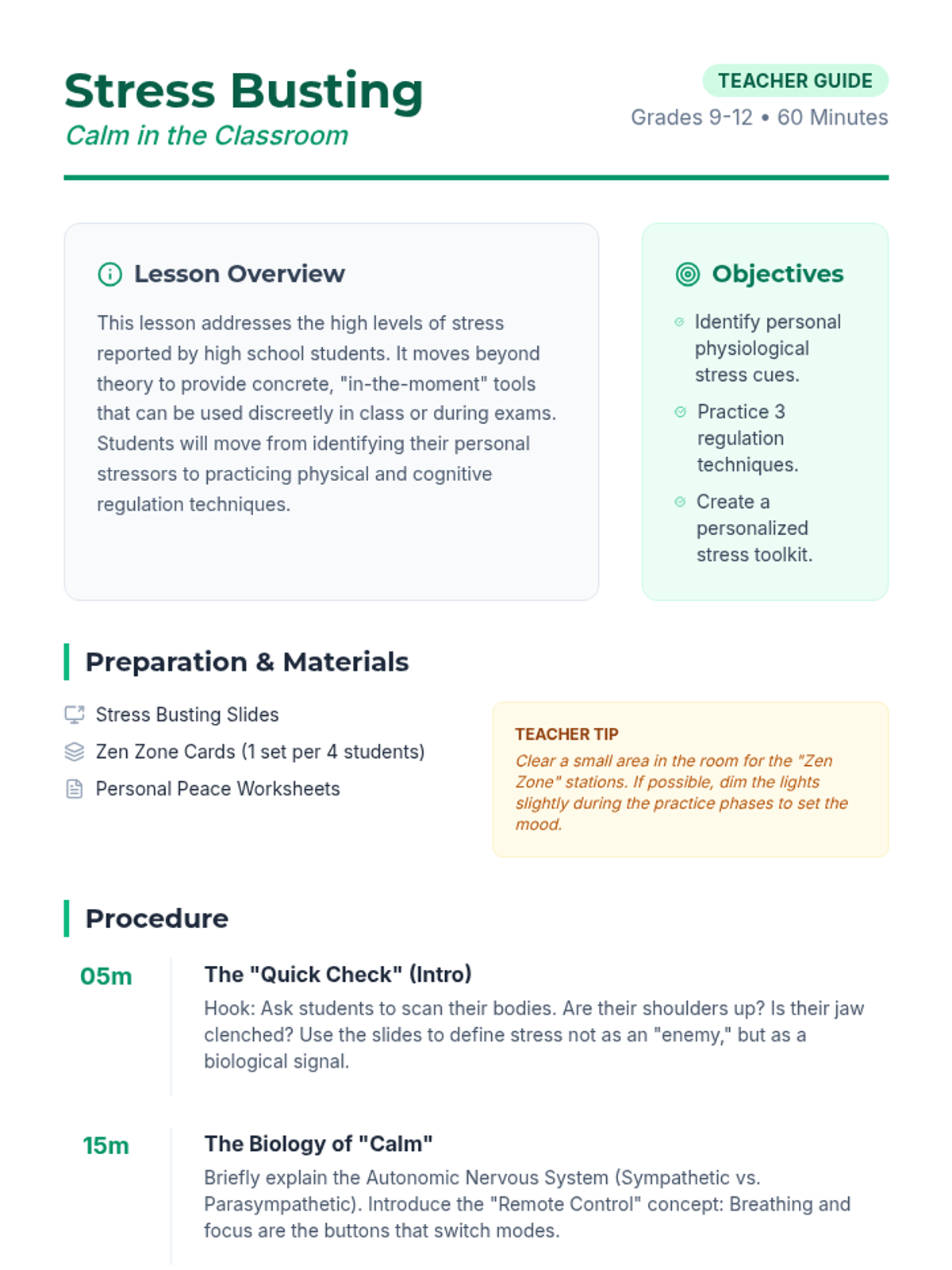 A comprehensive lesson for high schoolers on identifying stress triggers and implementing immediate, practical coping strategies. Students will explore box breathing, grounding techniques, and cognitive reframing.