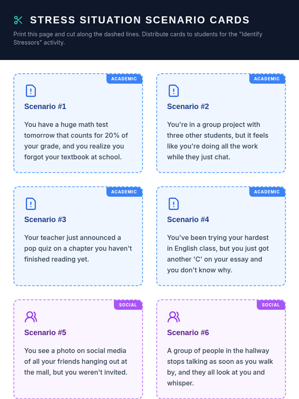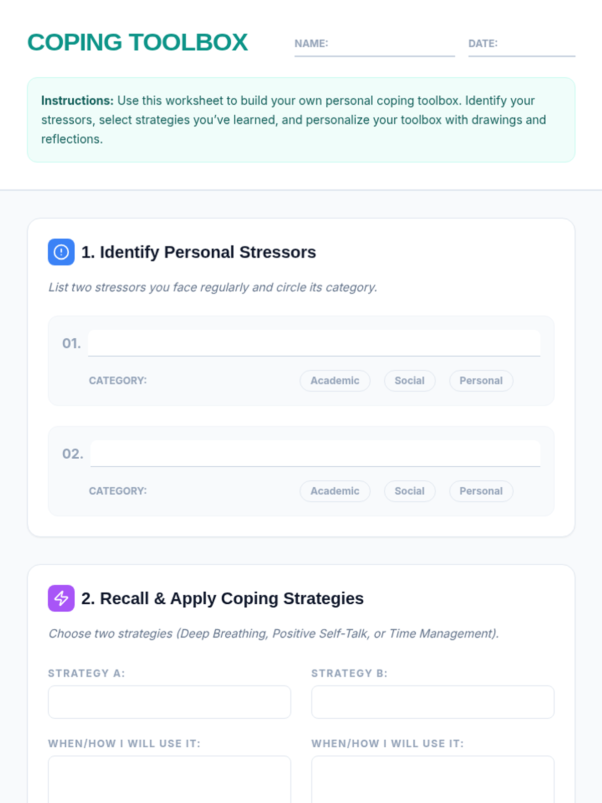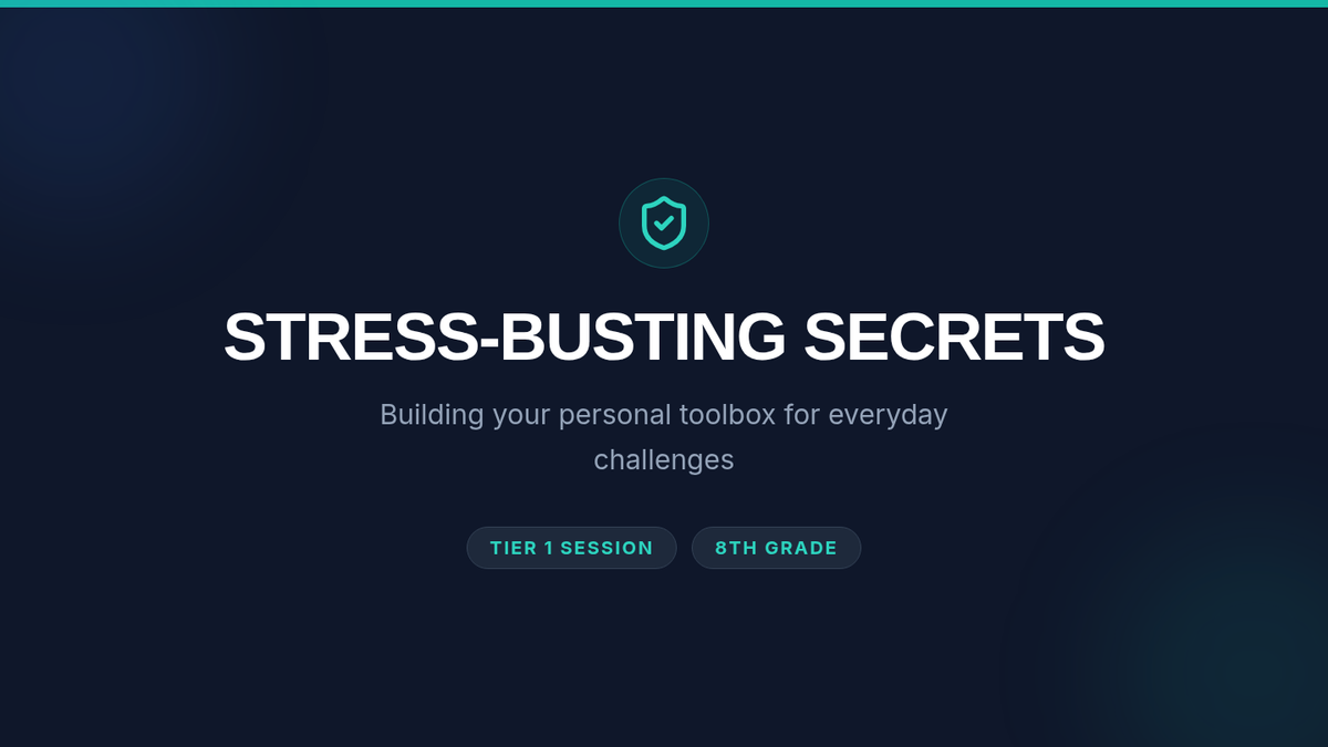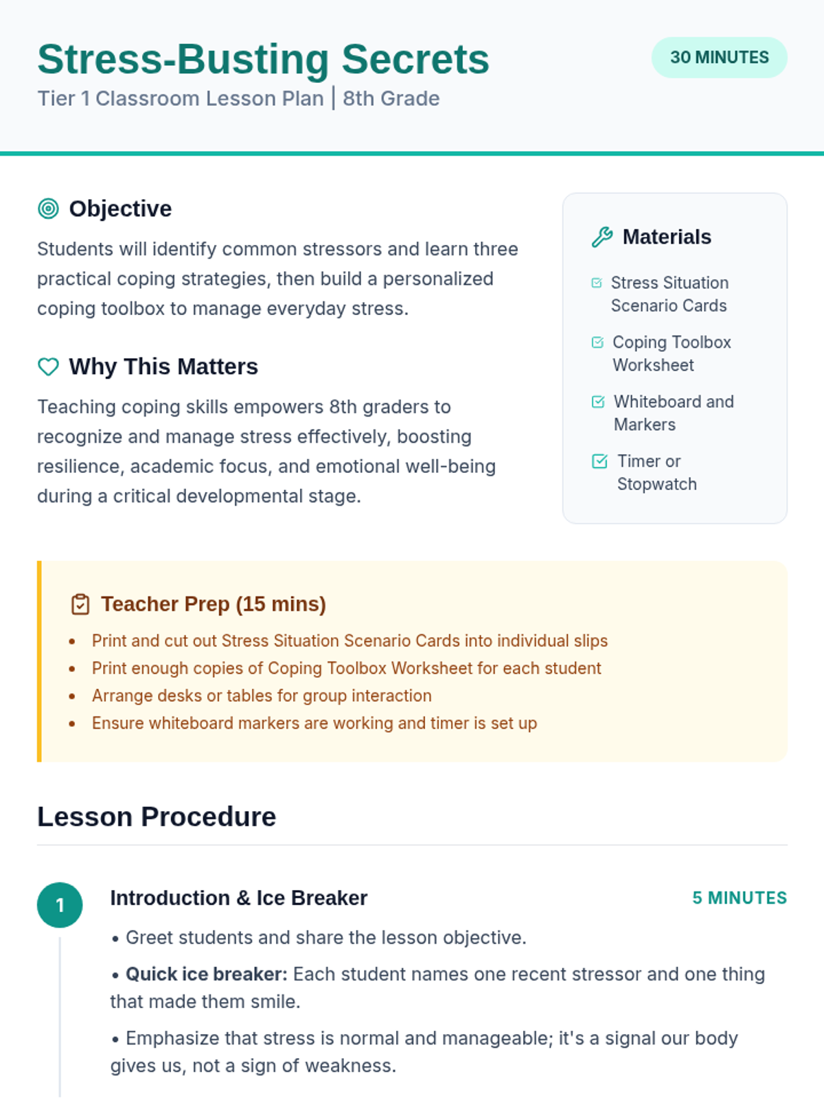 A 30-minute Tier 1 lesson for 8th graders focused on identifying stressors and building a personal coping toolbox with practical strategies like deep breathing and positive self-talk.