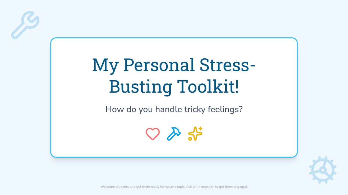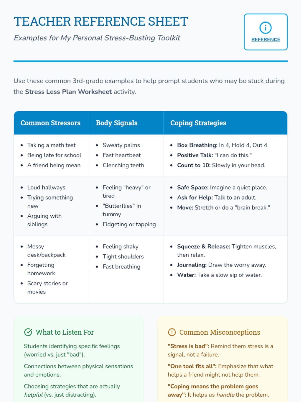 A 20-minute 3rd-grade lesson focused on identifying personal stressors and building a "toolkit" of healthy coping strategies to manage difficult emotions.