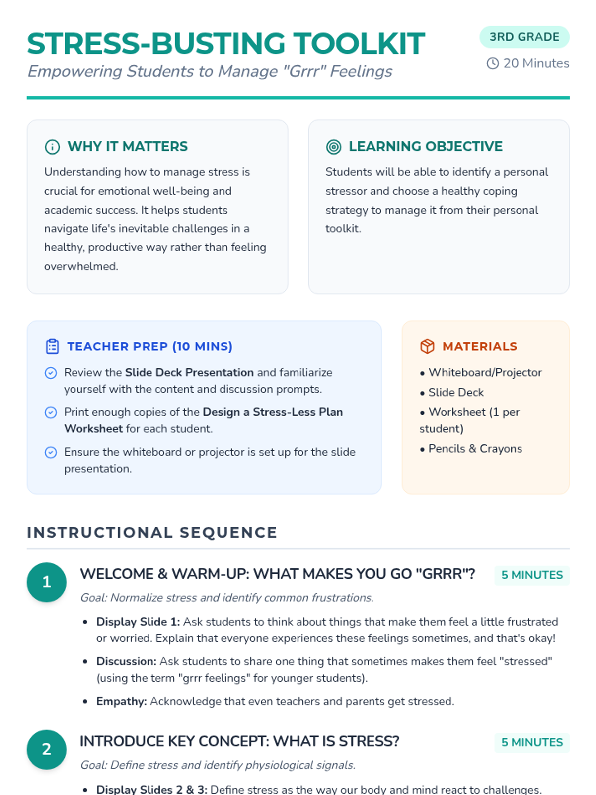 A 20-minute social-emotional learning lesson for 3rd graders to identify personal stressors and build a toolkit of healthy coping strategies.