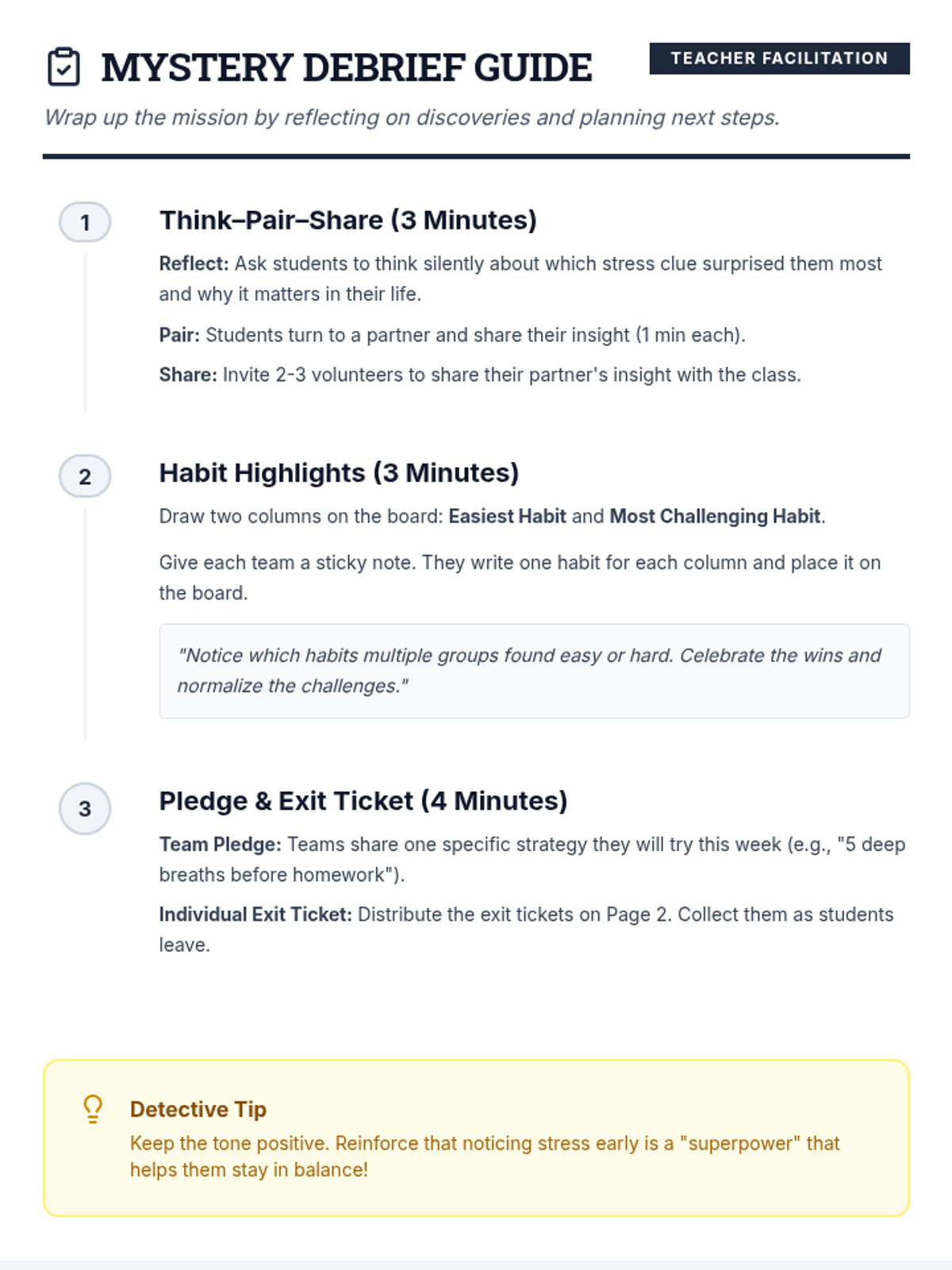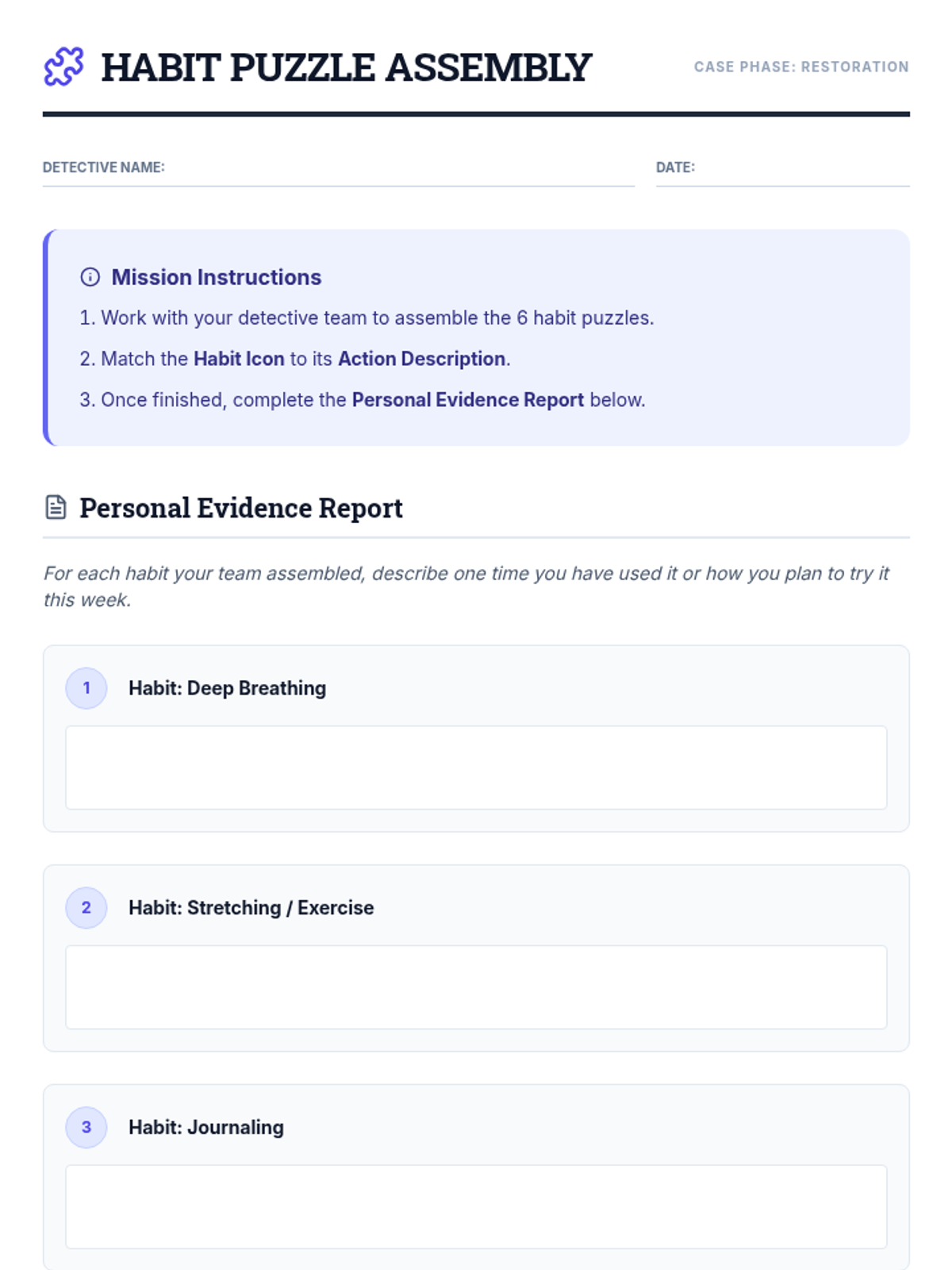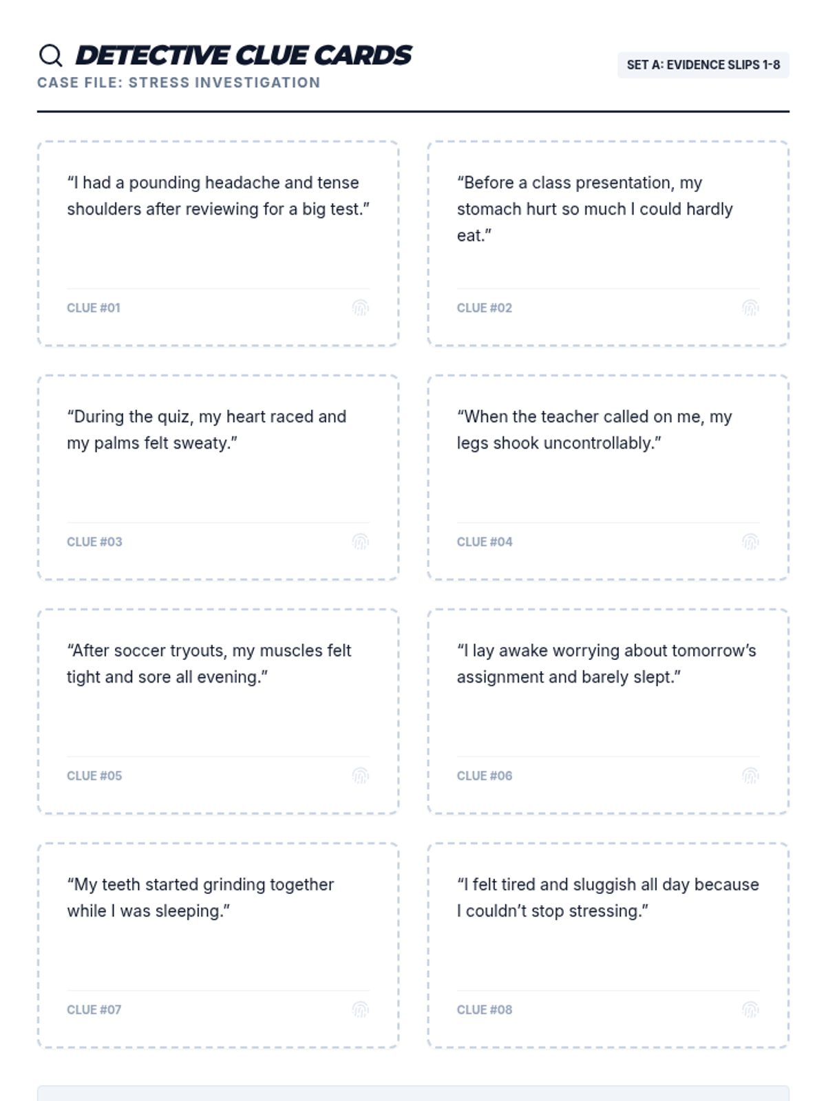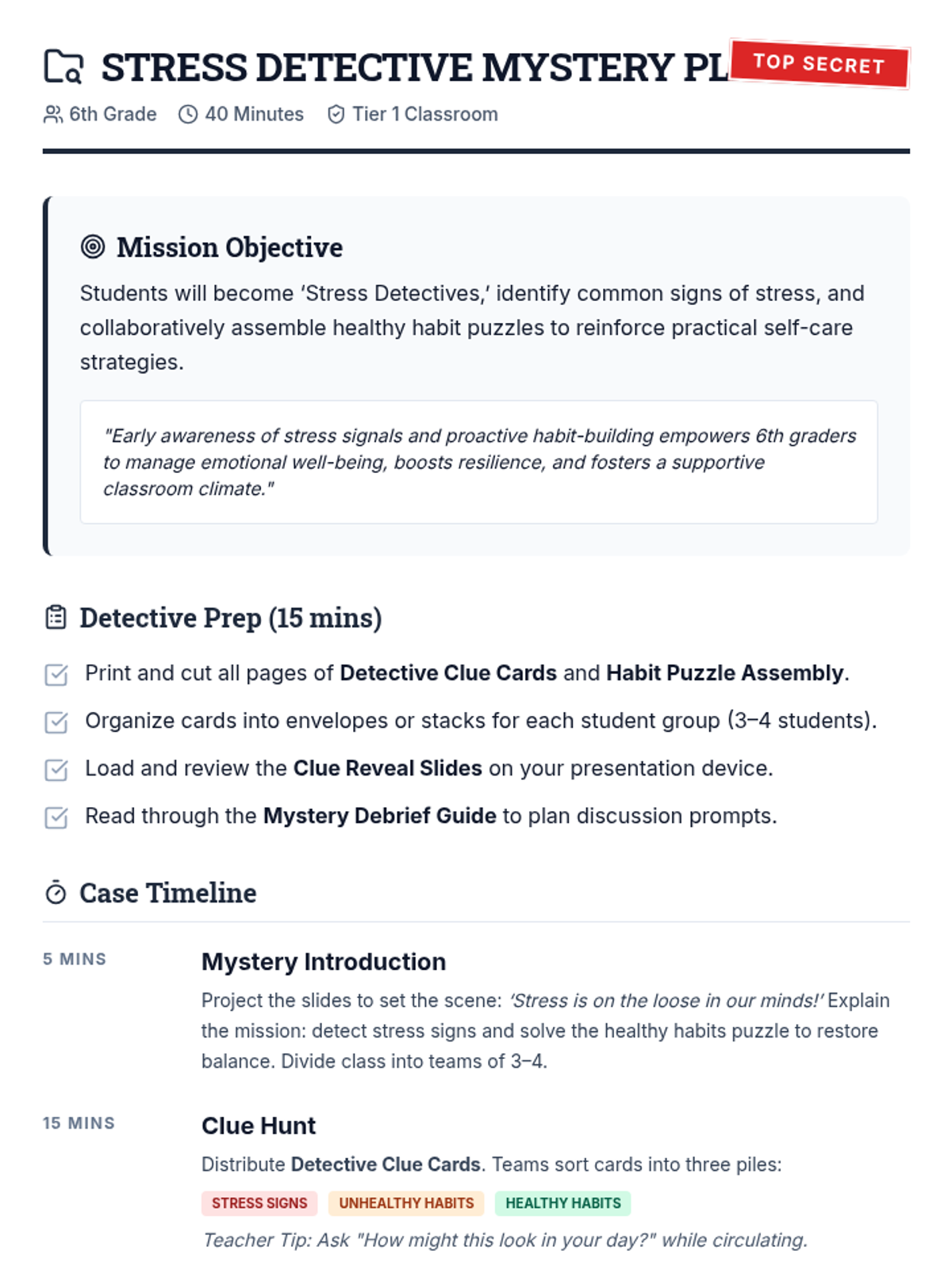A 40-minute Tier 1 mystery game where 6th graders identify signs of stress and assemble healthy habit puzzles to build resilience and self-care skills.