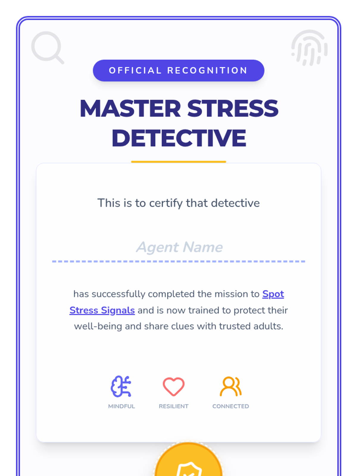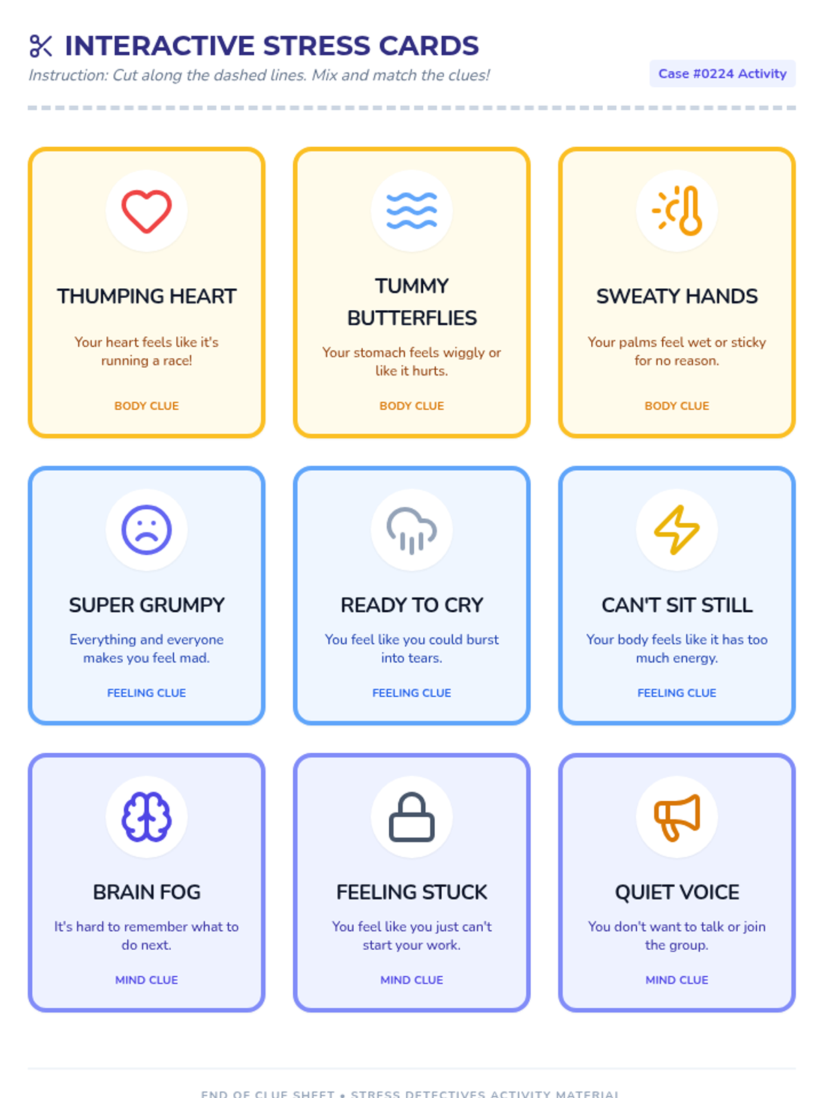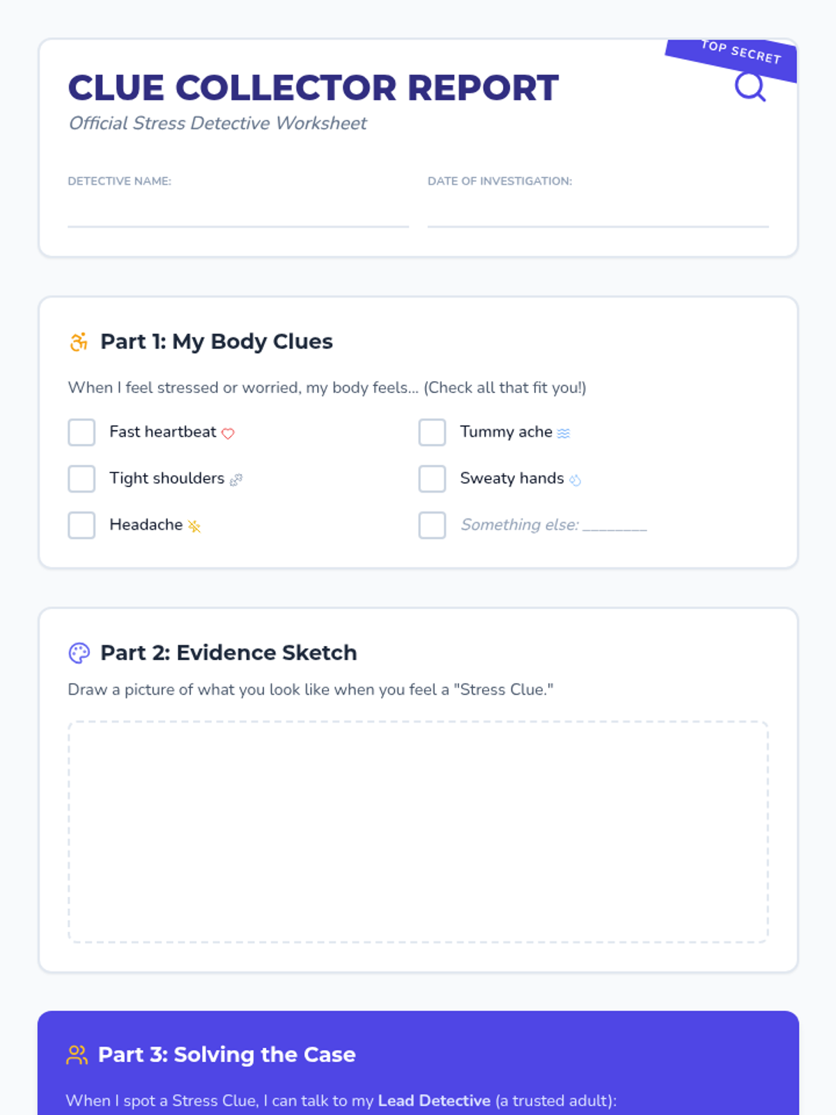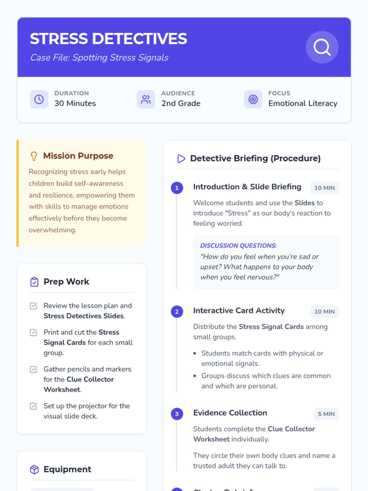 A 30-minute lesson for 2nd graders to help them identify physical and emotional signs of stress using a fun detective theme.