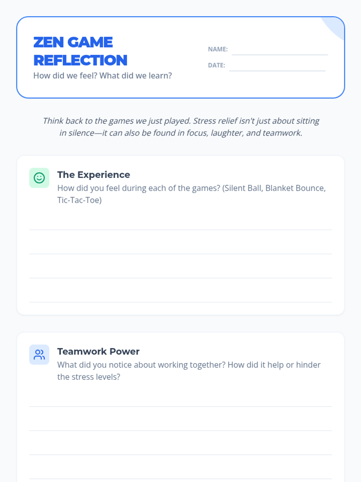 A 40-minute Tier 1 classroom lesson designed for middle schoolers to learn stress relief through interactive games like Silent Ball and Blanket Bounce. Students explore coordination, teamwork, and mindfulness in a high-energy yet relaxing environment.