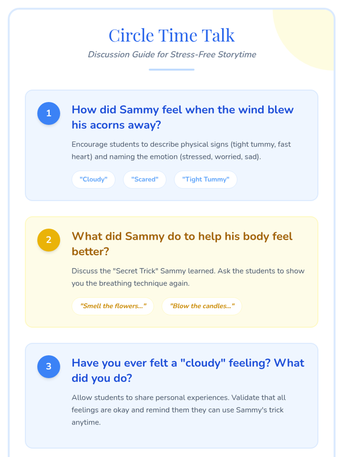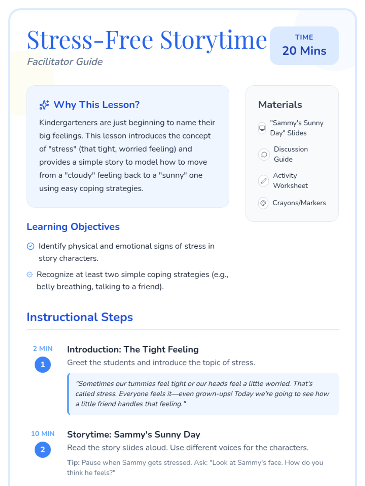 A 20-minute social-emotional learning lesson for Kindergarteners focused on identifying stress and learning simple coping strategies through a story and interactive discussion.