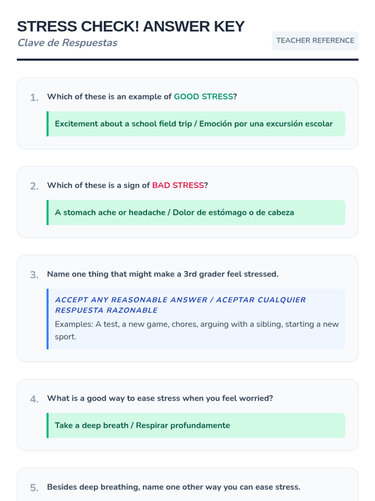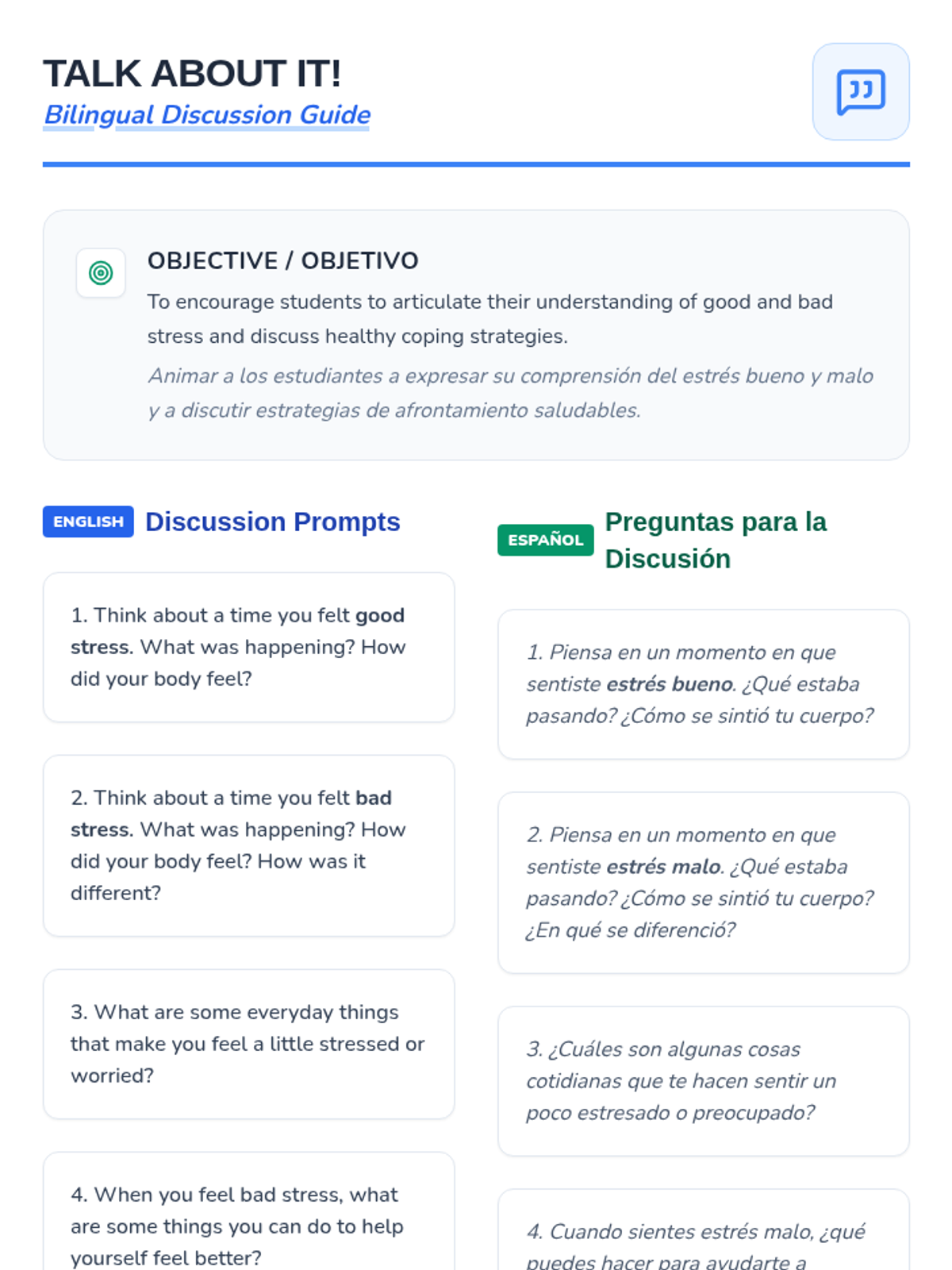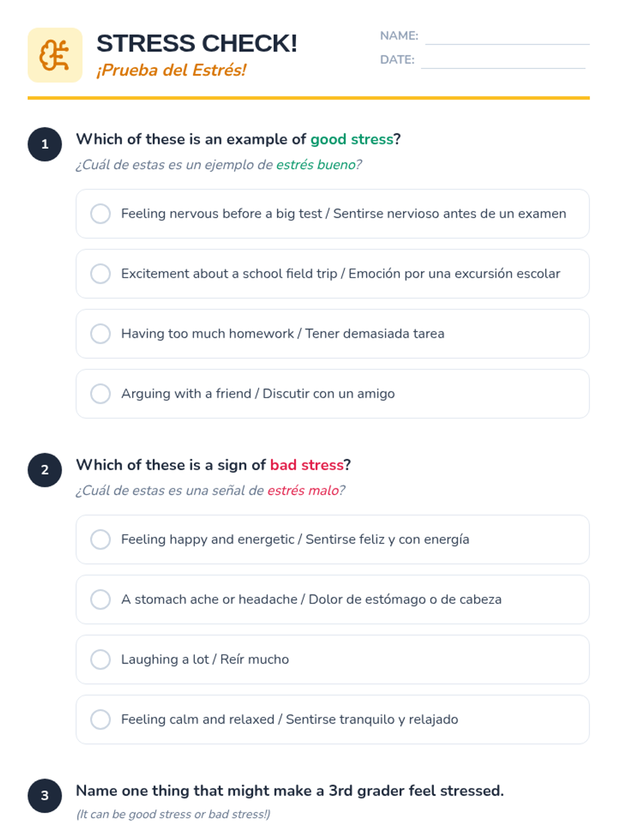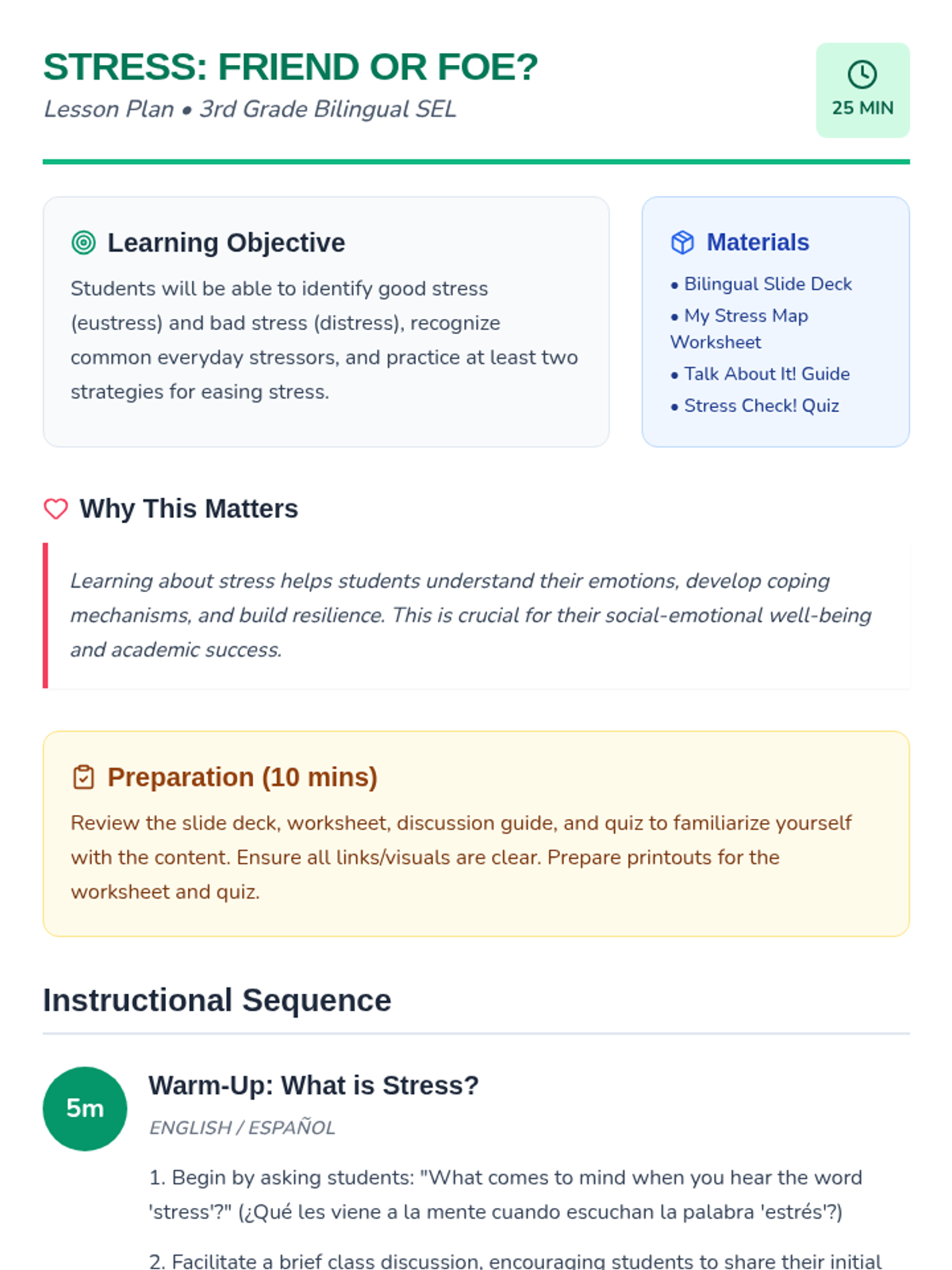 A 25-minute bilingual SEL lesson for 3rd graders to distinguish between good and bad stress and learn effective coping strategies.