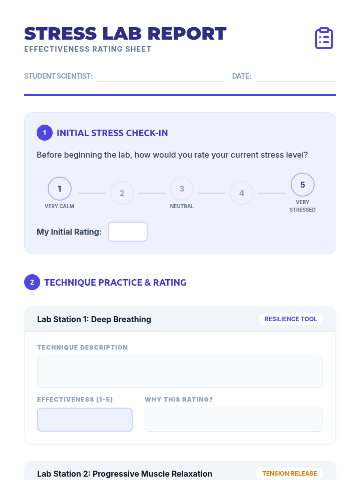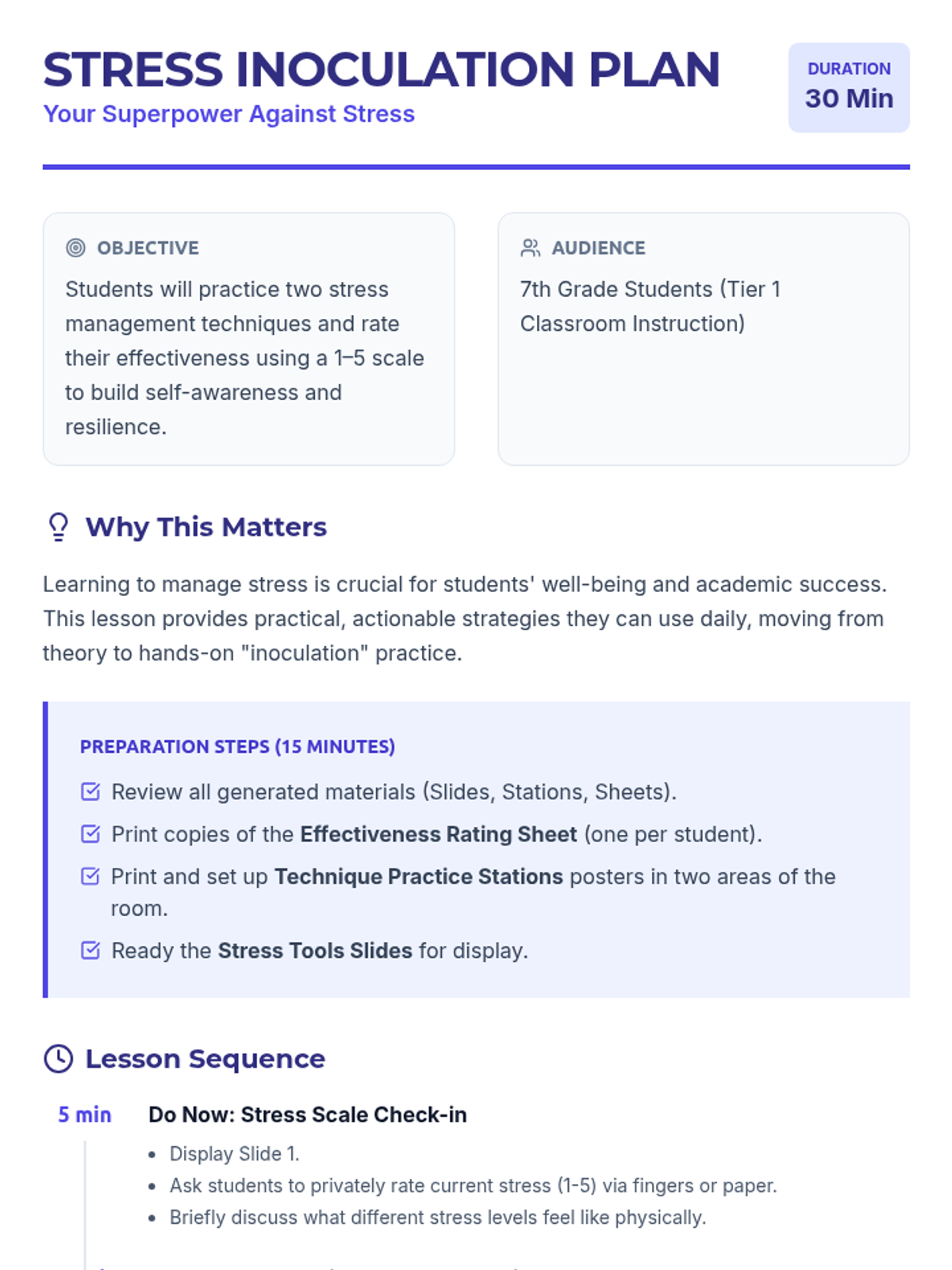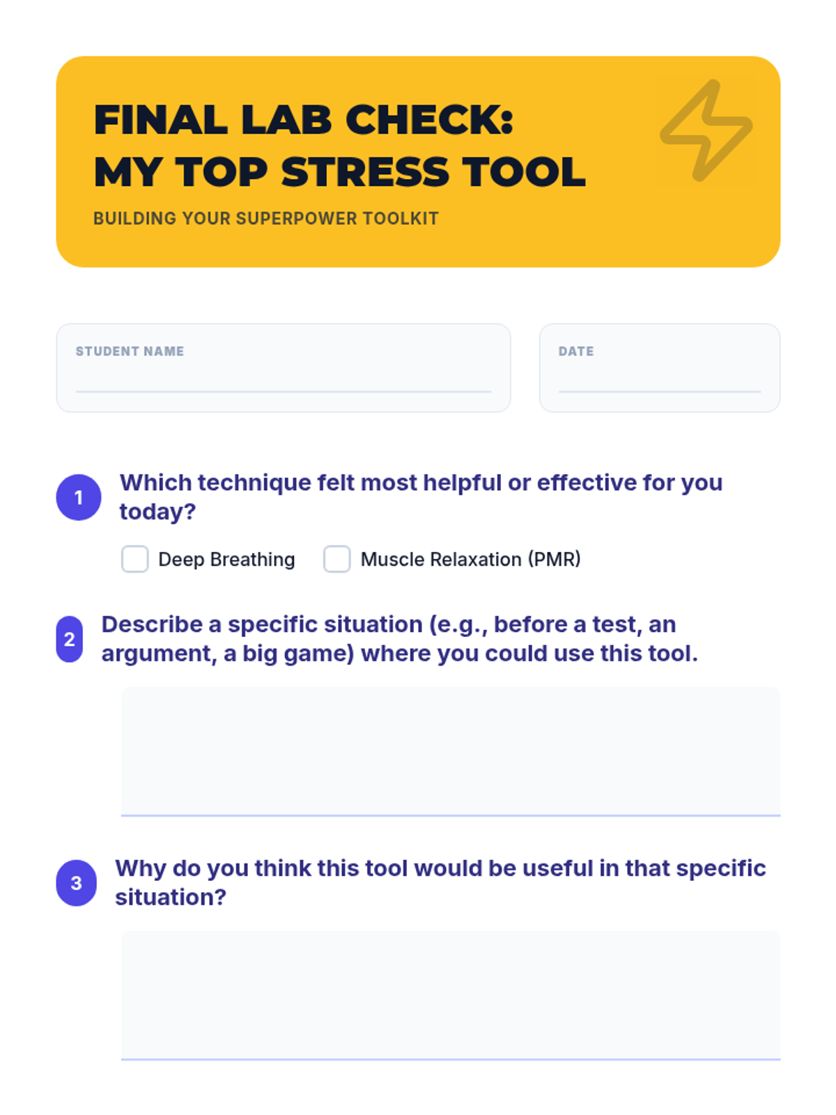 A 30-minute interactive lab where 7th graders learn and practice deep breathing and progressive muscle relaxation to build their stress management 'superpowers'.