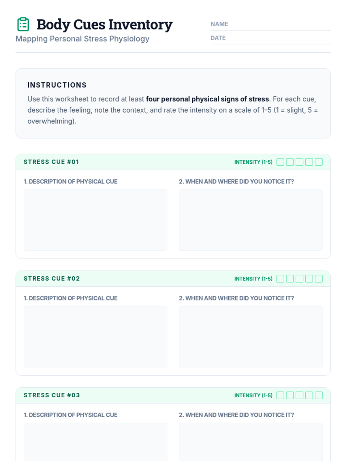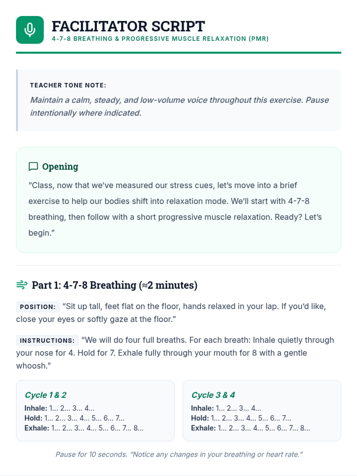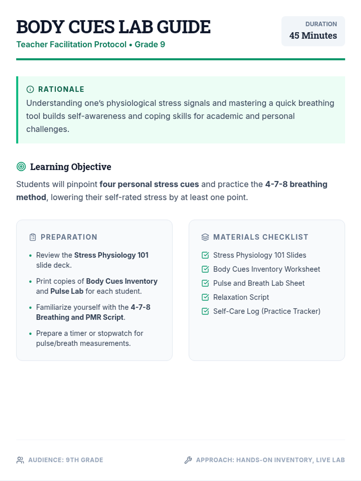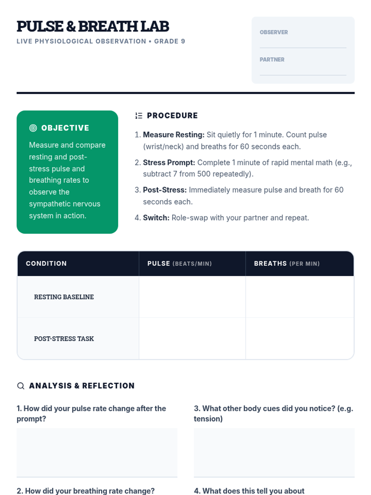 A 45-minute real-time lab where 9th graders explore physiological stress responses by mapping personal cues and practicing the 4-7-8 breathing method. Students measure pulse and breath rates to observe the autonomic nervous system in action.