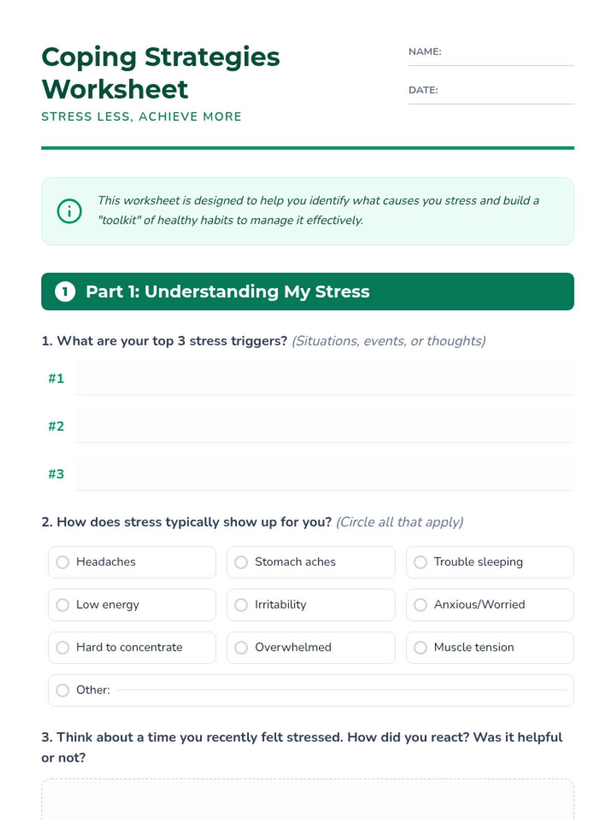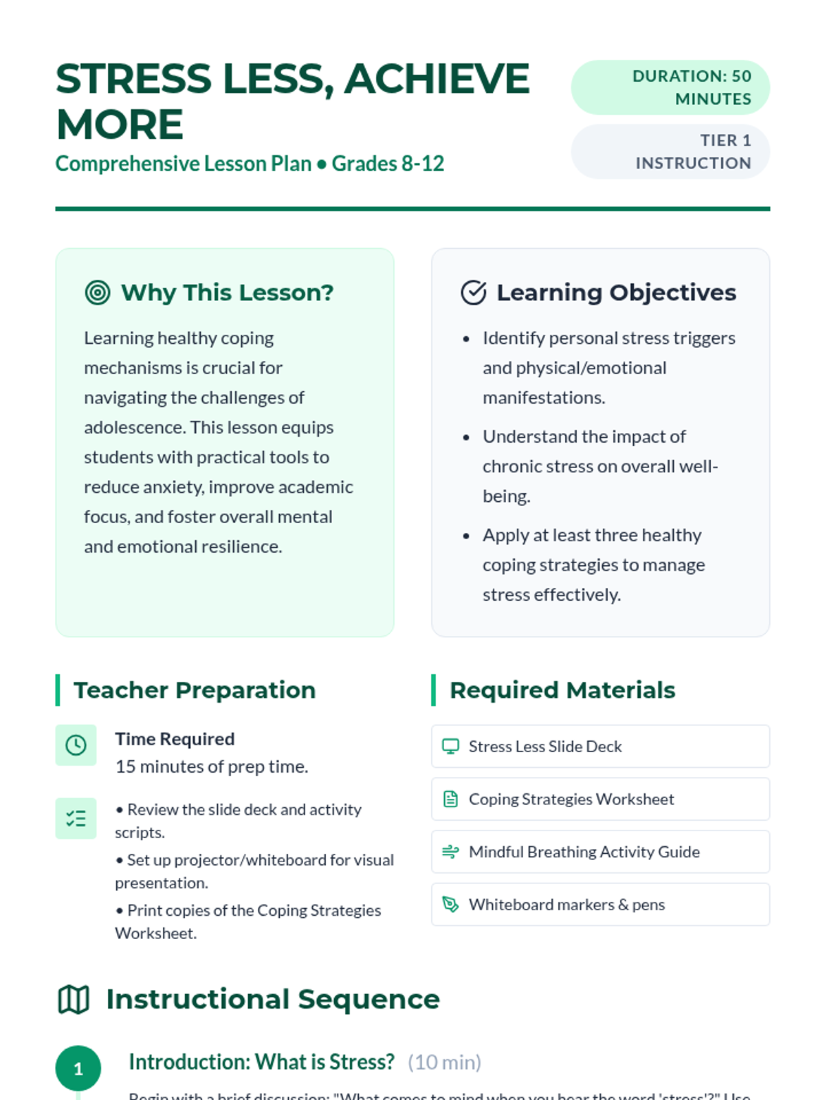 A comprehensive lesson for grades 8-12 focused on identifying stress triggers and developing healthy, practical coping mechanisms for academic and personal well-being.