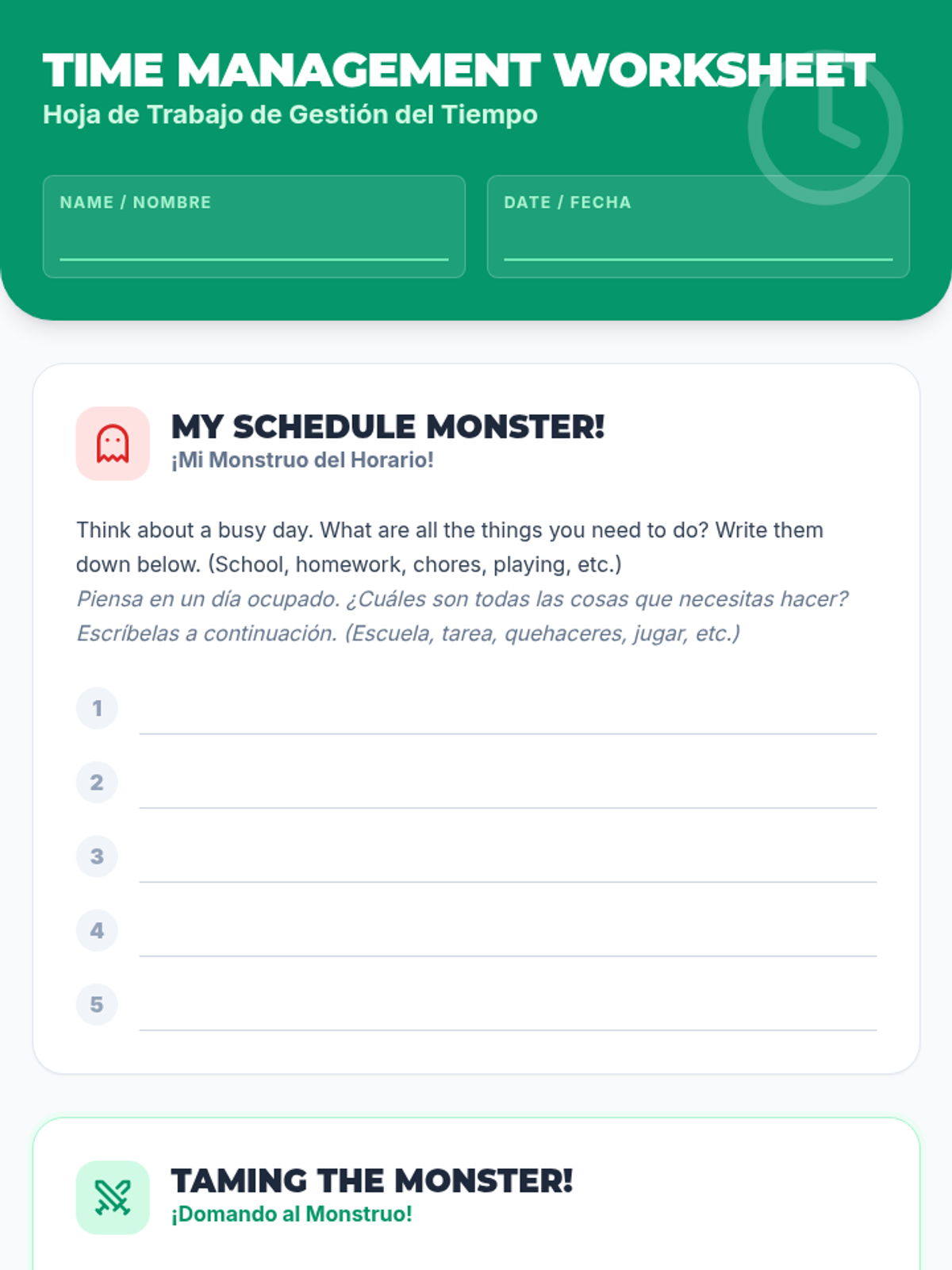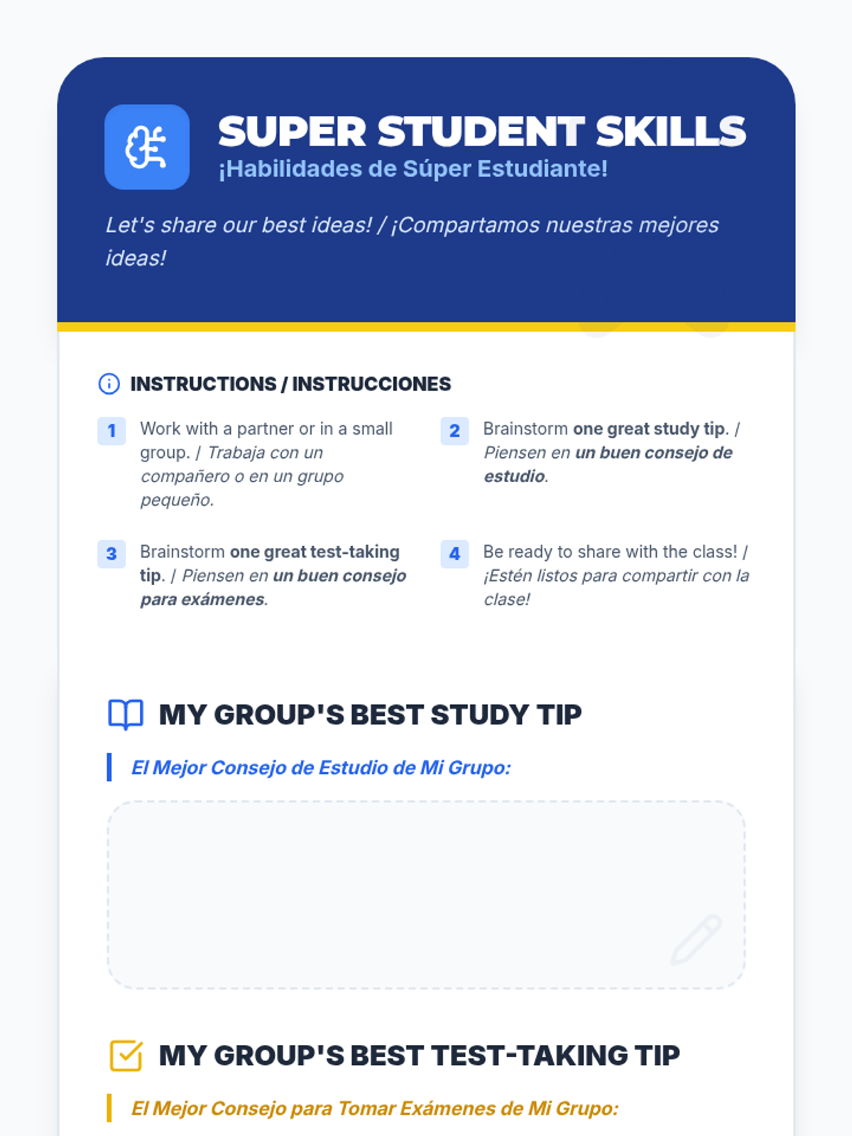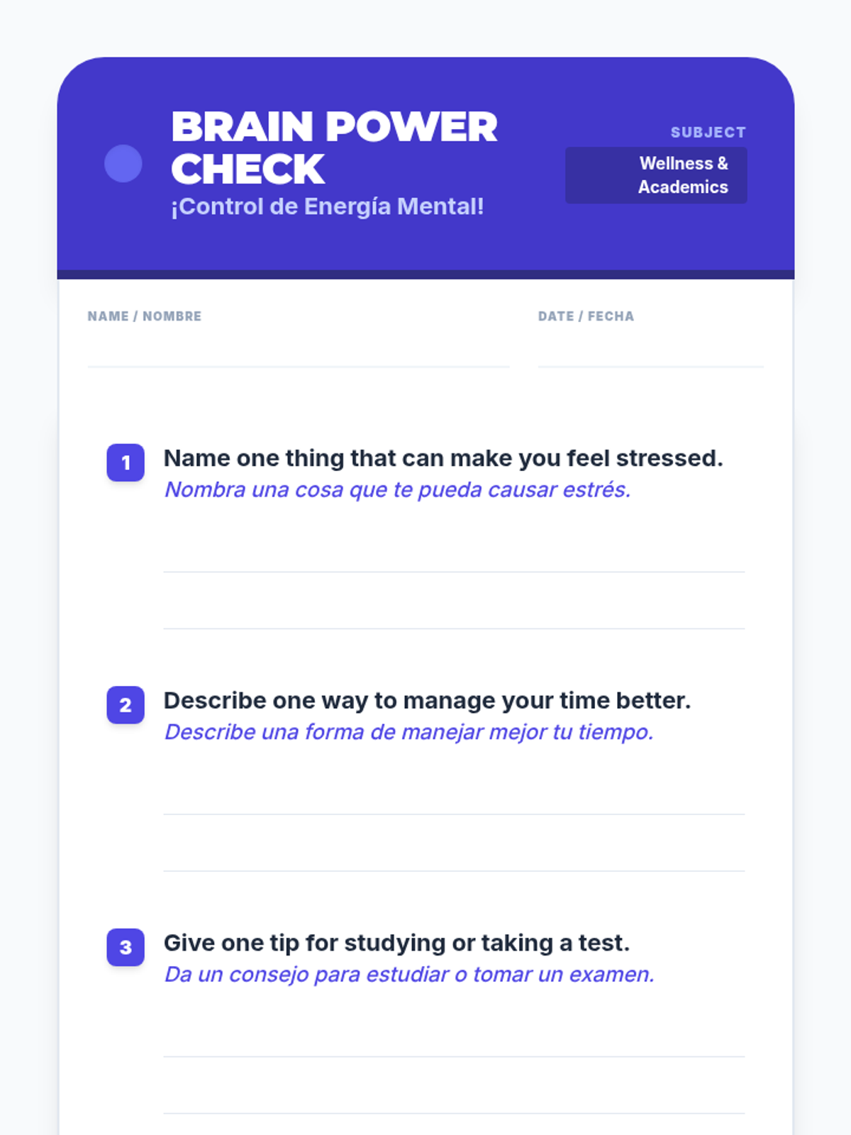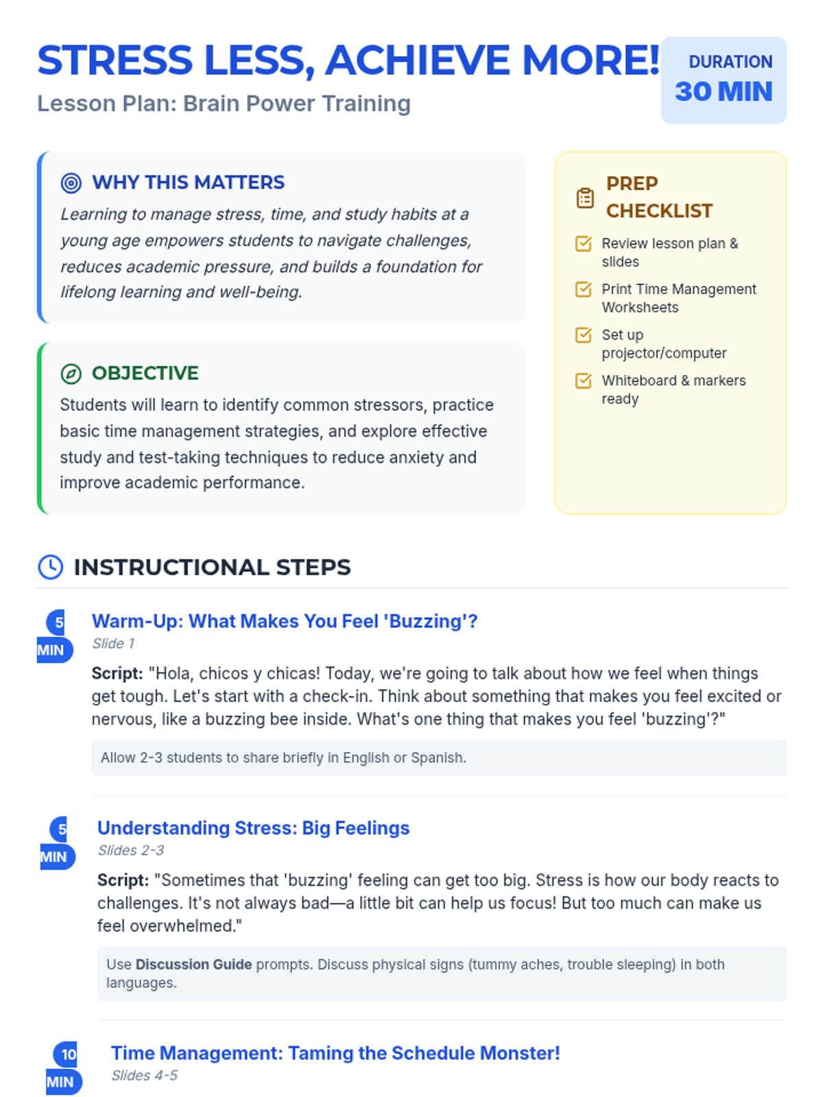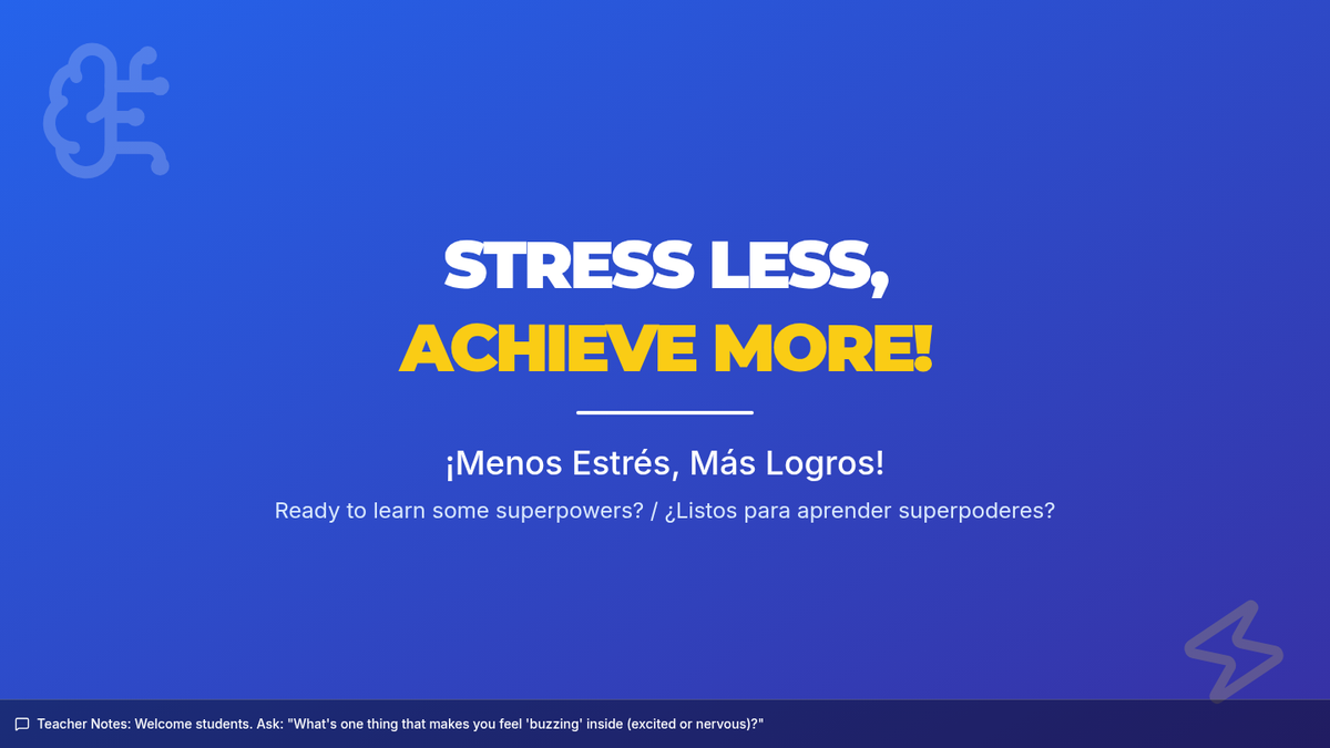 This 30-minute bilingual lesson for 5th graders helps students understand stress, learn time management, and develop effective study and test-taking techniques. It uses a 'Brain Power Lab' theme to make resilience-building engaging and accessible.