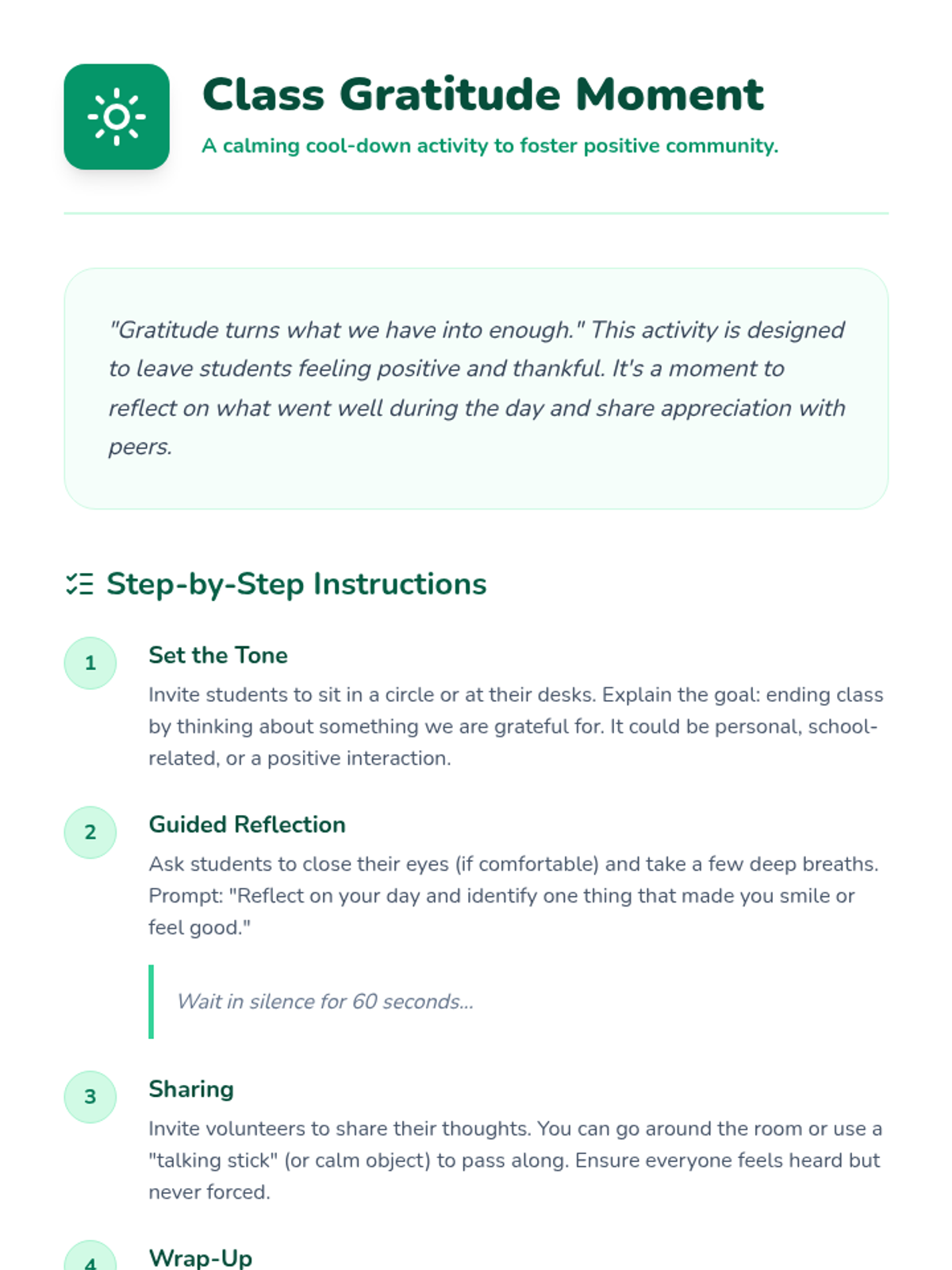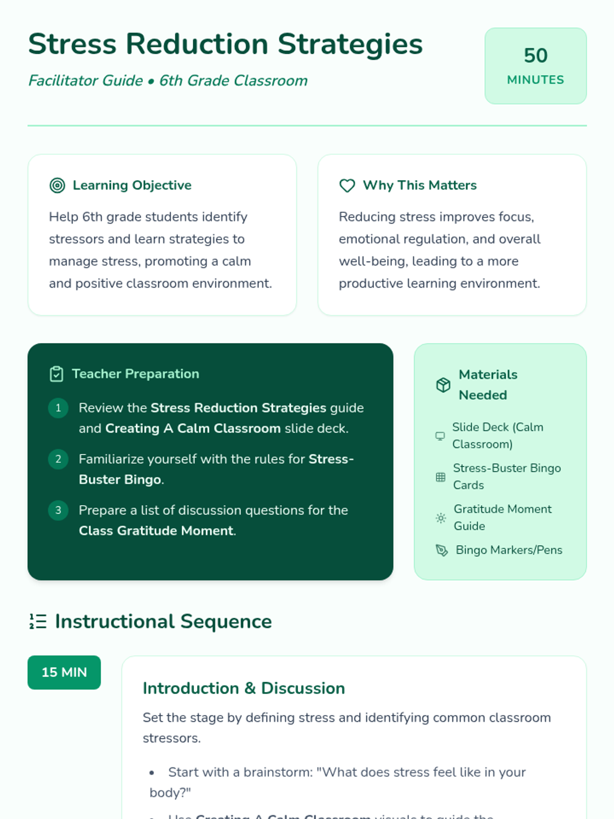 A comprehensive lesson for 6th-grade students to identify stressors and implement calming strategies like deep breathing and gratitude to foster a positive classroom environment.