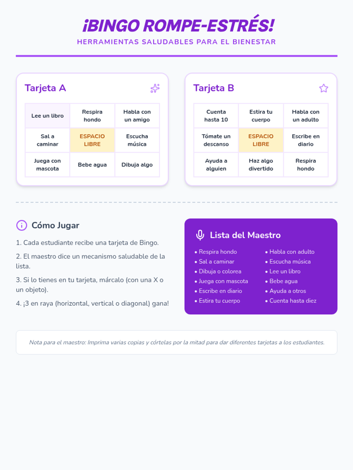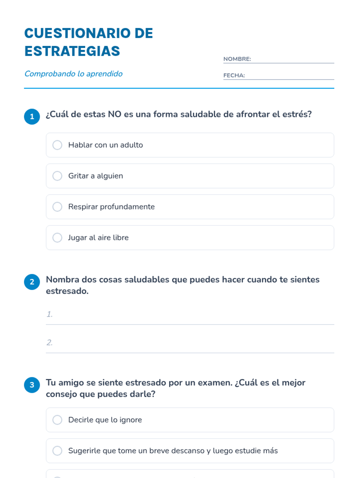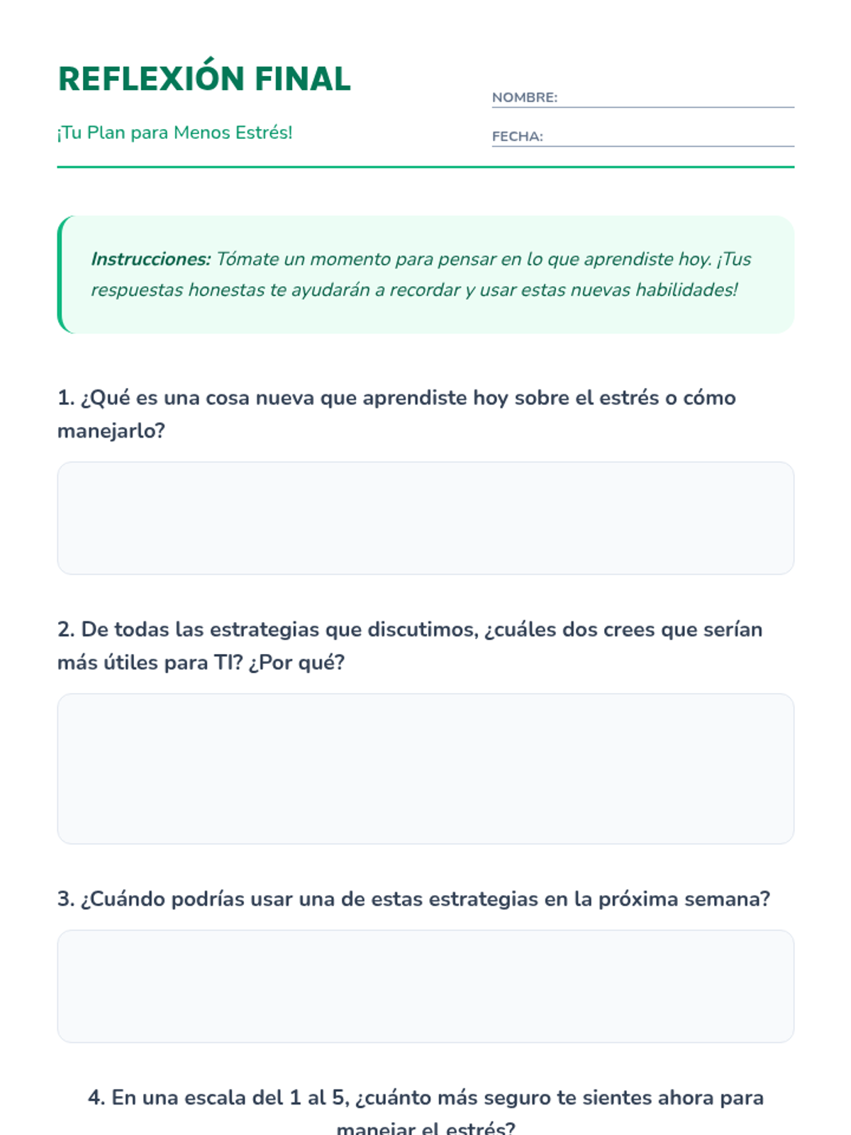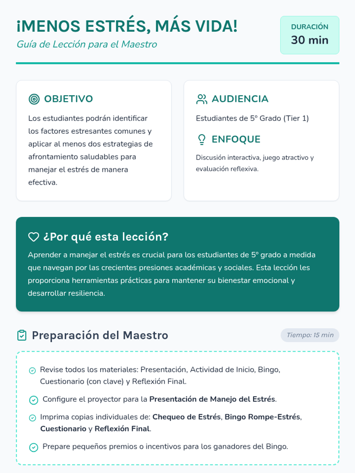 Esta lección de 30 minutos para estudiantes de 5º grado enseña estrategias prácticas para manejar el estrés y promueve el bienestar general a través de actividades interactivas y reflexivas.