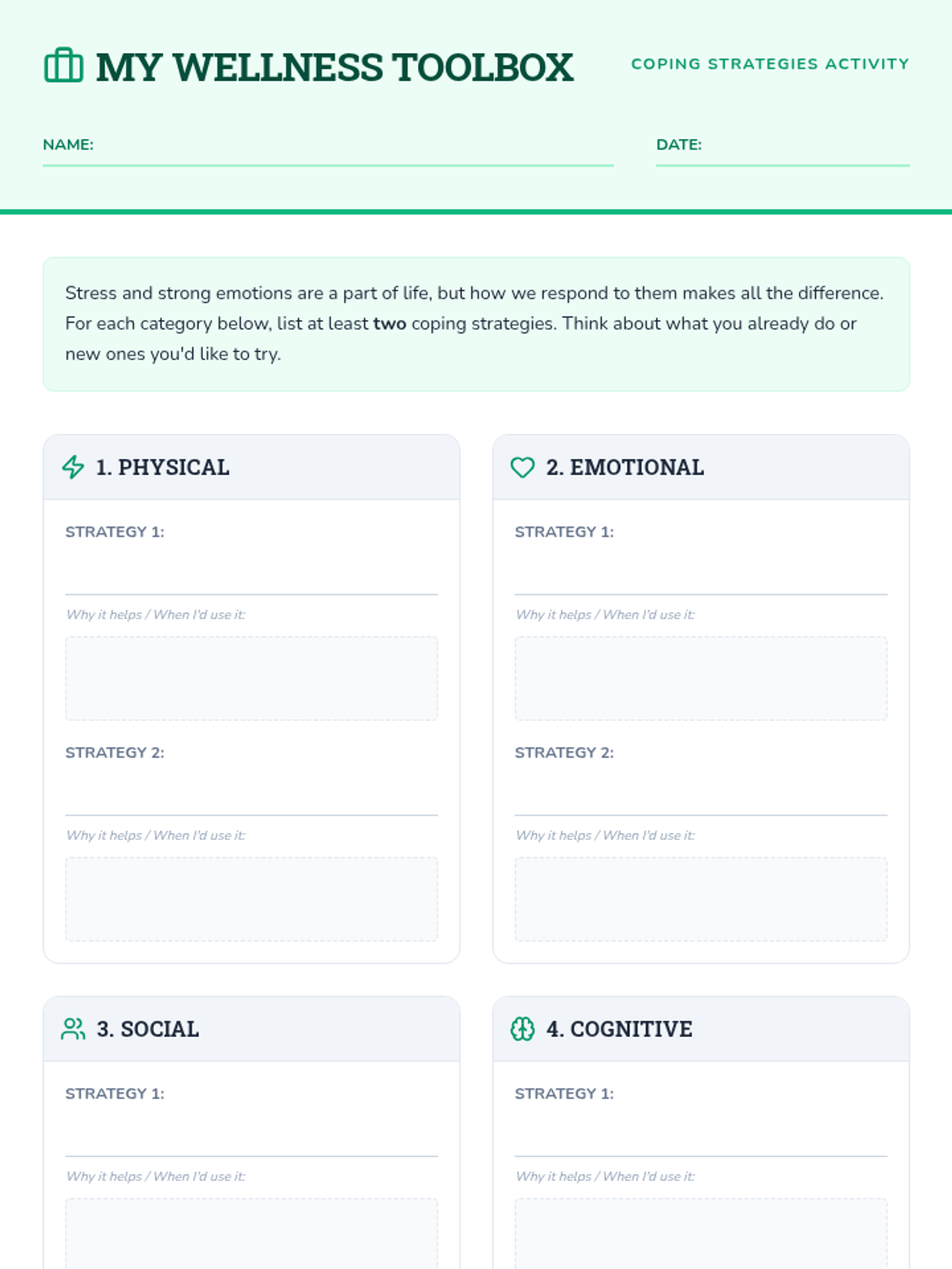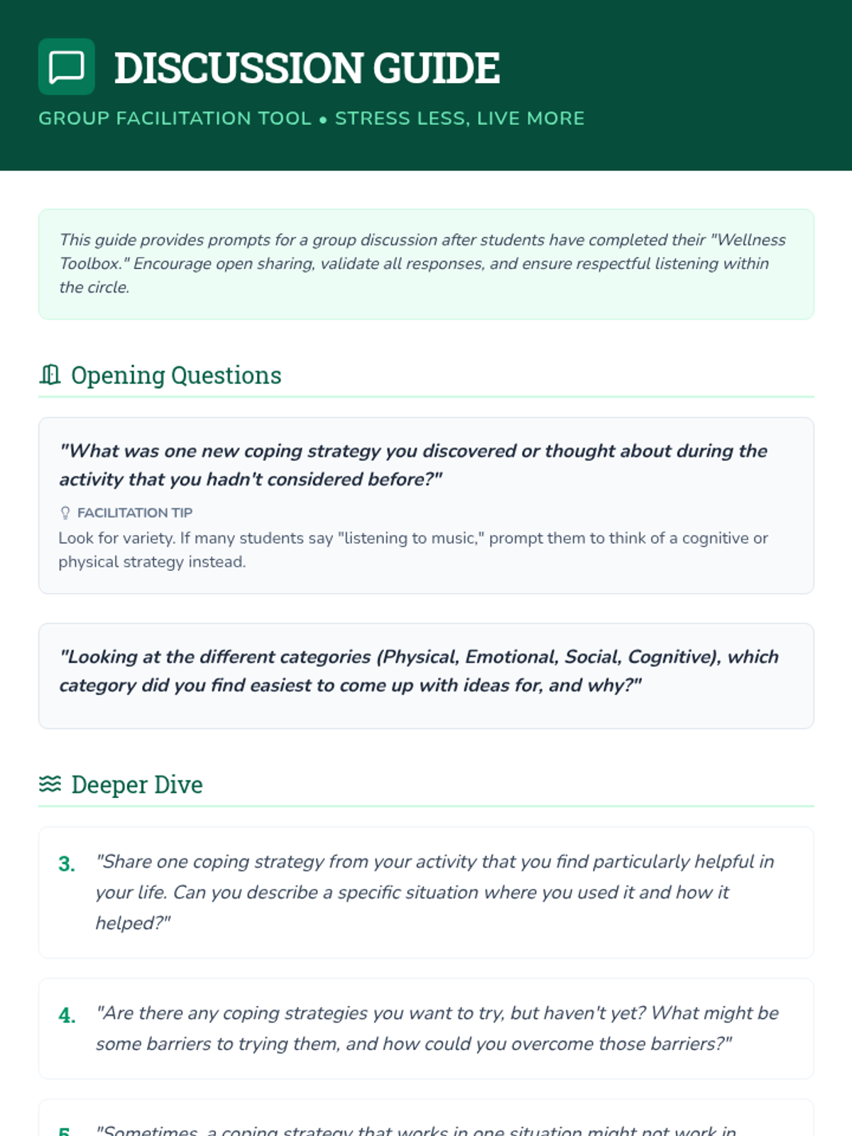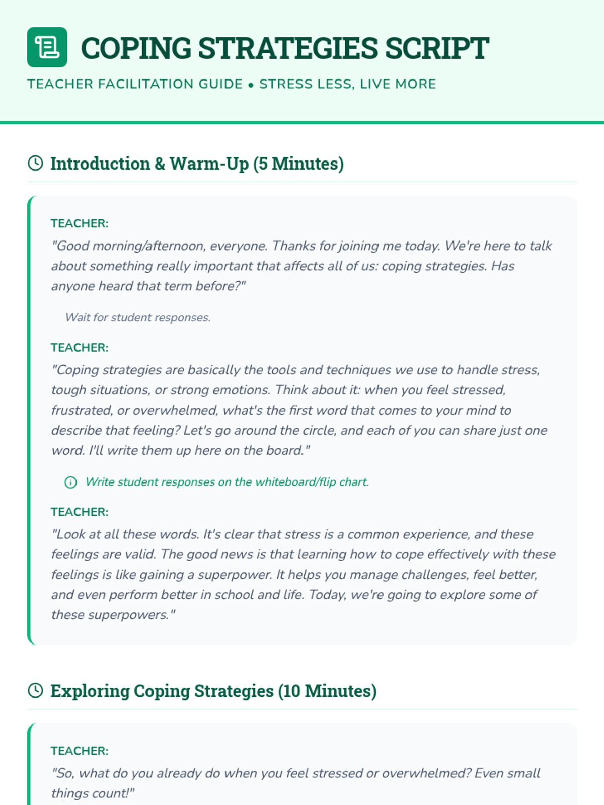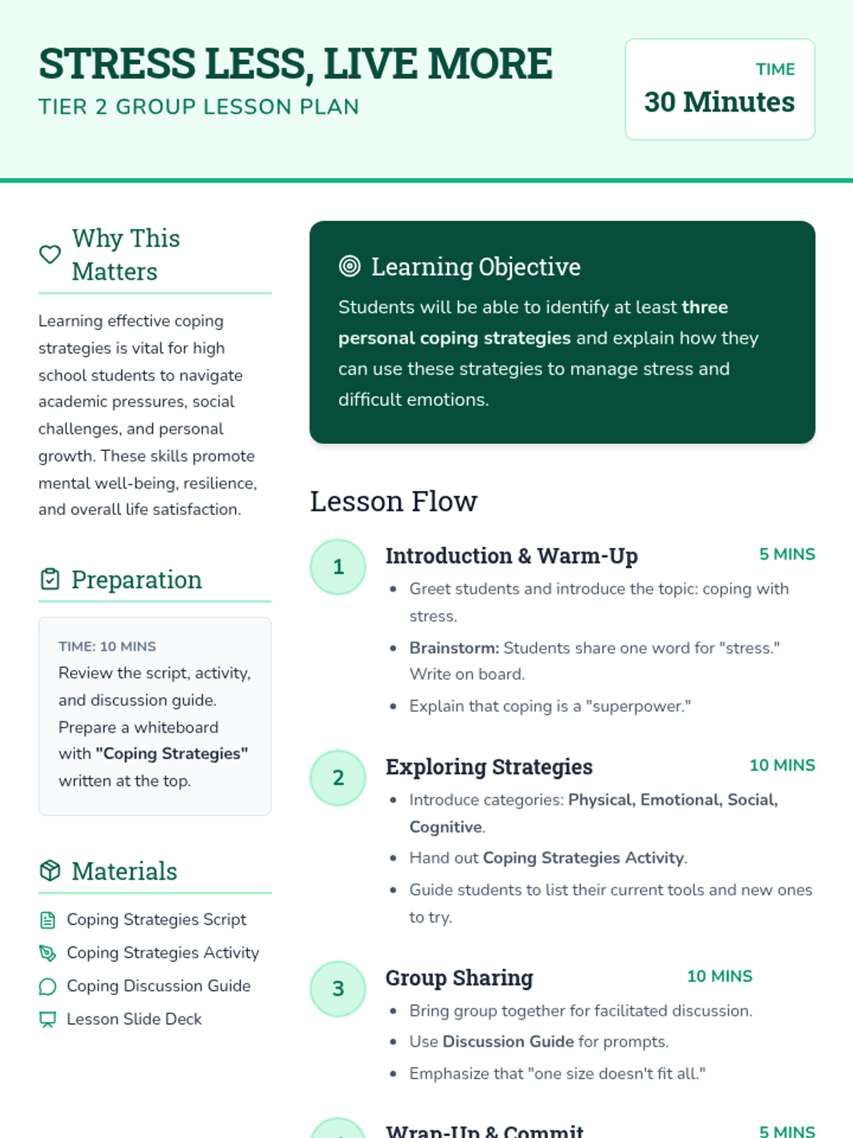 A 30-minute Tier 2 group lesson for high school students focused on identifying and practicing physical, emotional, social, and cognitive coping strategies for stress.