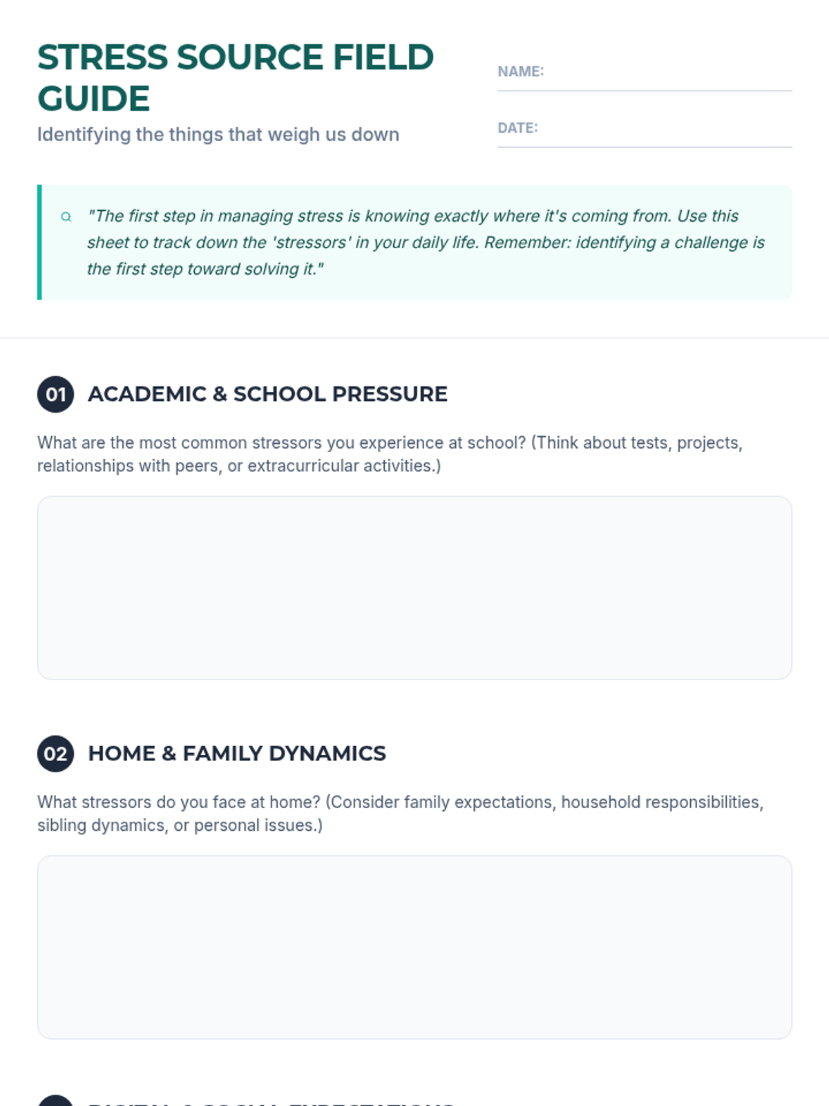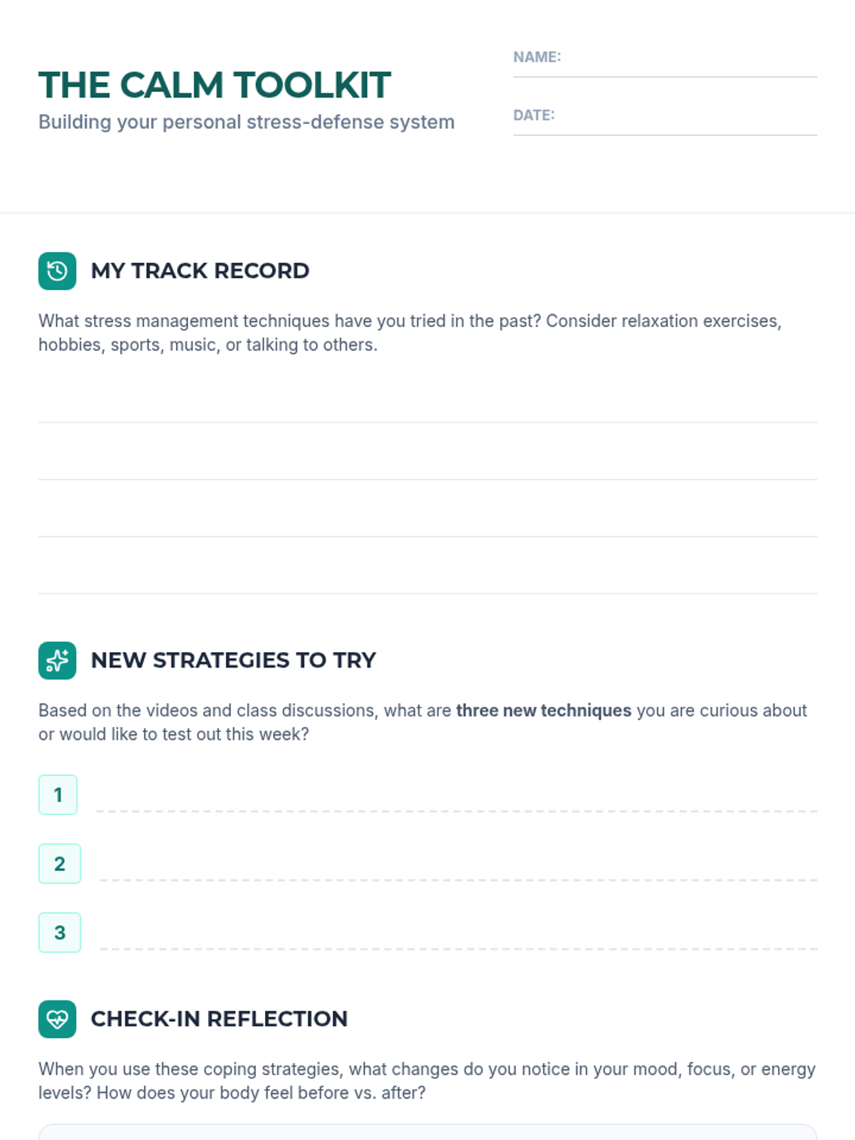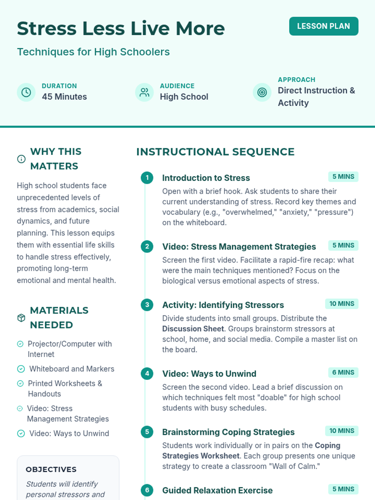 A comprehensive lesson designed for high schoolers to identify personal stressors and learn effective coping strategies through discussion, video, and guided relaxation. Students will build a personalized toolkit for emotional and mental well-being.