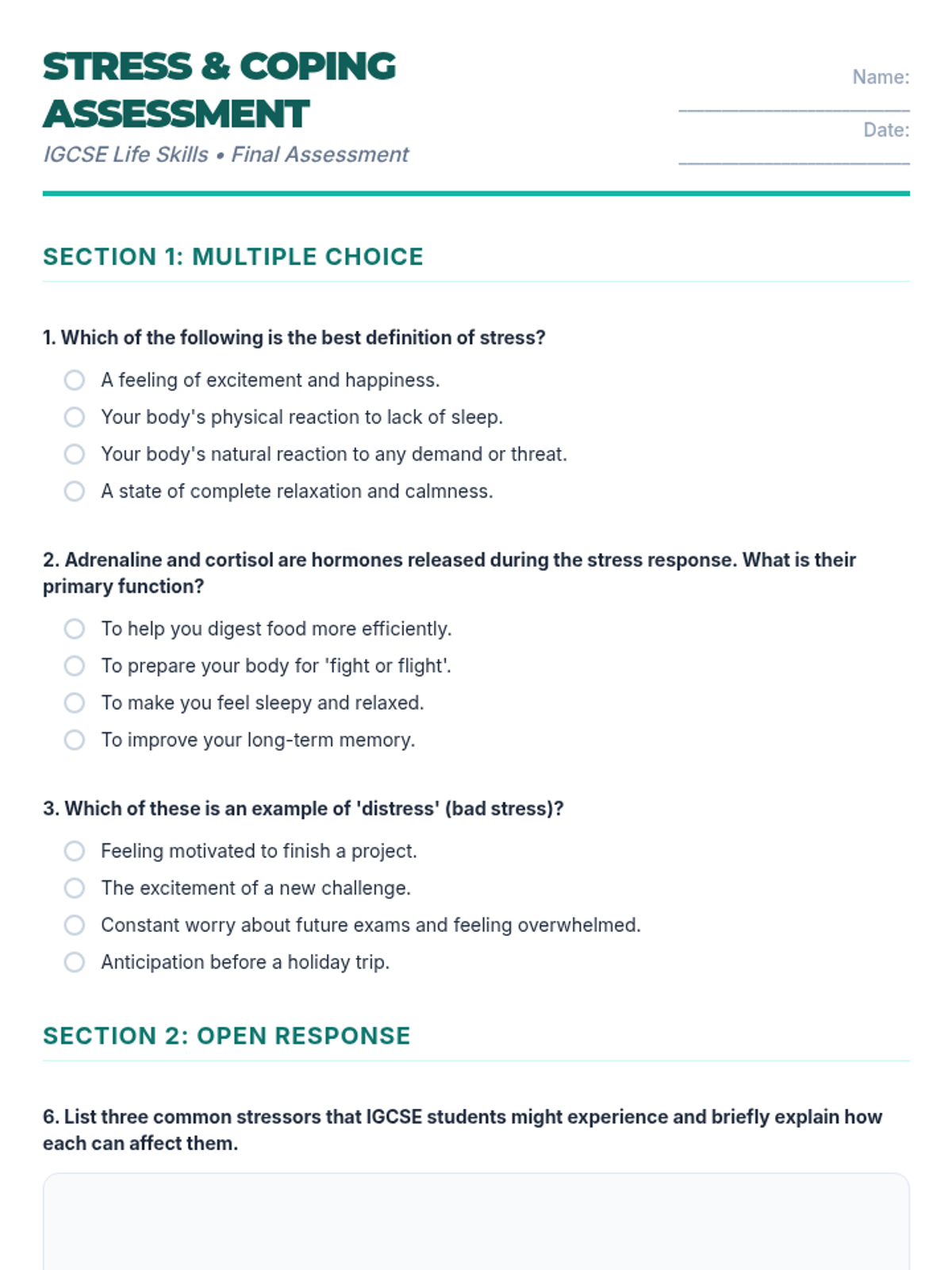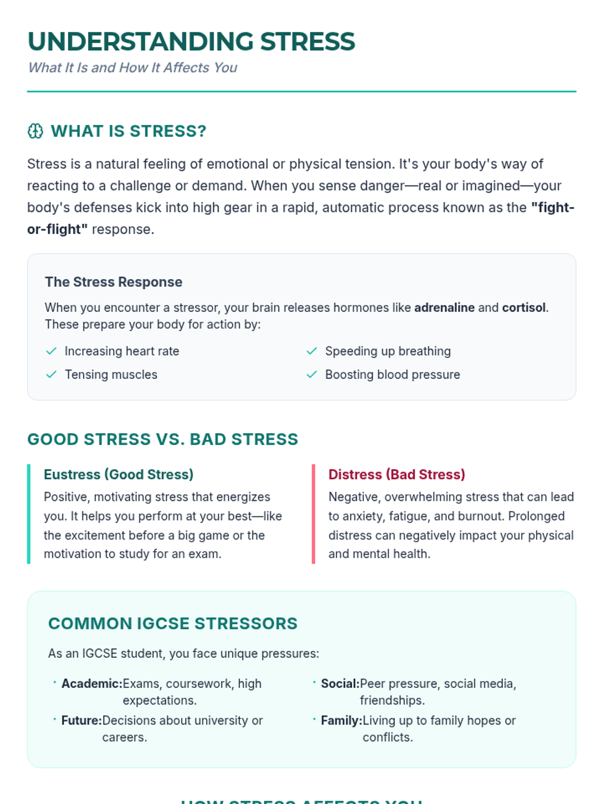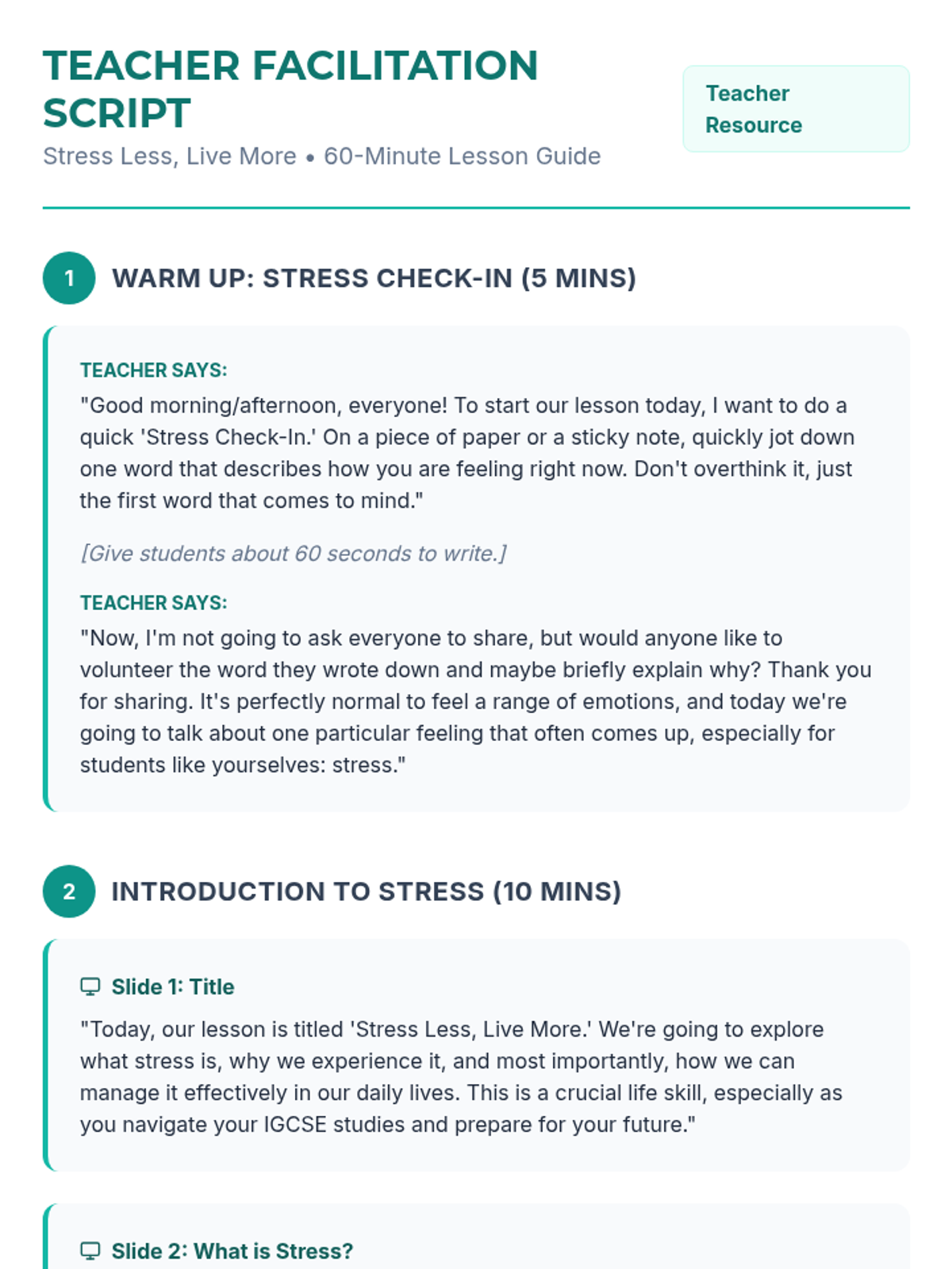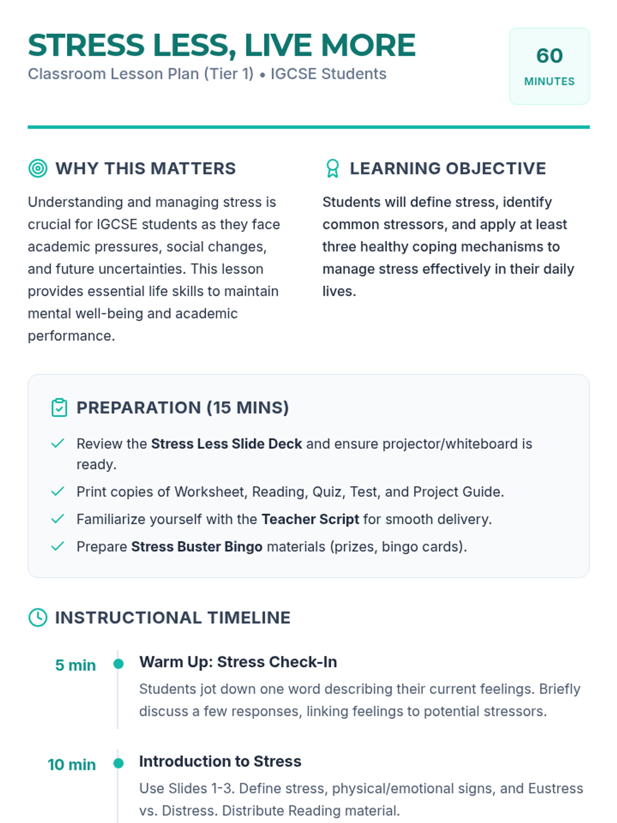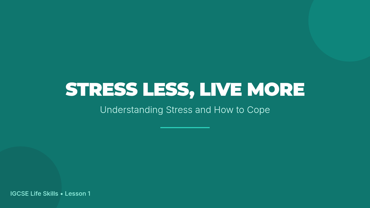 A comprehensive 60-minute lesson for IGCSE students to understand, identify, and manage stress through interactive discussions, practical exercises, and a personal planning project.