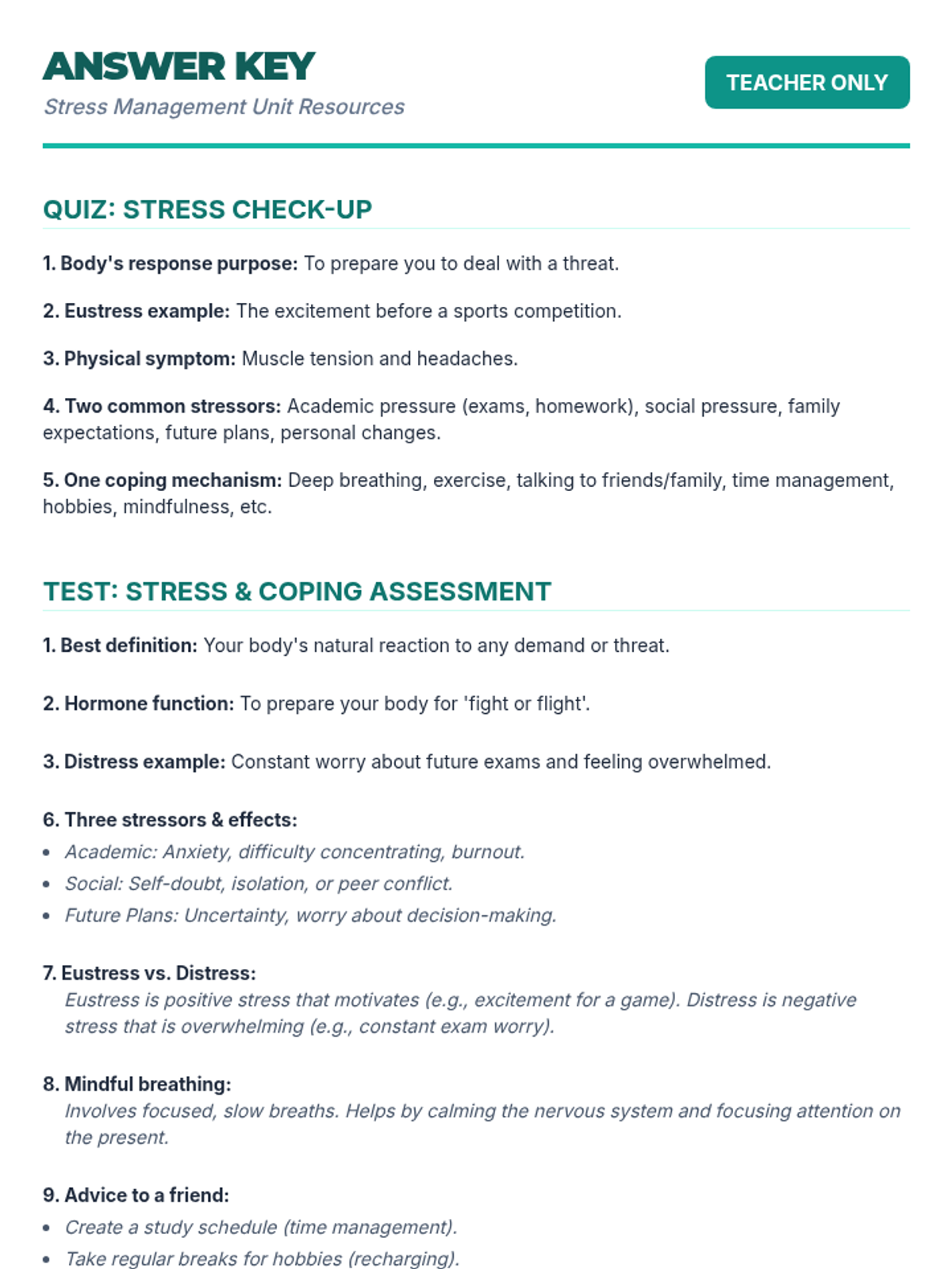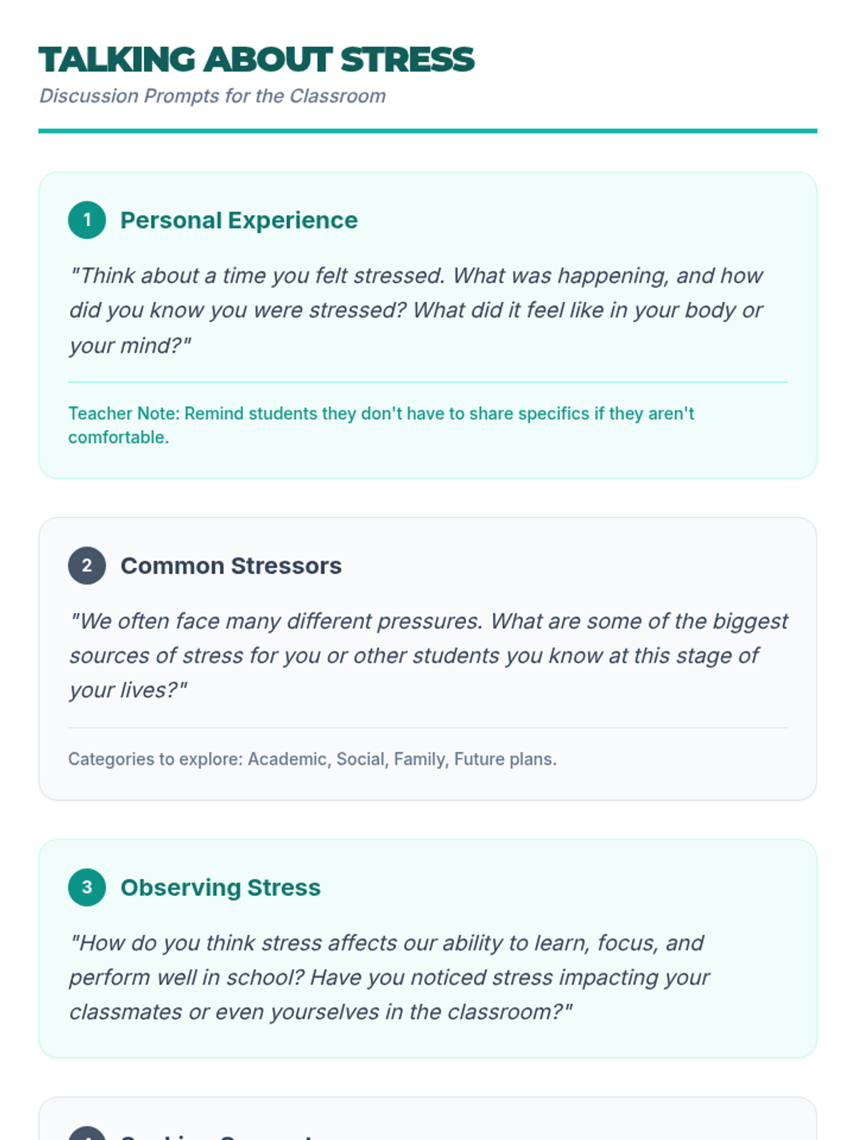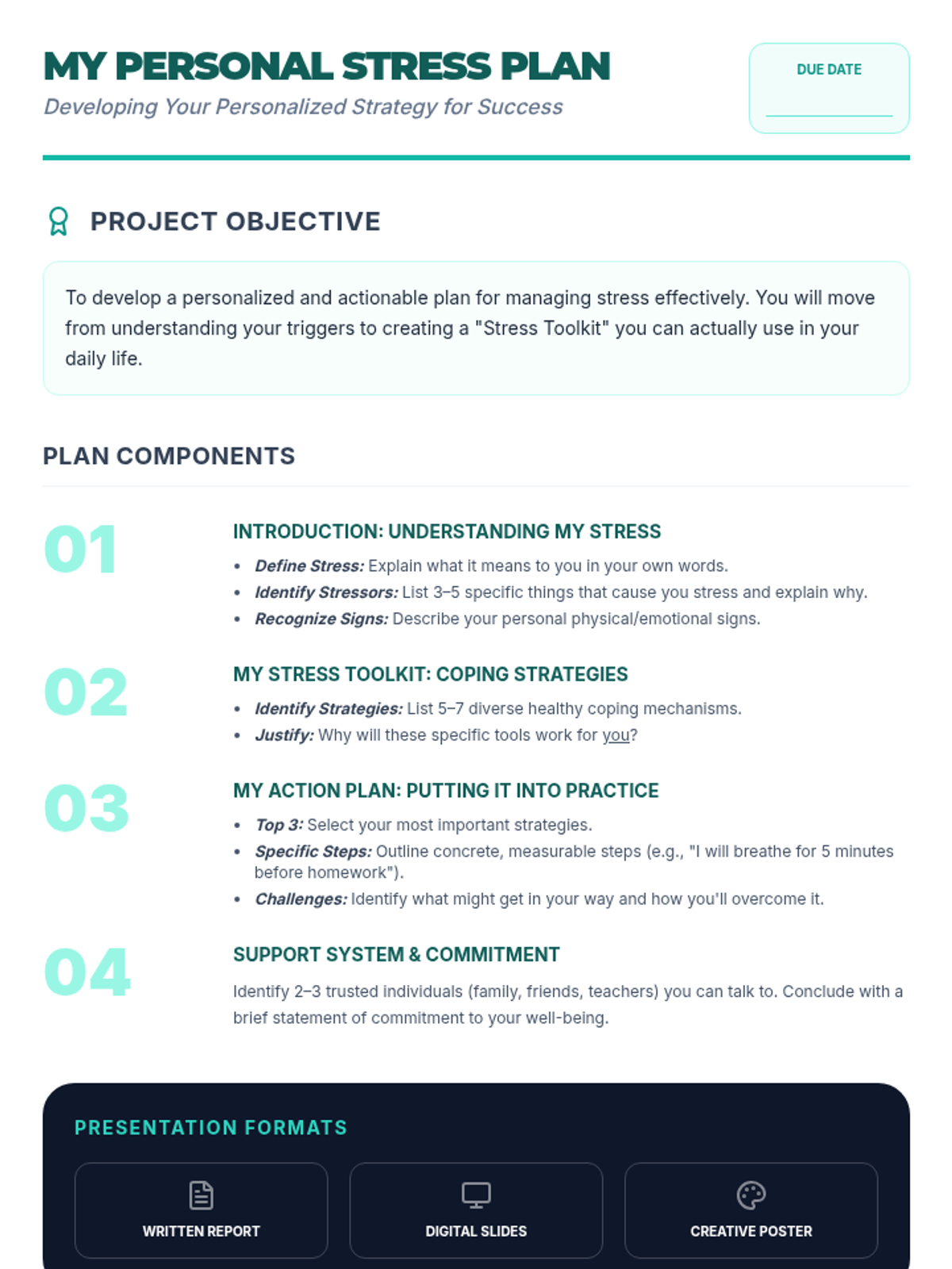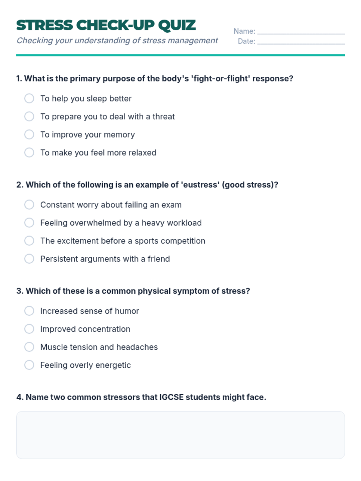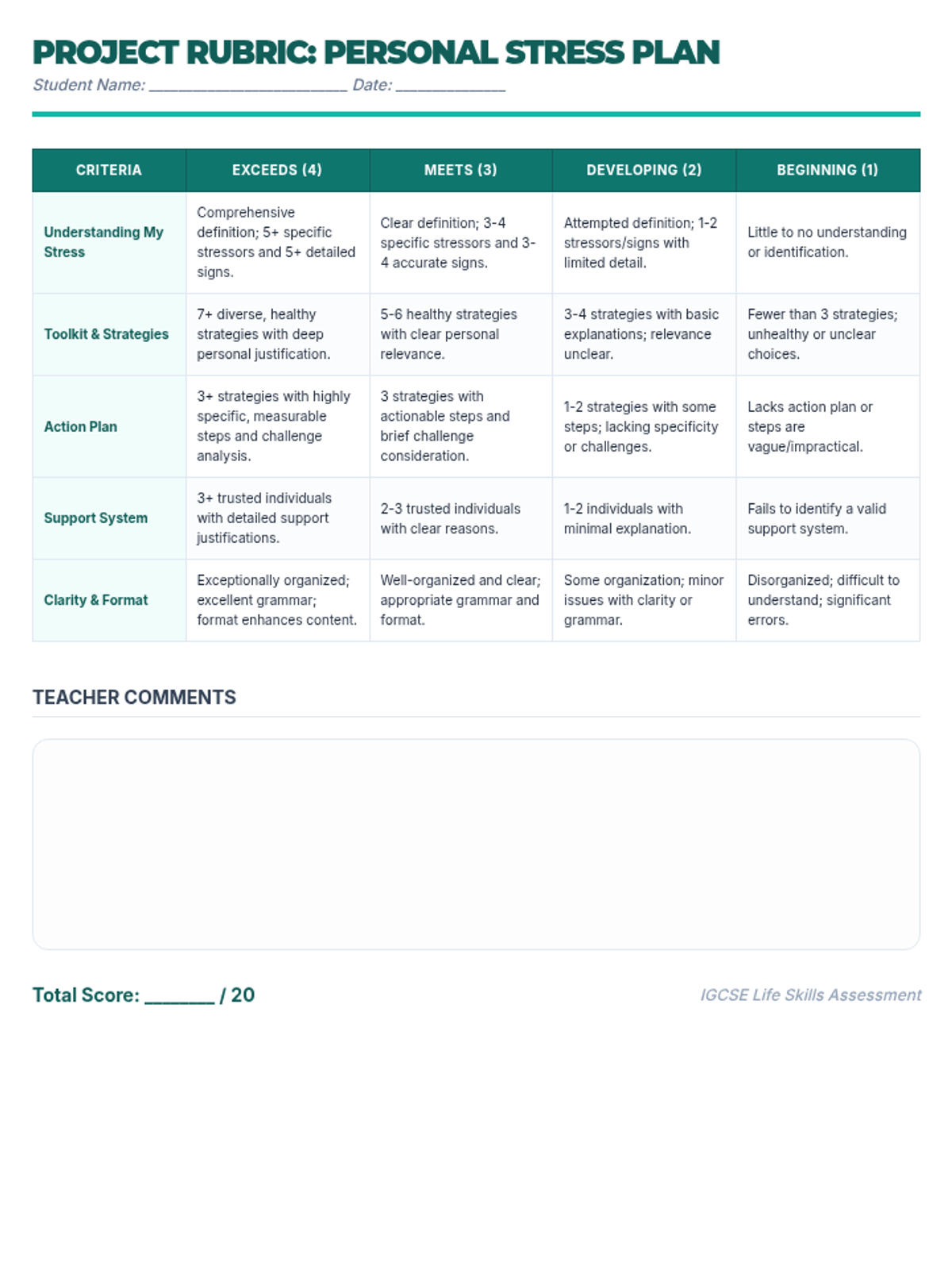A comprehensive 60-minute lesson for IGCSE students to understand, identify, and manage stress through interactive discussions, practical exercises, and a personal planning project.
