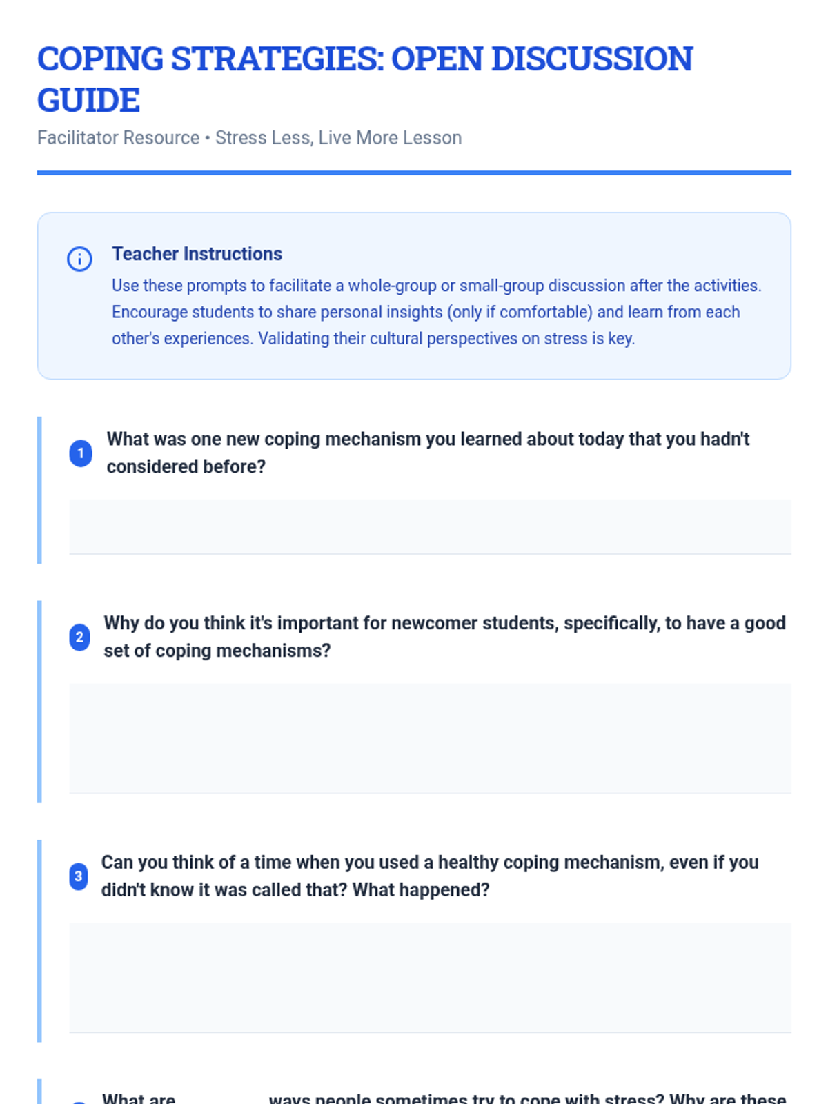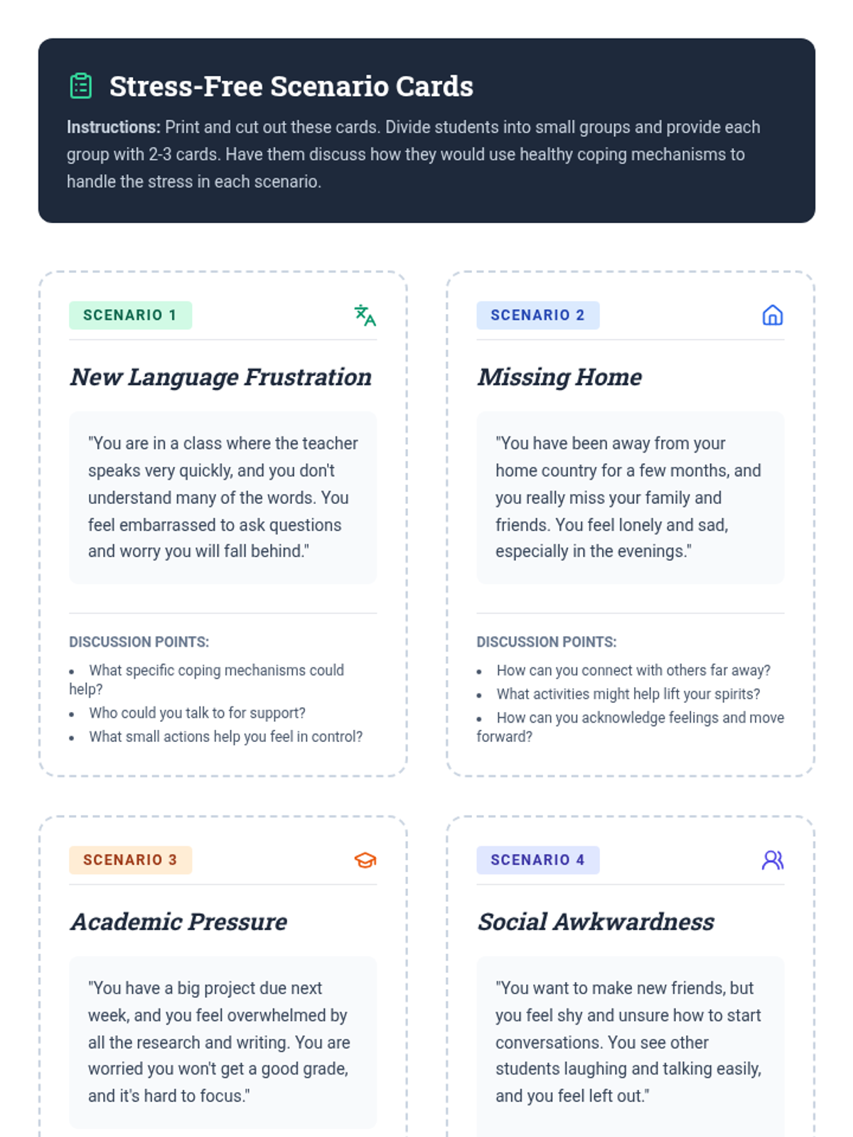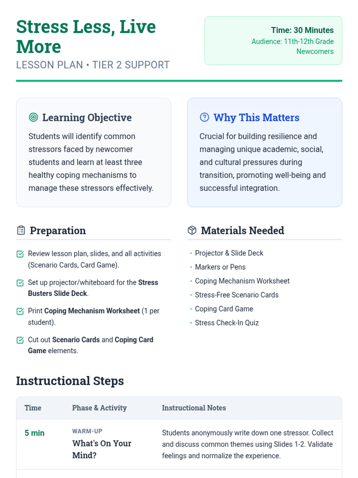A 30-minute Tier 2 group lesson for 11th and 12th-grade newcomer students focused on identifying stressors and developing healthy coping mechanisms. Students engage in discussions, brainstorming, and interactive games to build resilience in their new environment.