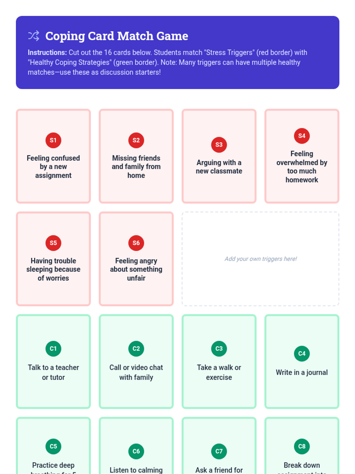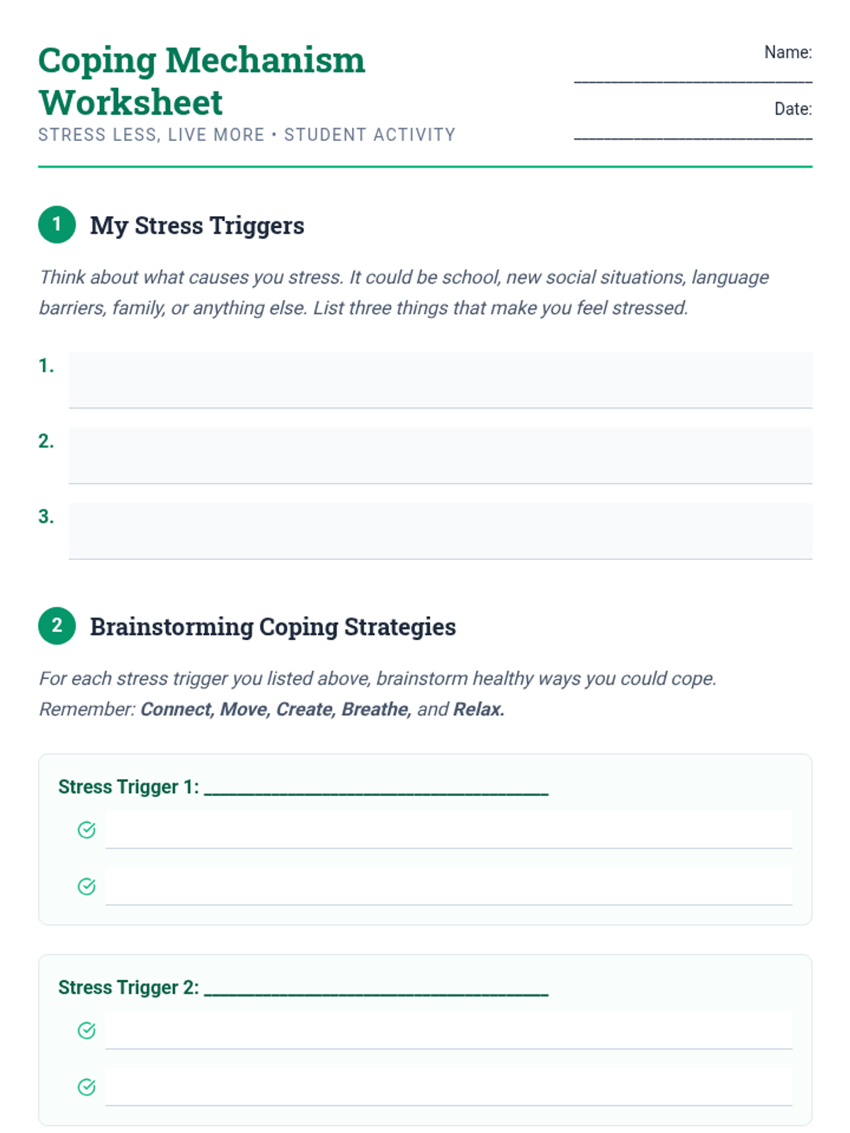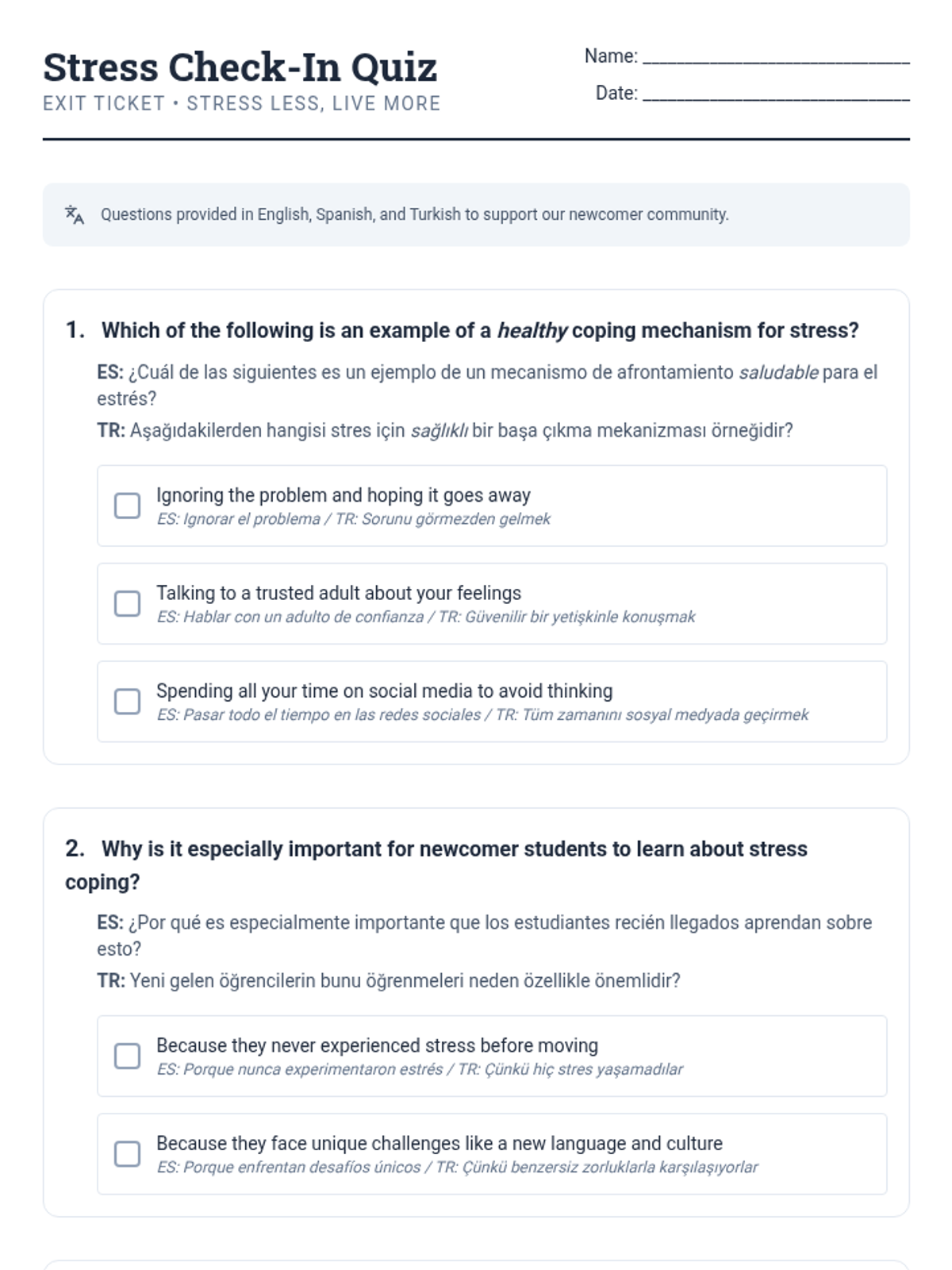 A 30-minute Tier 2 group lesson for 11th and 12th-grade newcomer students focused on identifying stressors and developing healthy coping mechanisms. Students engage in discussions, brainstorming, and interactive games to build resilience in their new environment.