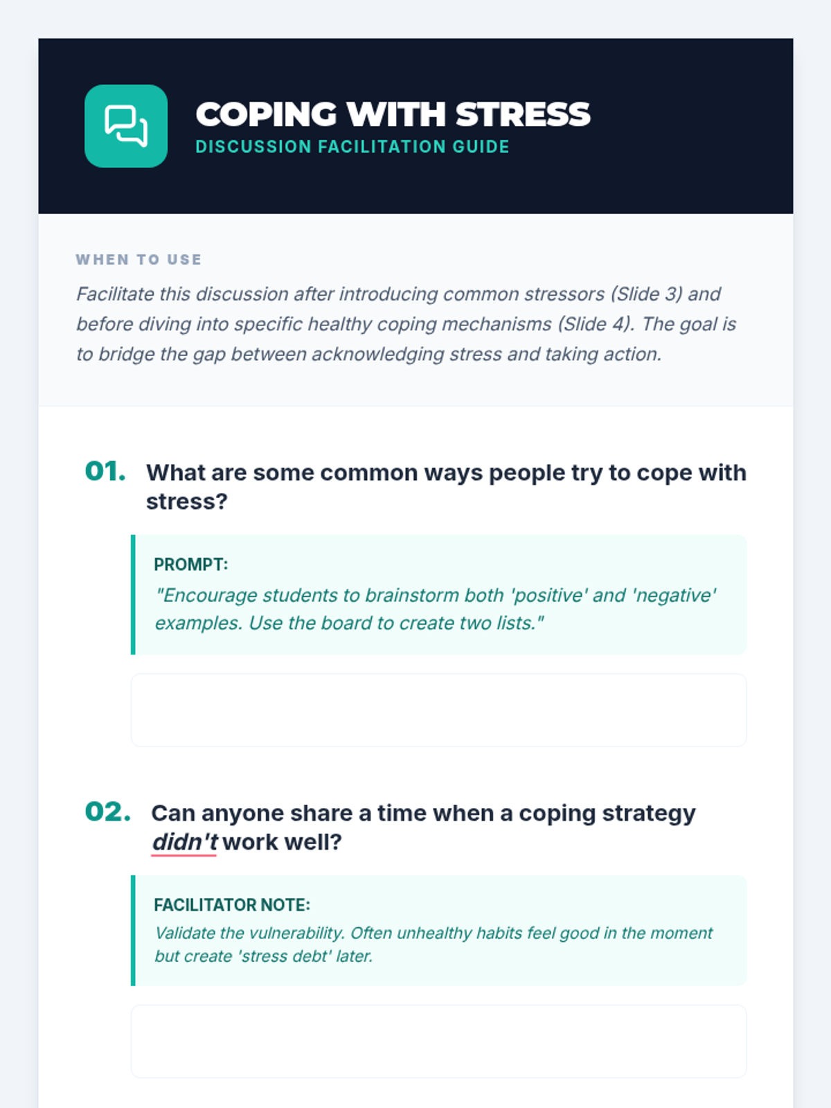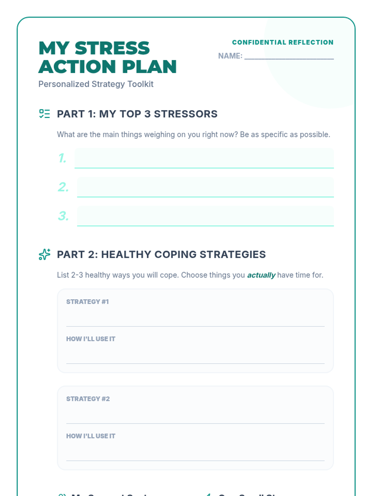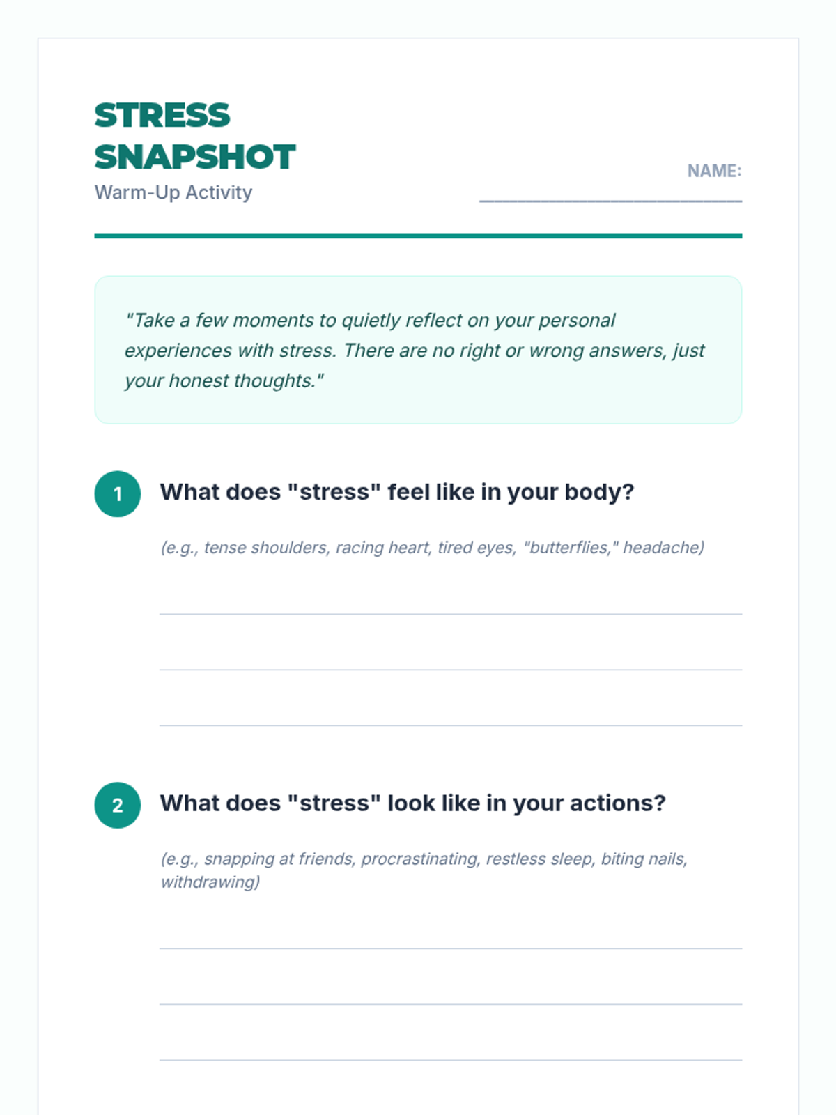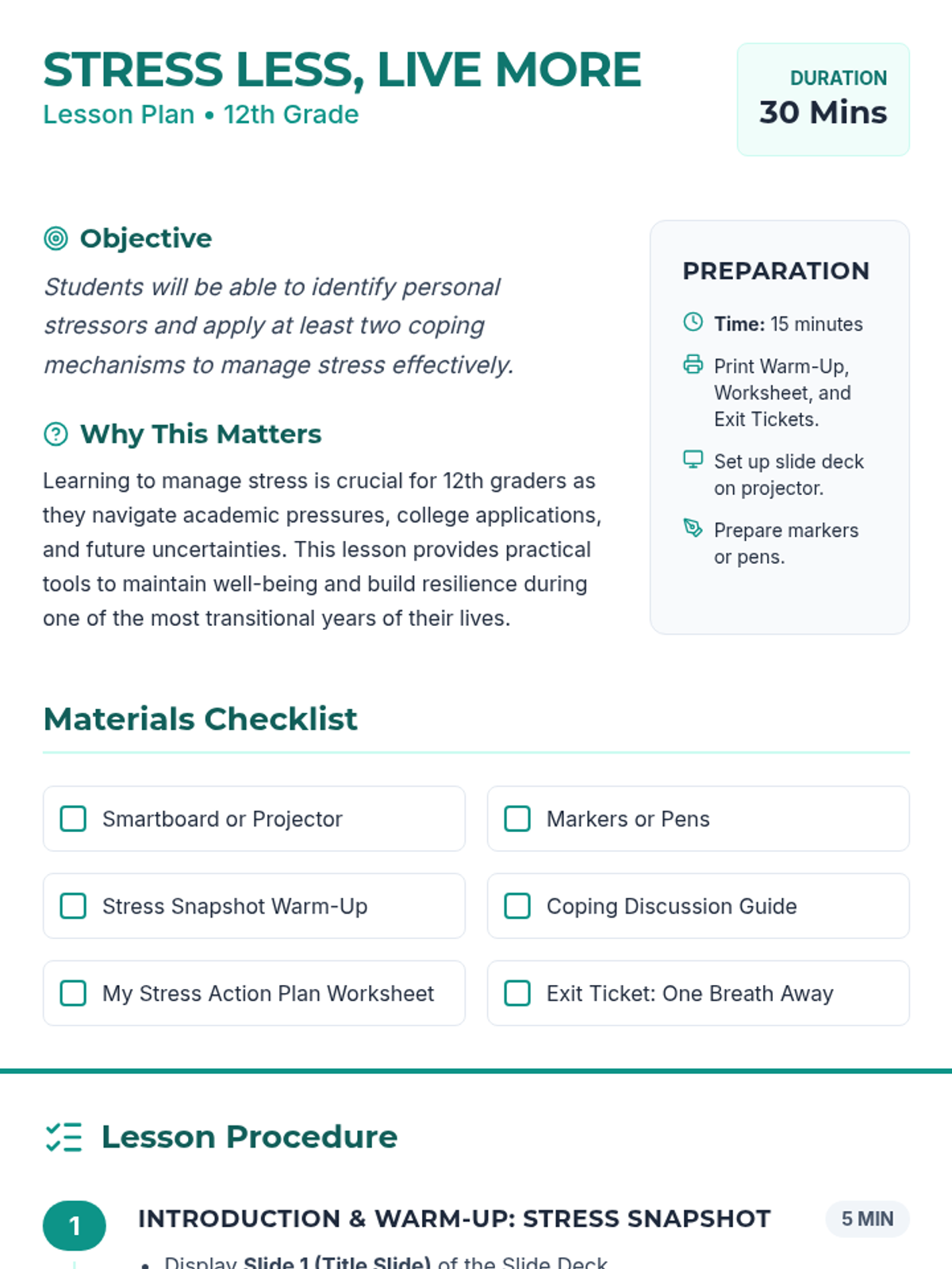 A 30-minute mental health lesson for 12th graders focused on identifying stressors and building a personal coping strategy toolkit.