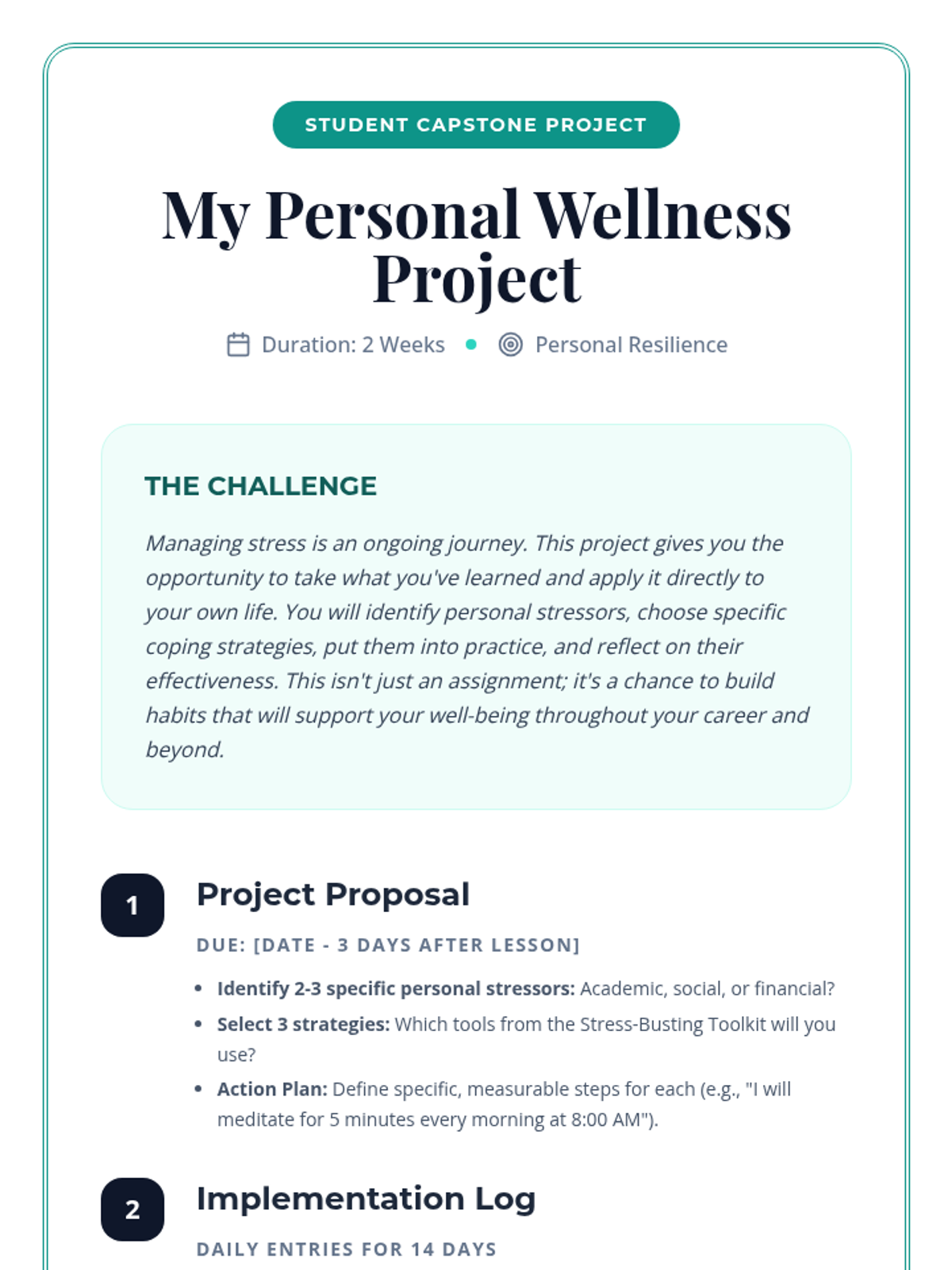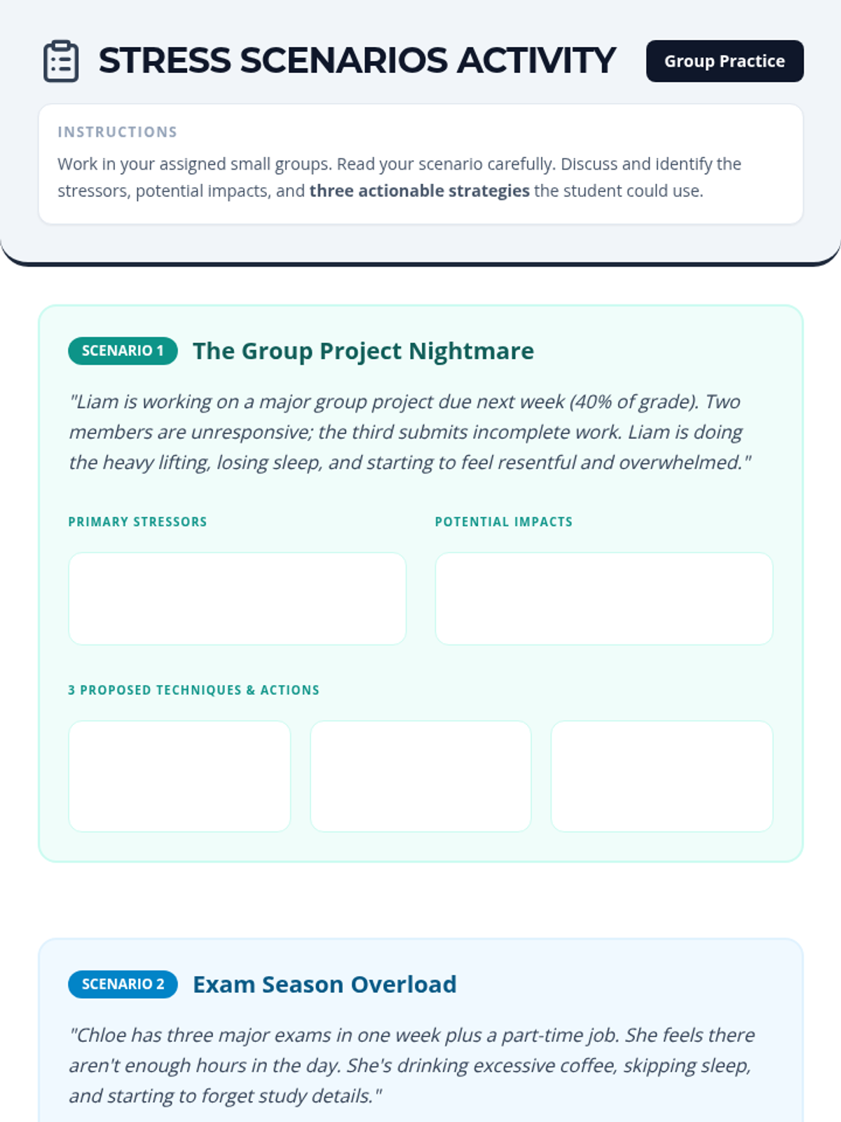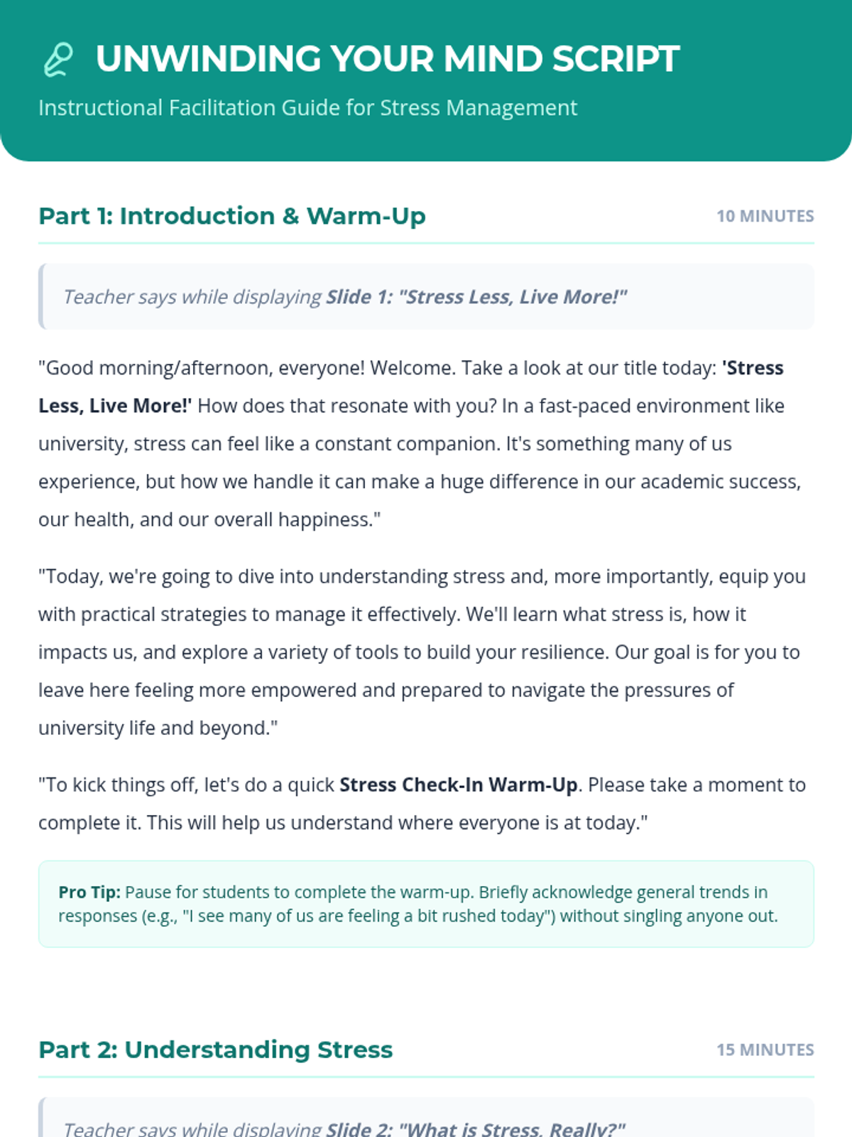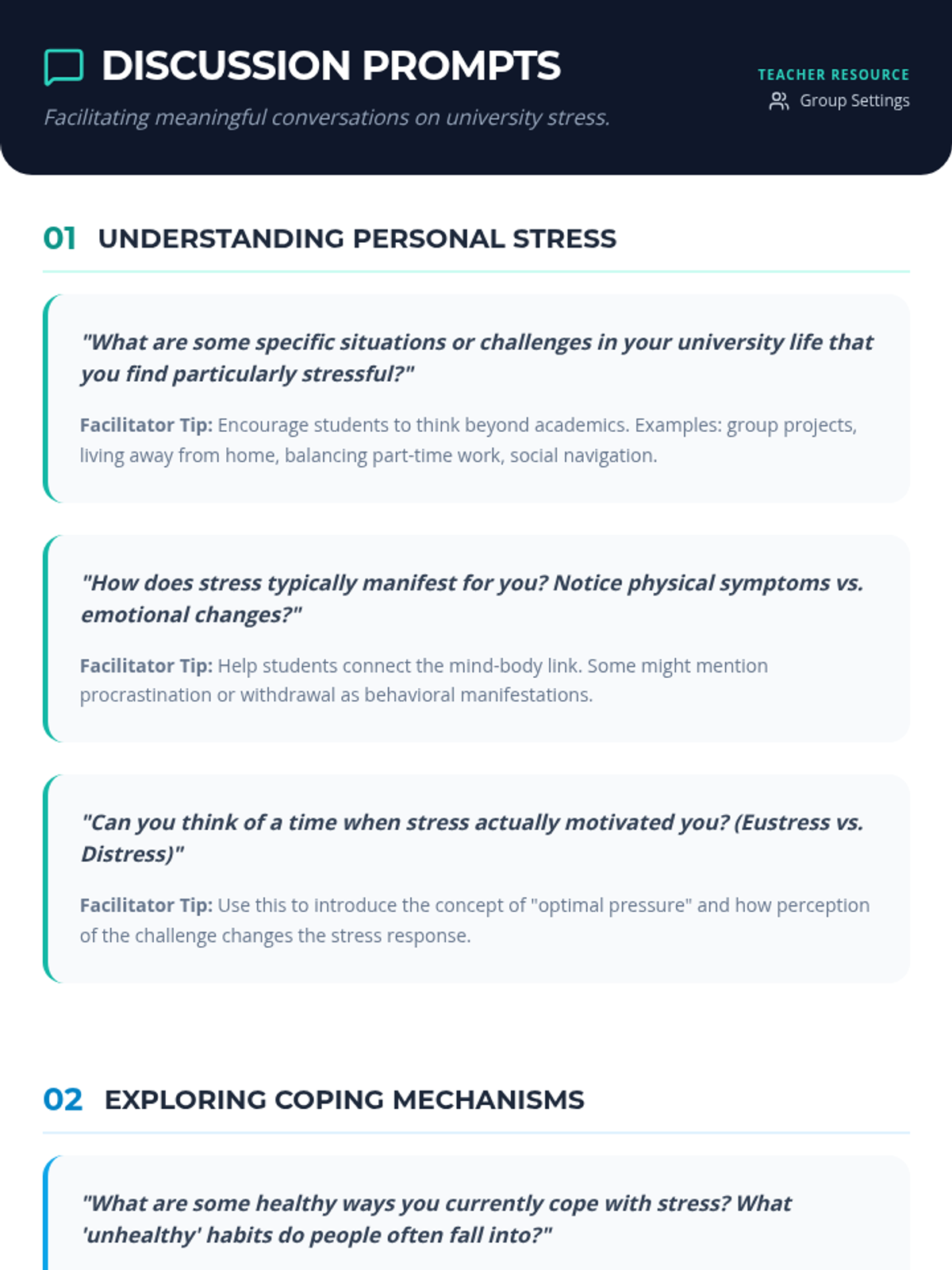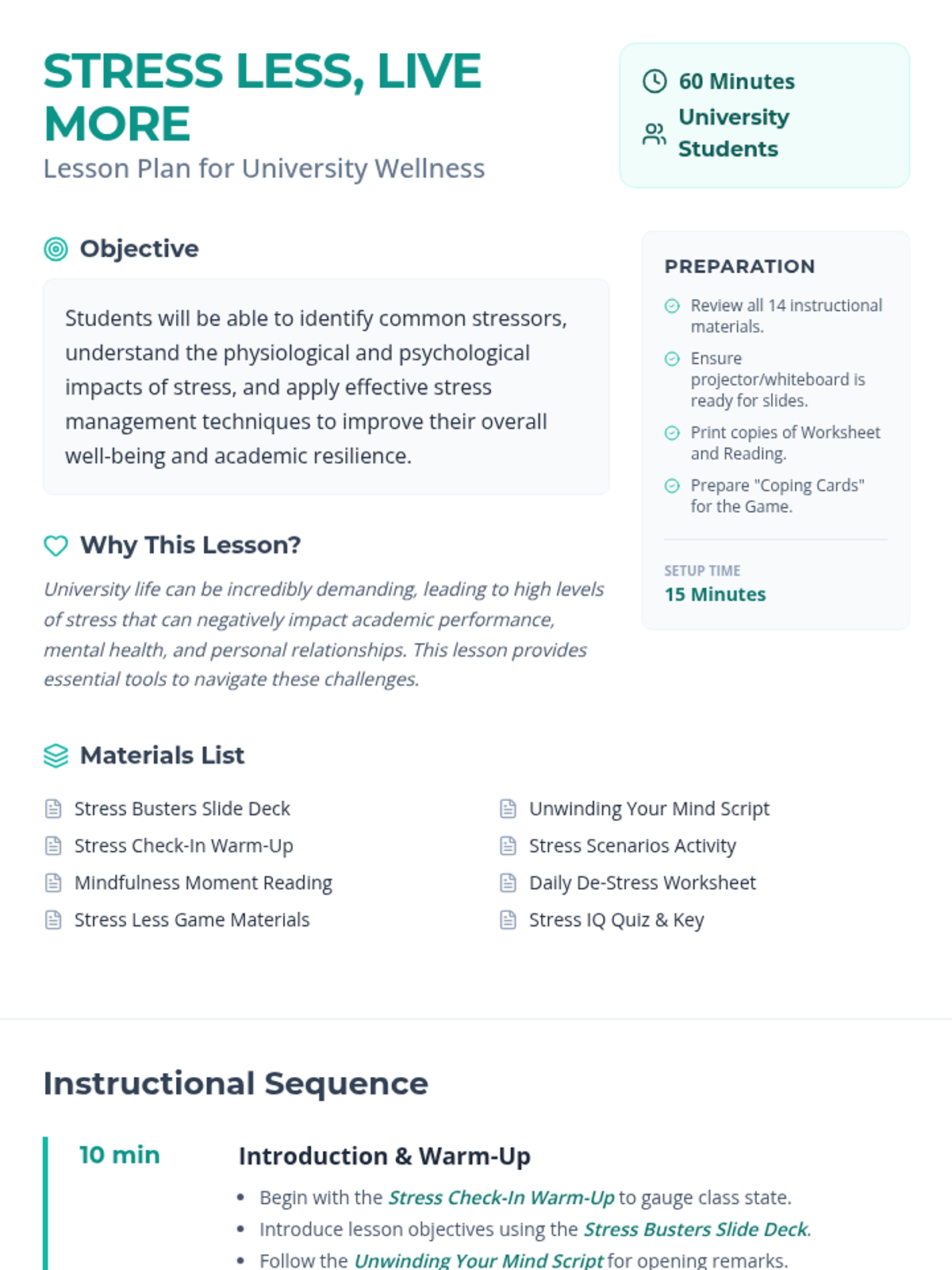 This lesson empowers university students with practical strategies to understand, manage, and reduce stress. Through interactive discussions and practical exercises, students will build a personalized toolkit for resilience and well-being.