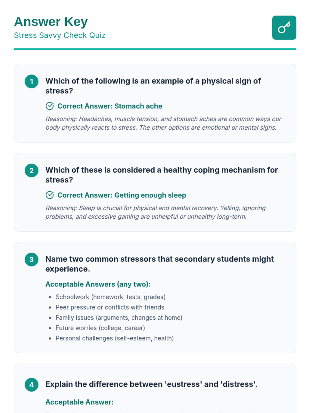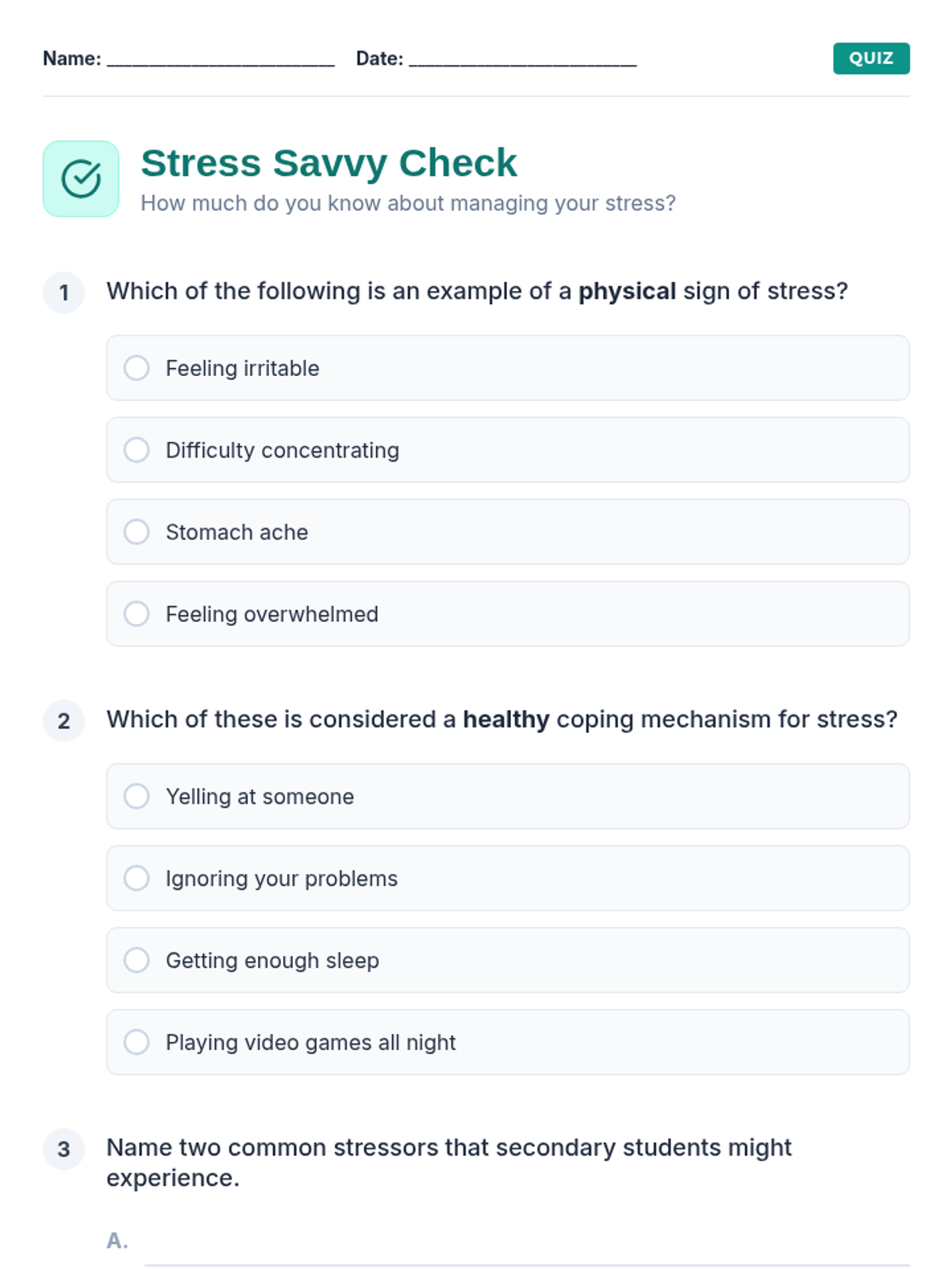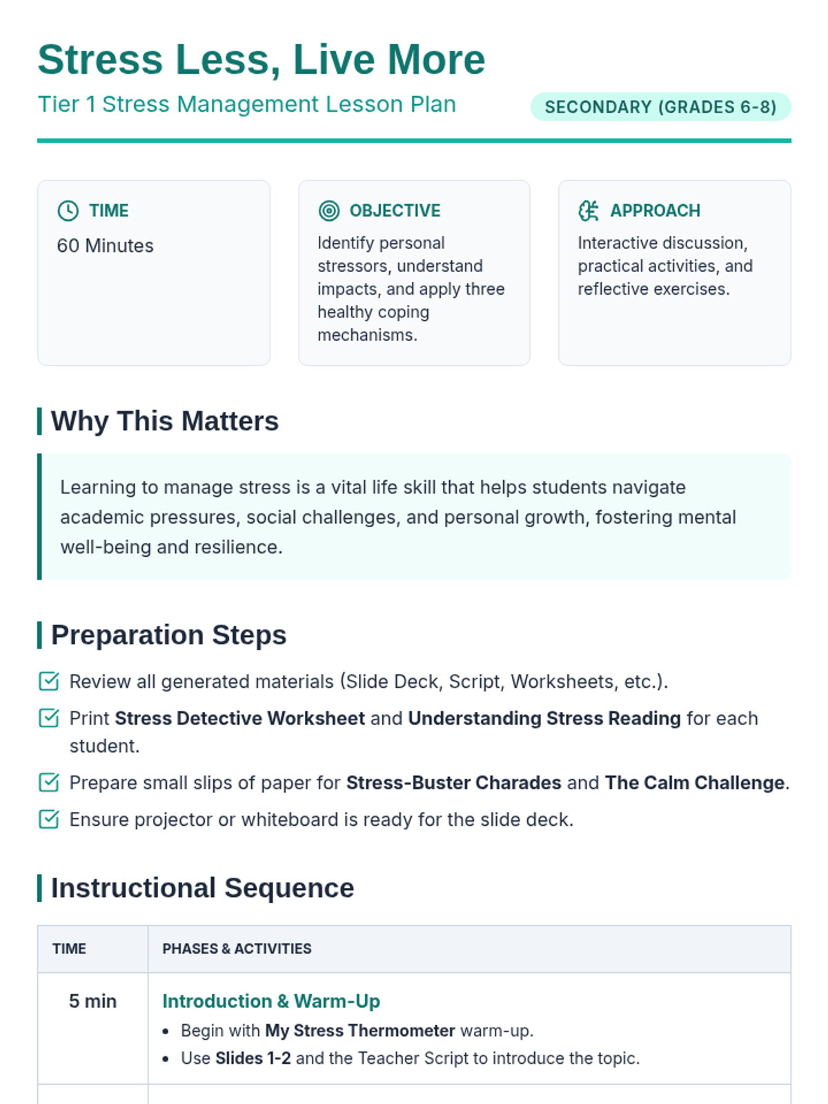 A comprehensive one-hour Tier 1 lesson for secondary students to identify stressors and develop healthy coping mechanisms for emotional resilience.