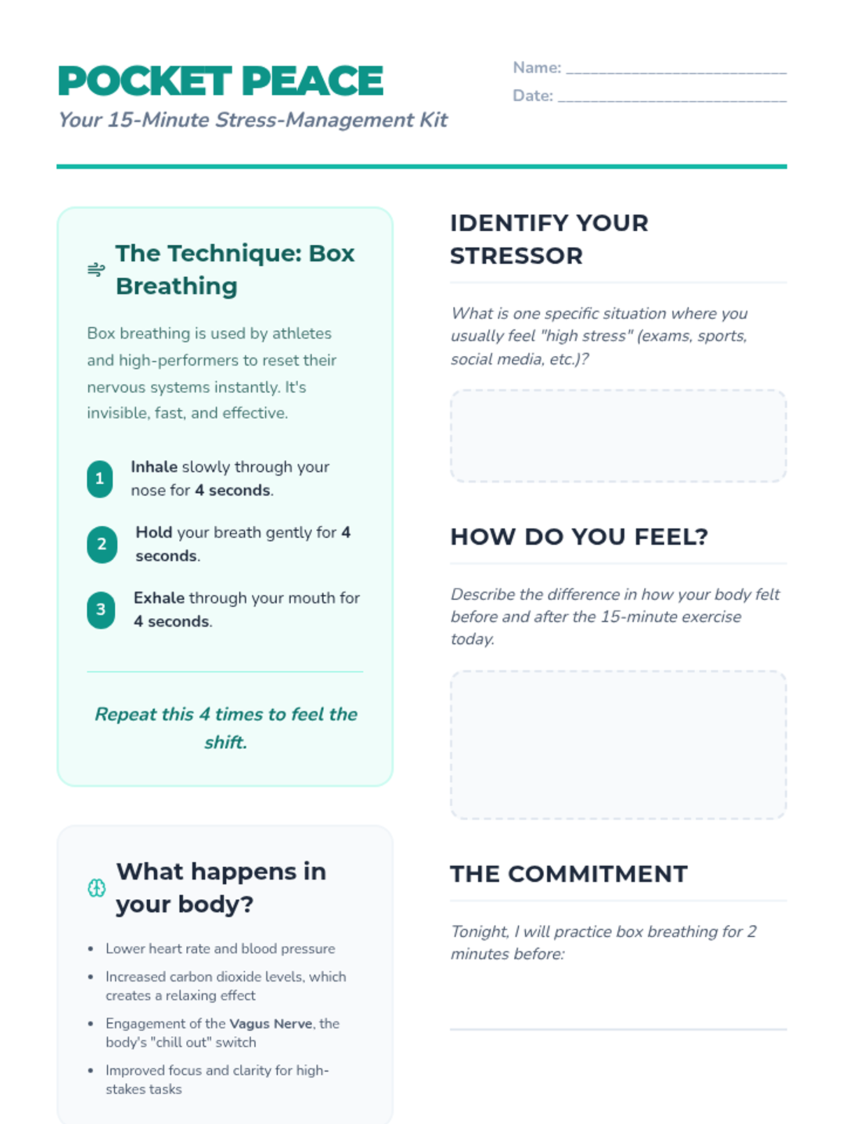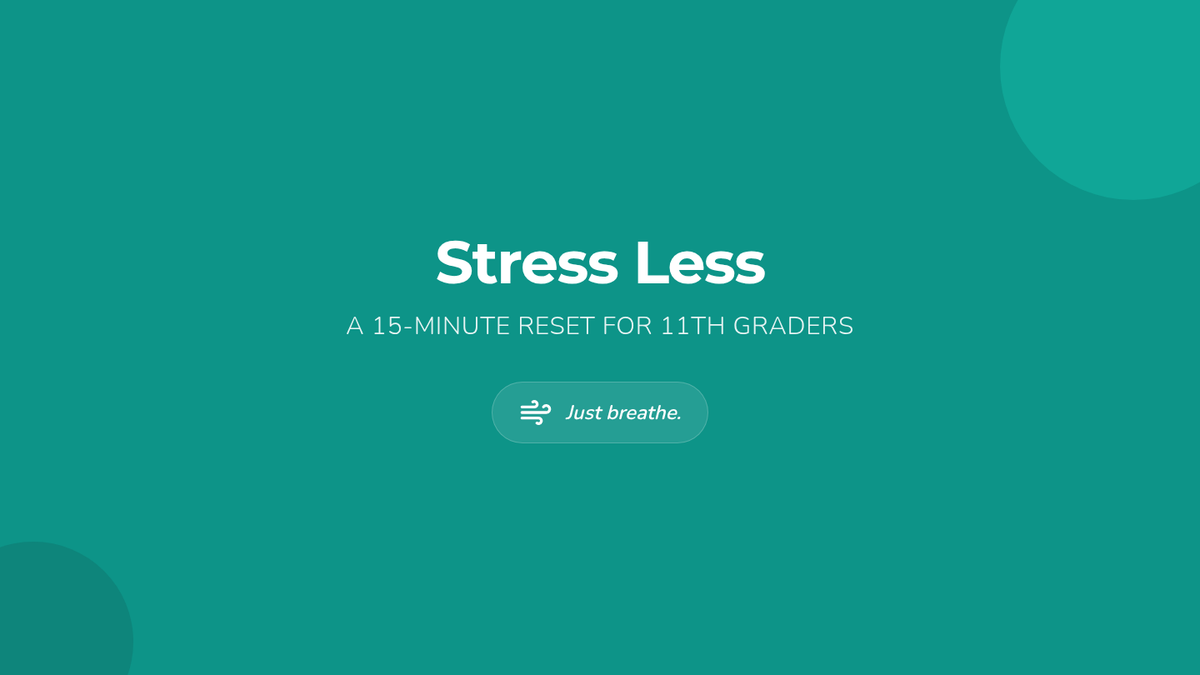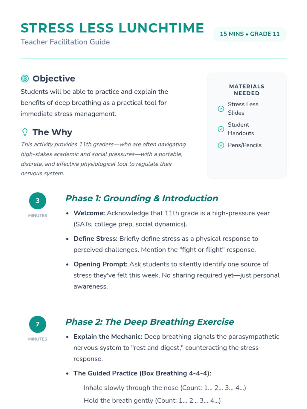 A quick 15-minute lunchtime activity for 11th graders to learn and practice deep breathing techniques for stress management.