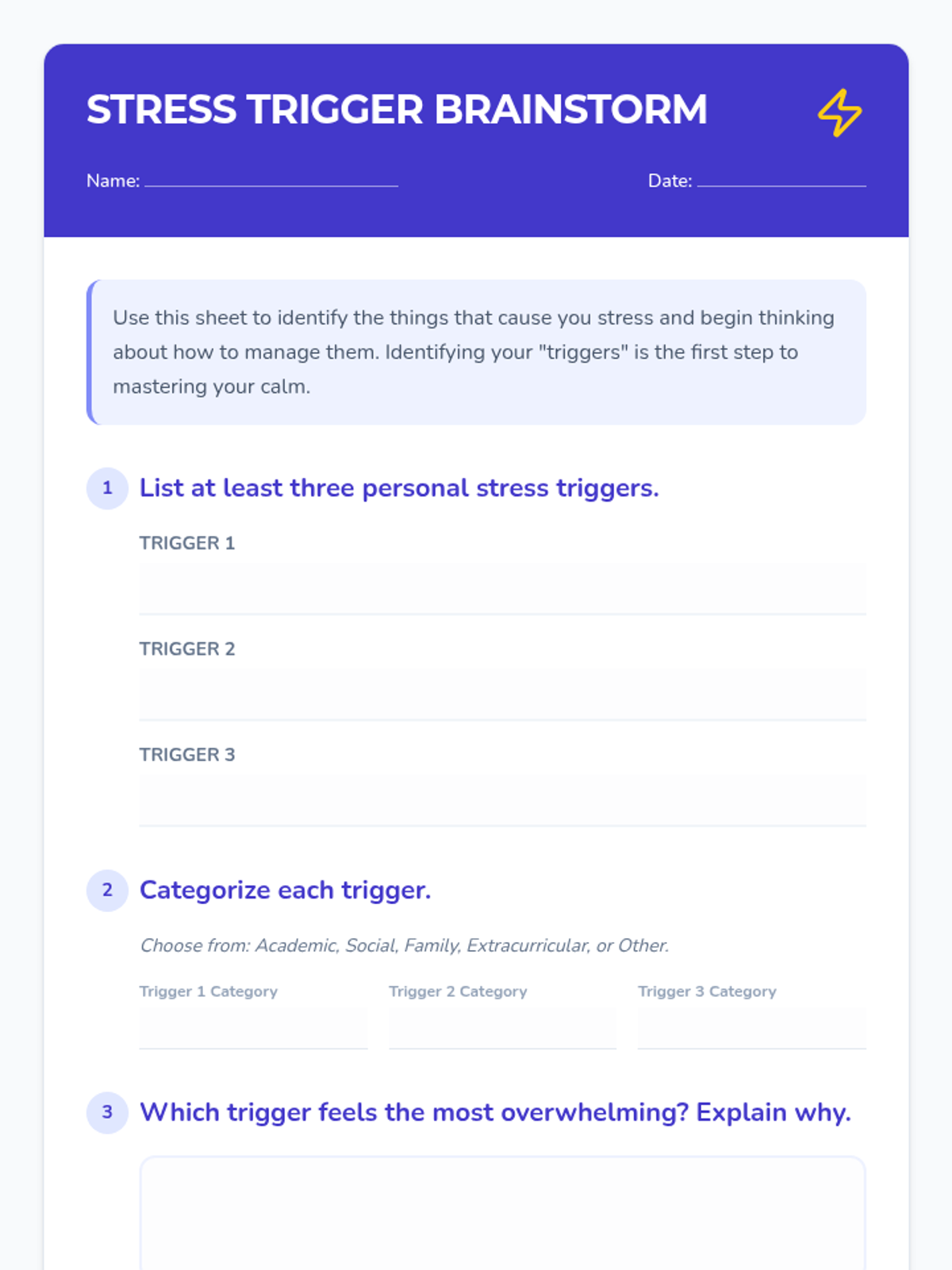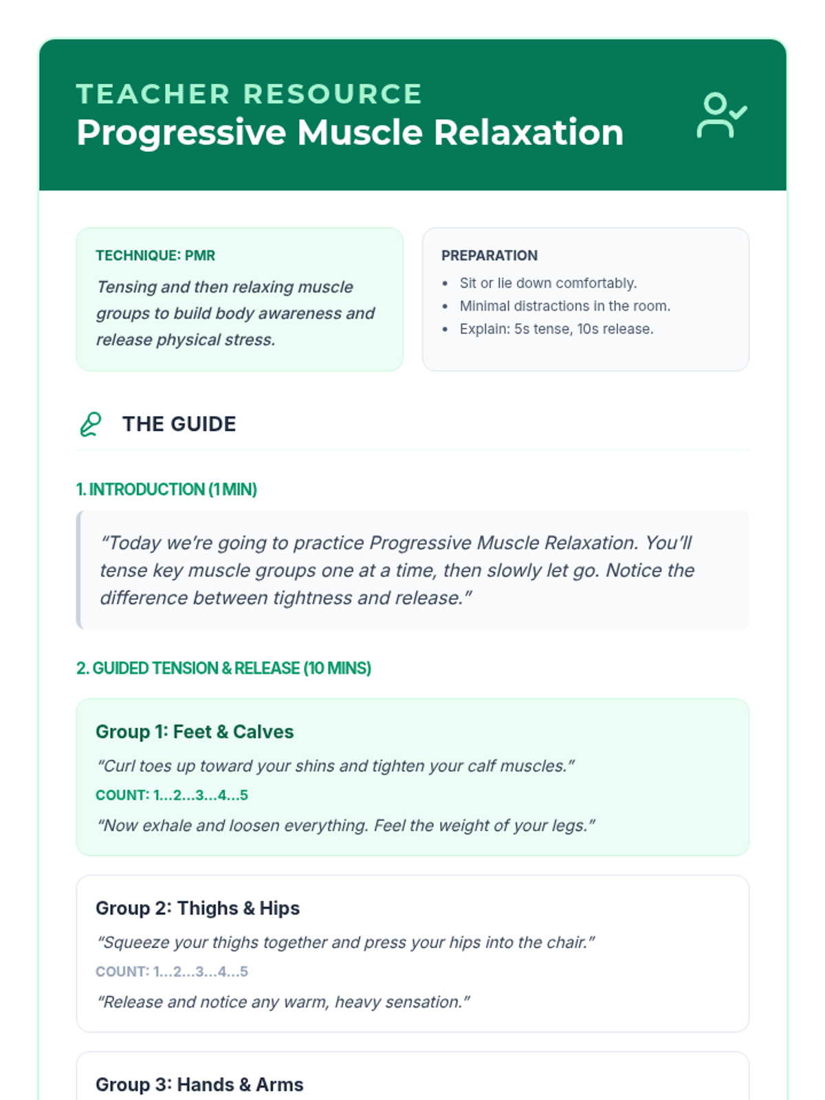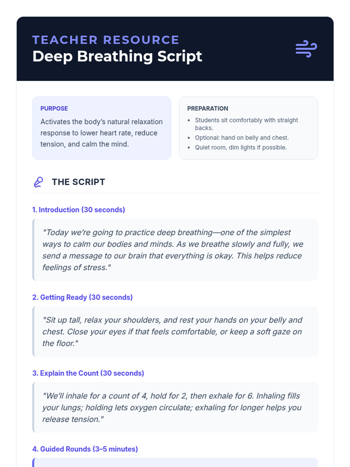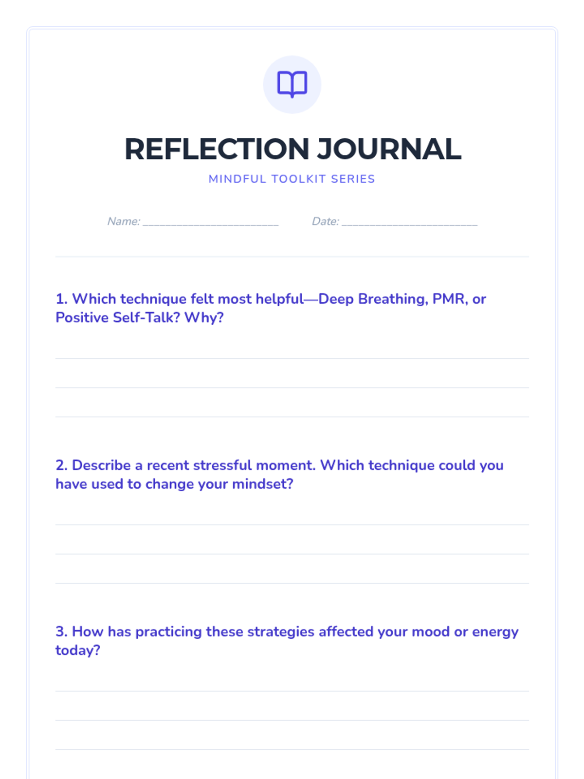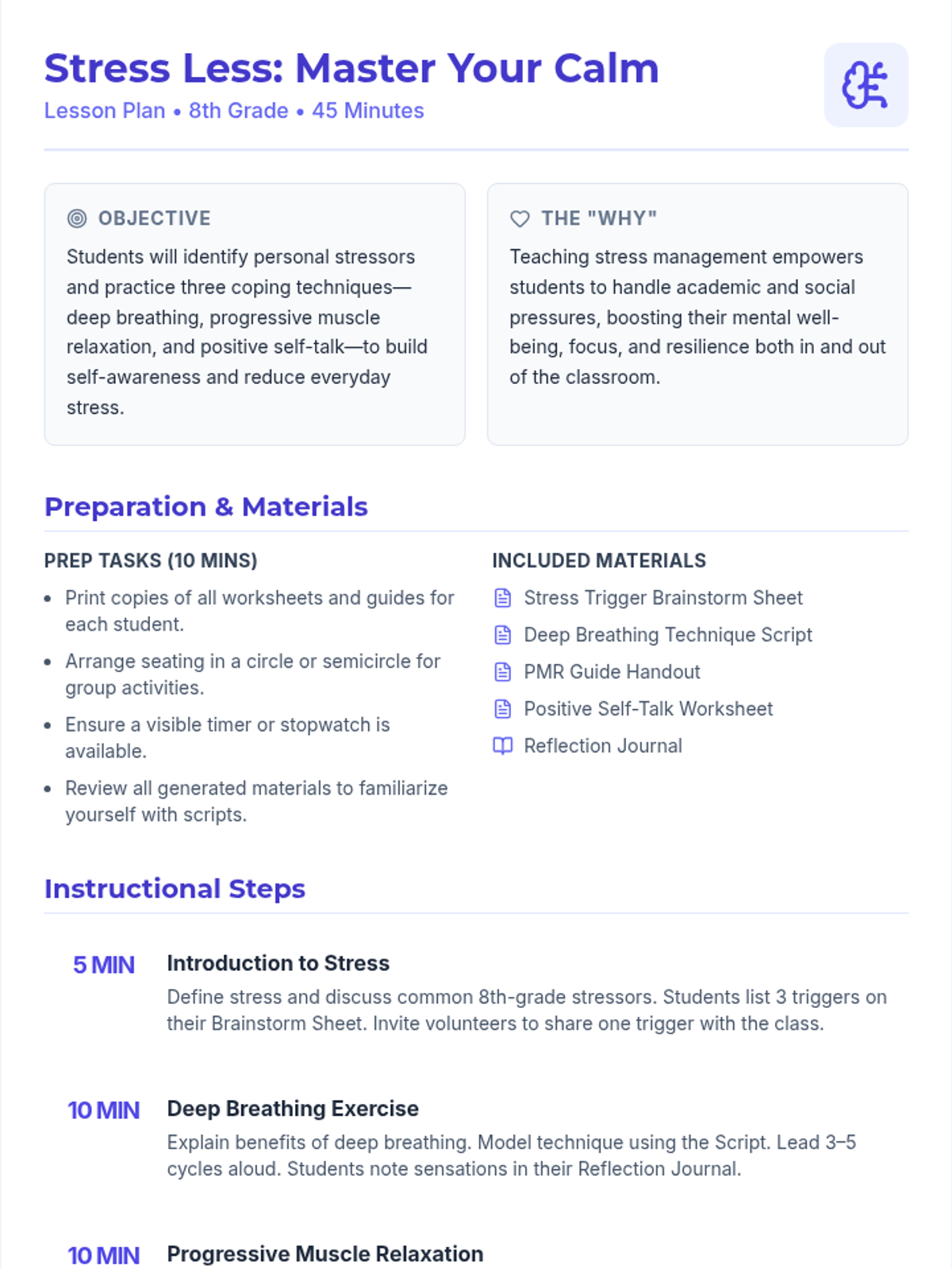 This 45-minute Tier 1 lesson helps 8th graders learn and practice practical stress management strategies like deep breathing, progressive muscle relaxation, and positive self-talk to improve well-being and academic success.