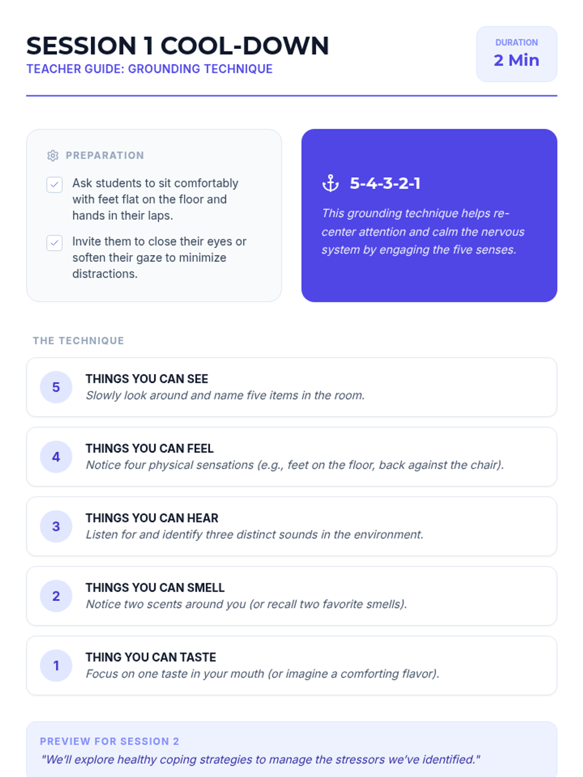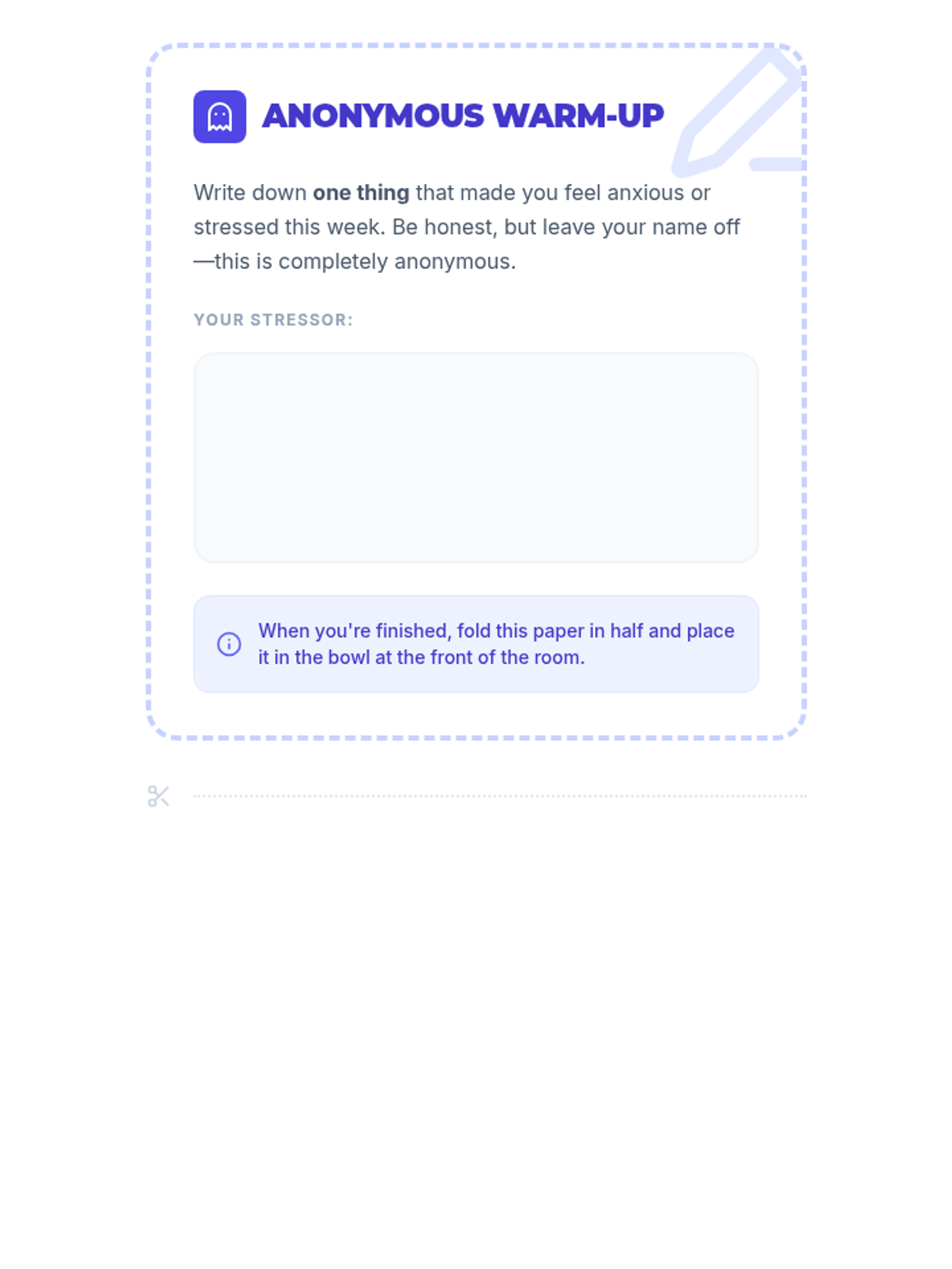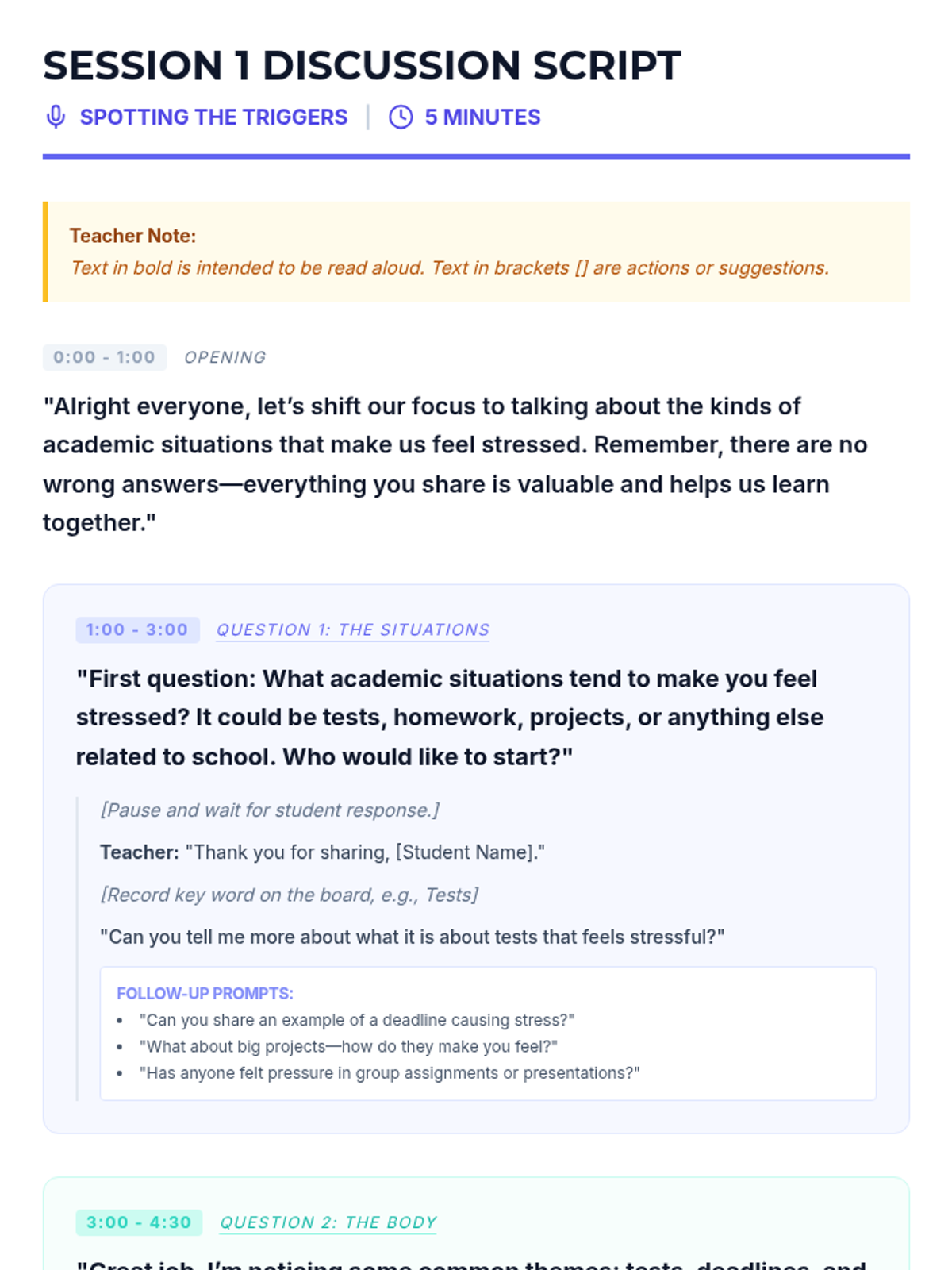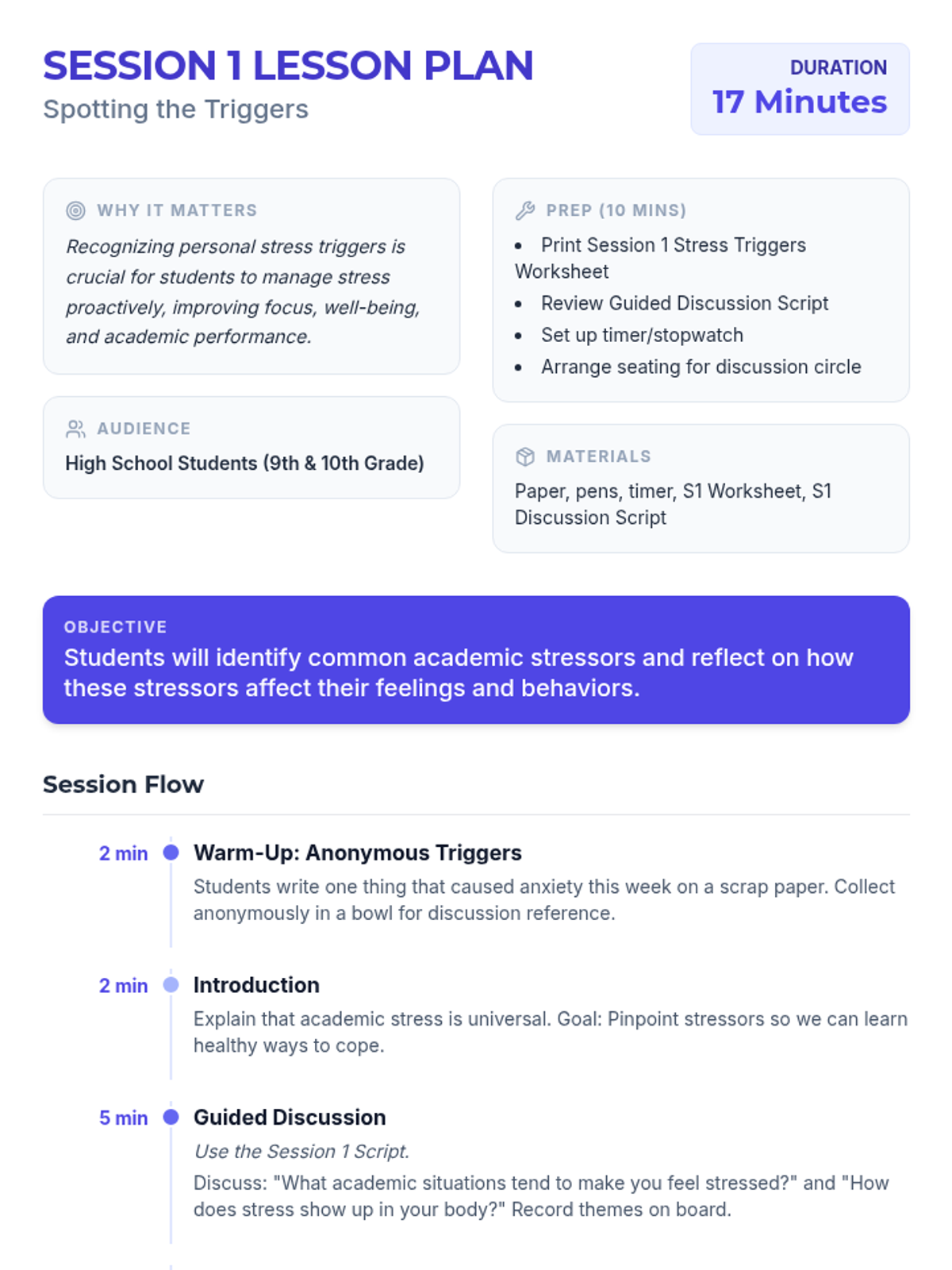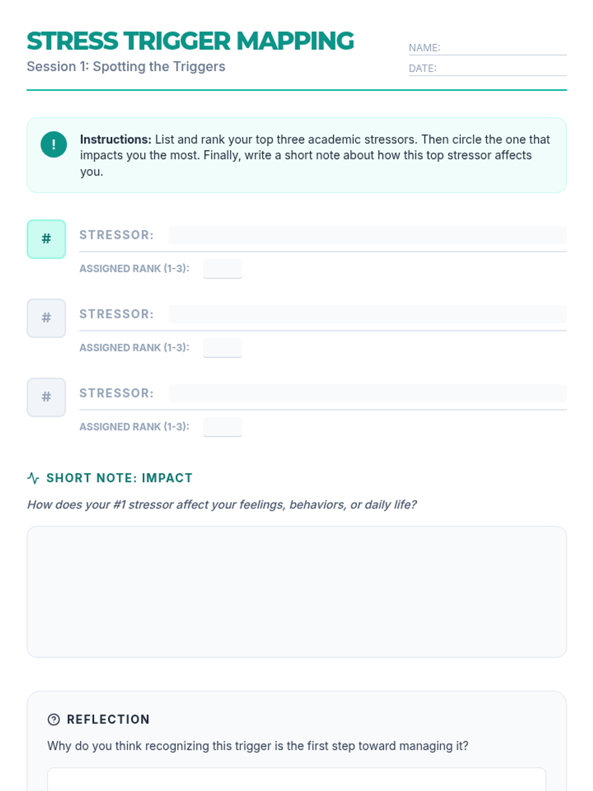 Students identify their personal academic stress triggers and observe how stress manifests physically and behaviorally.