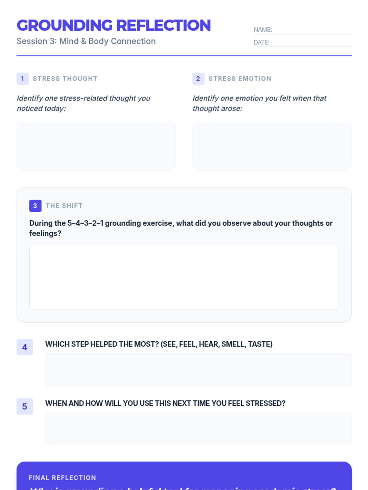 Students learn to recognize the cognitive and emotional components of stress and practice grounding techniques.